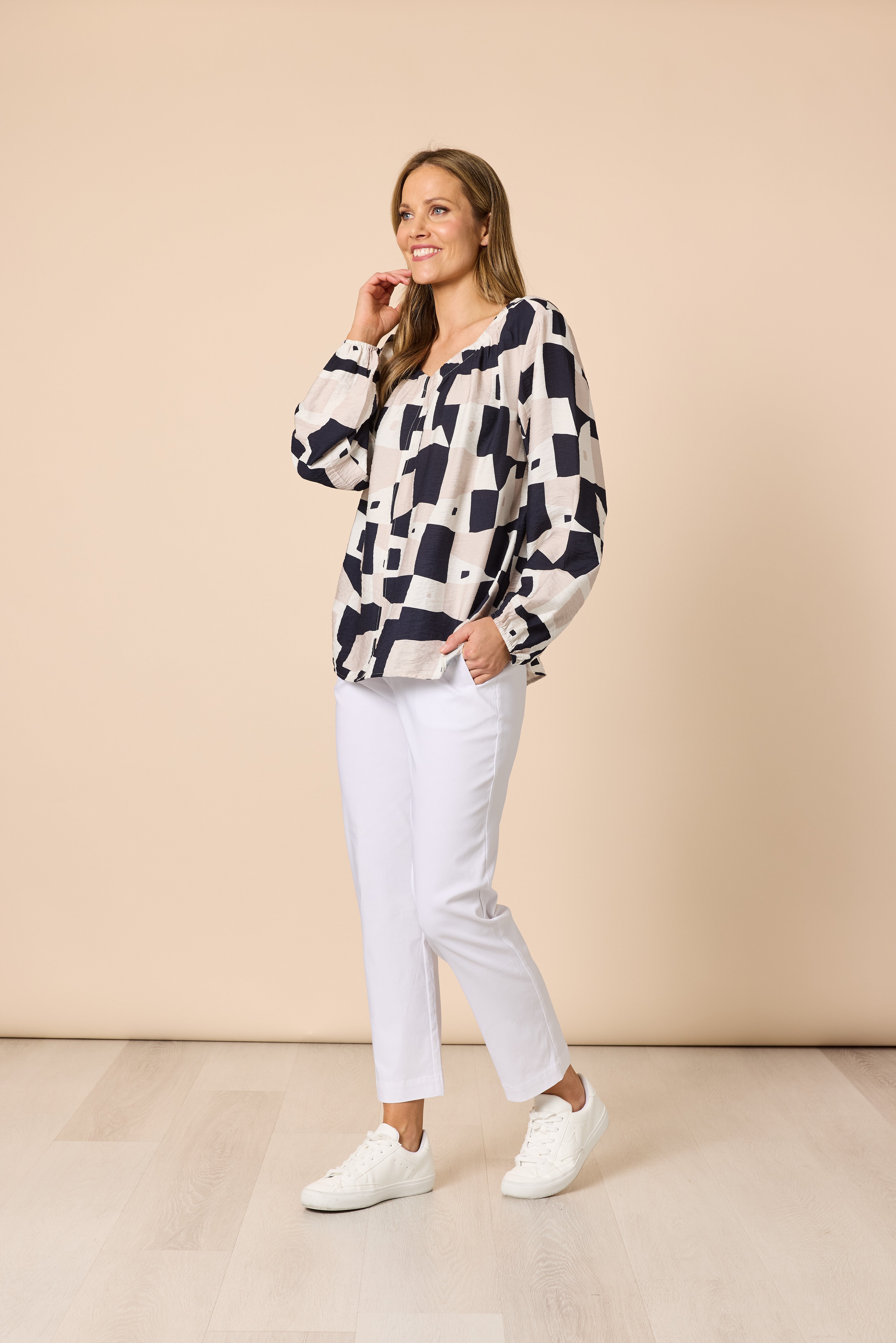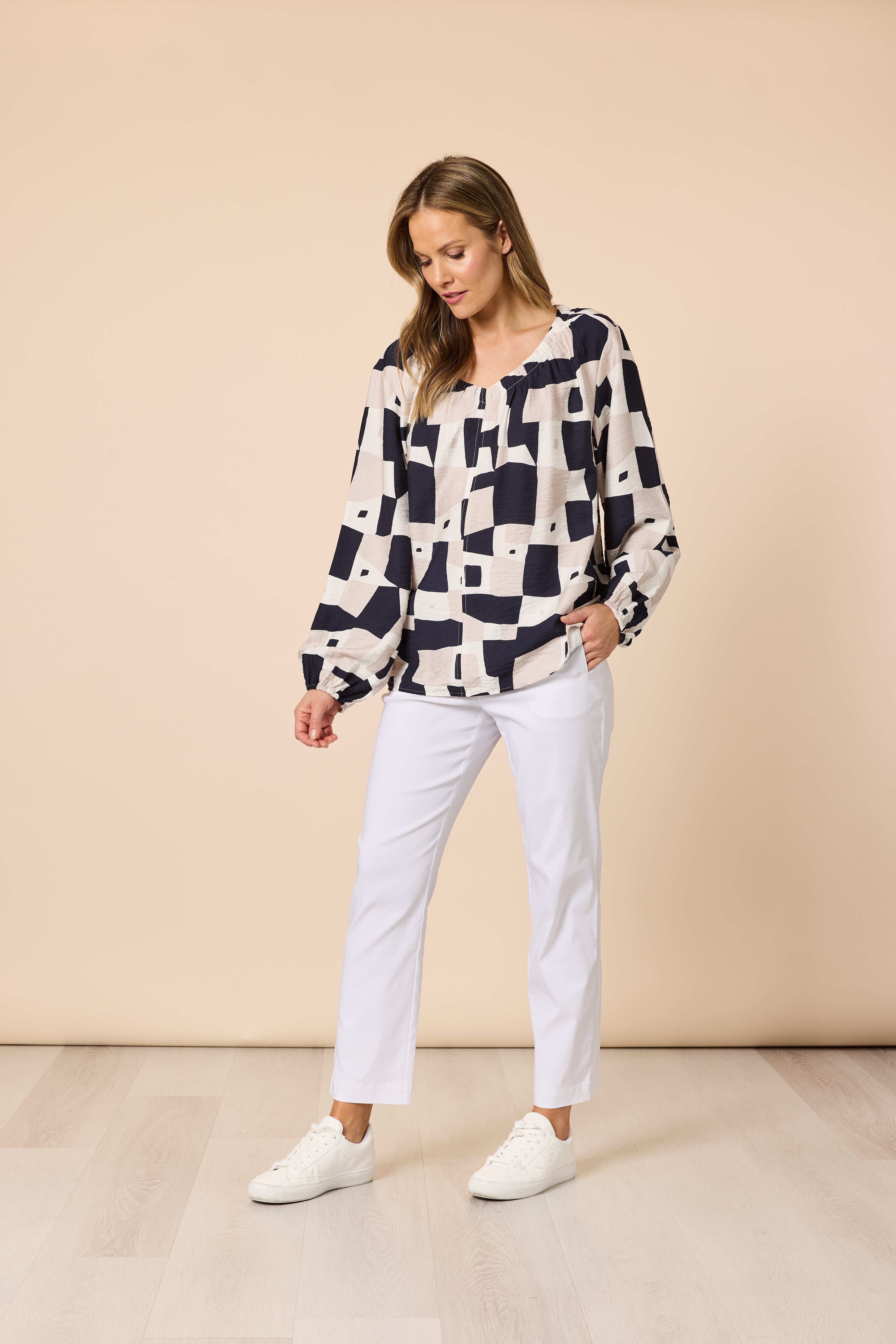 Features:• The Rive Gauche Print Top brings effortless sophistication with a modern artistic edge.• Crafted from a lightweight textured fabric, it features a bold geometric print in navy, stone, and ivory tones.• The gathered neckline and voluminous sleeves with elastic cuffs add a soft, feminine touch, while the relaxed silhouette drapes beautifully for easy everyday wear.• Perfect for pairing with the Rive Gauche Pant for a coordinated statement look, or style with simple navy separates for timeless elegance