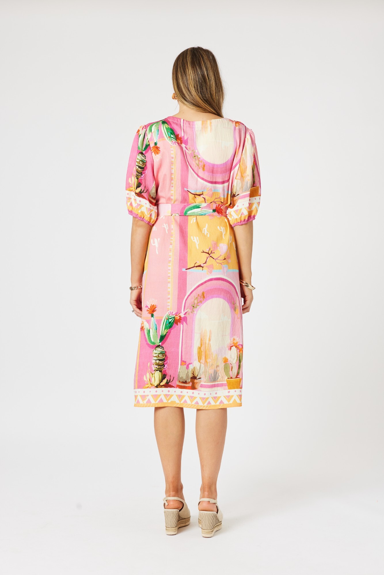 • Crafted from soft, flowing fabric, this dress showcases a vibrant print inspired by the Mexican blue skies and desert.