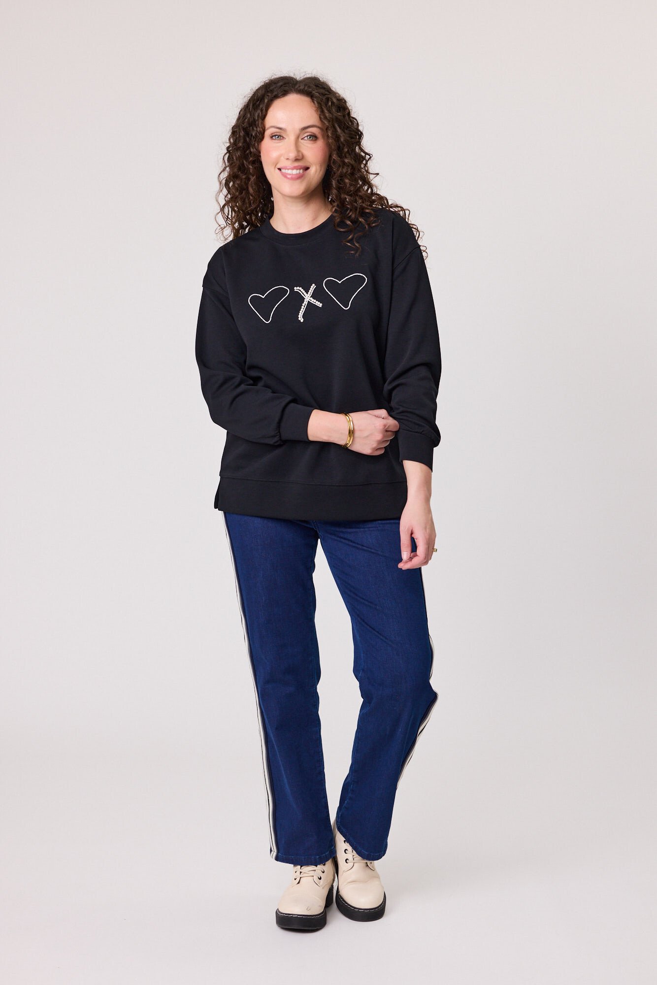 The Logo Sweatshirt is a relaxed staple with elevated detail. This crew neck style features an embroidered logo and pearl “X” accent, giving it a soft, feminine edge while still feeling casual.