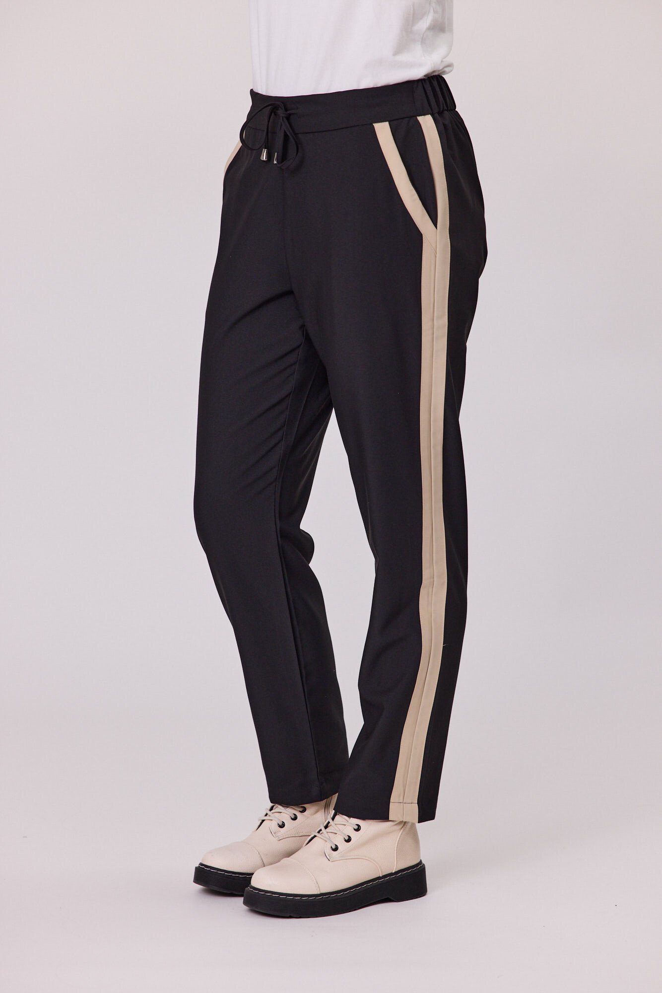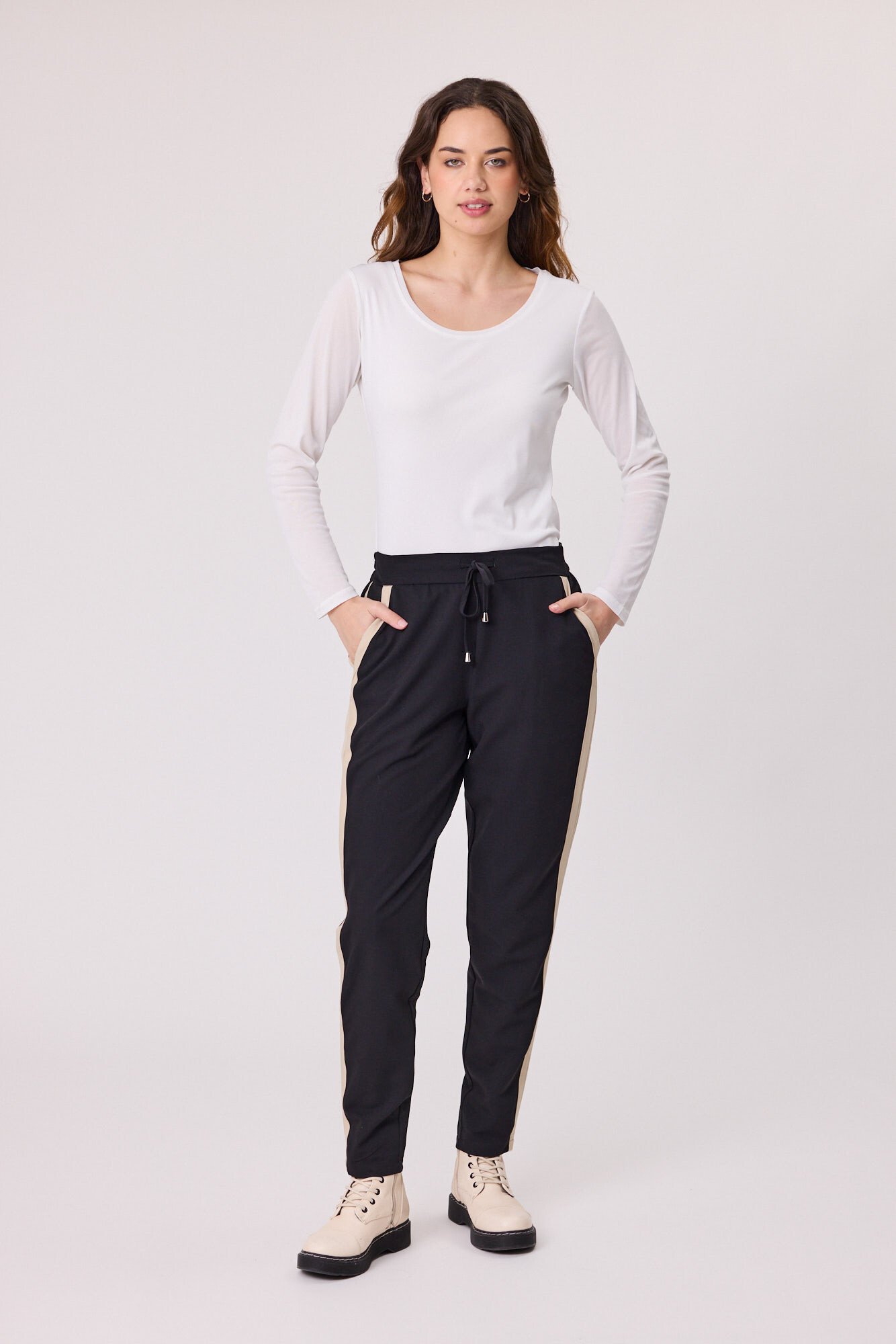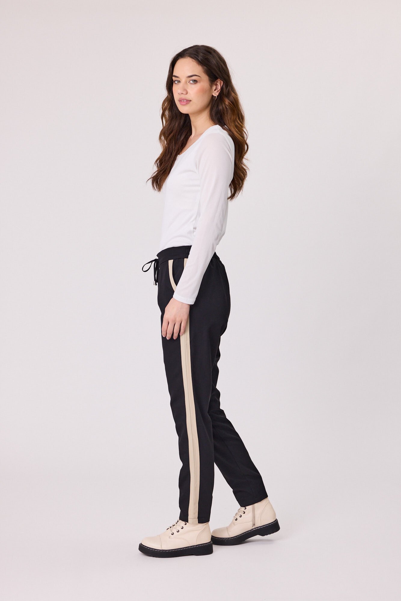 The Sloane Side Stripe Pant gives a sporty update to a classic elasticated waist pant. With side stripe detail and side pockets, it offers a relaxed, modern look that still feels tidy.