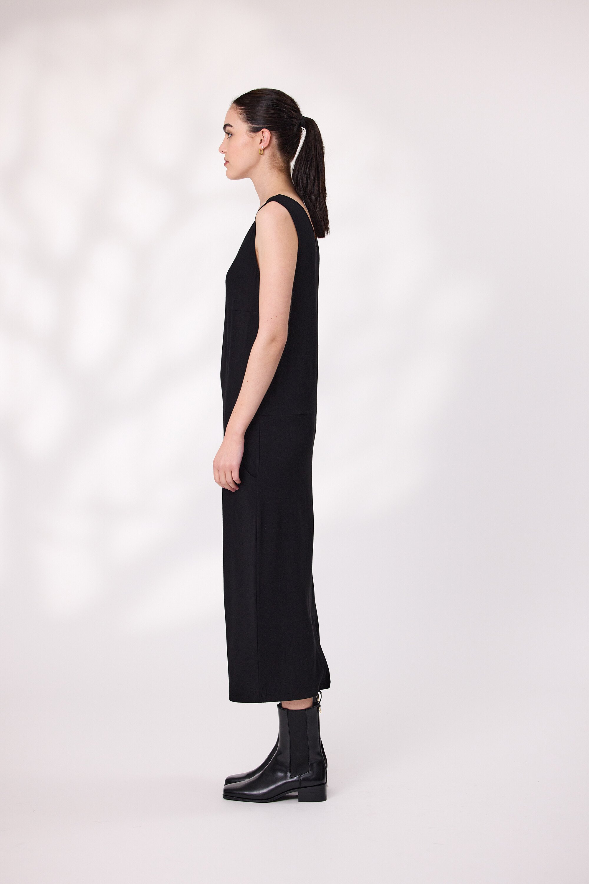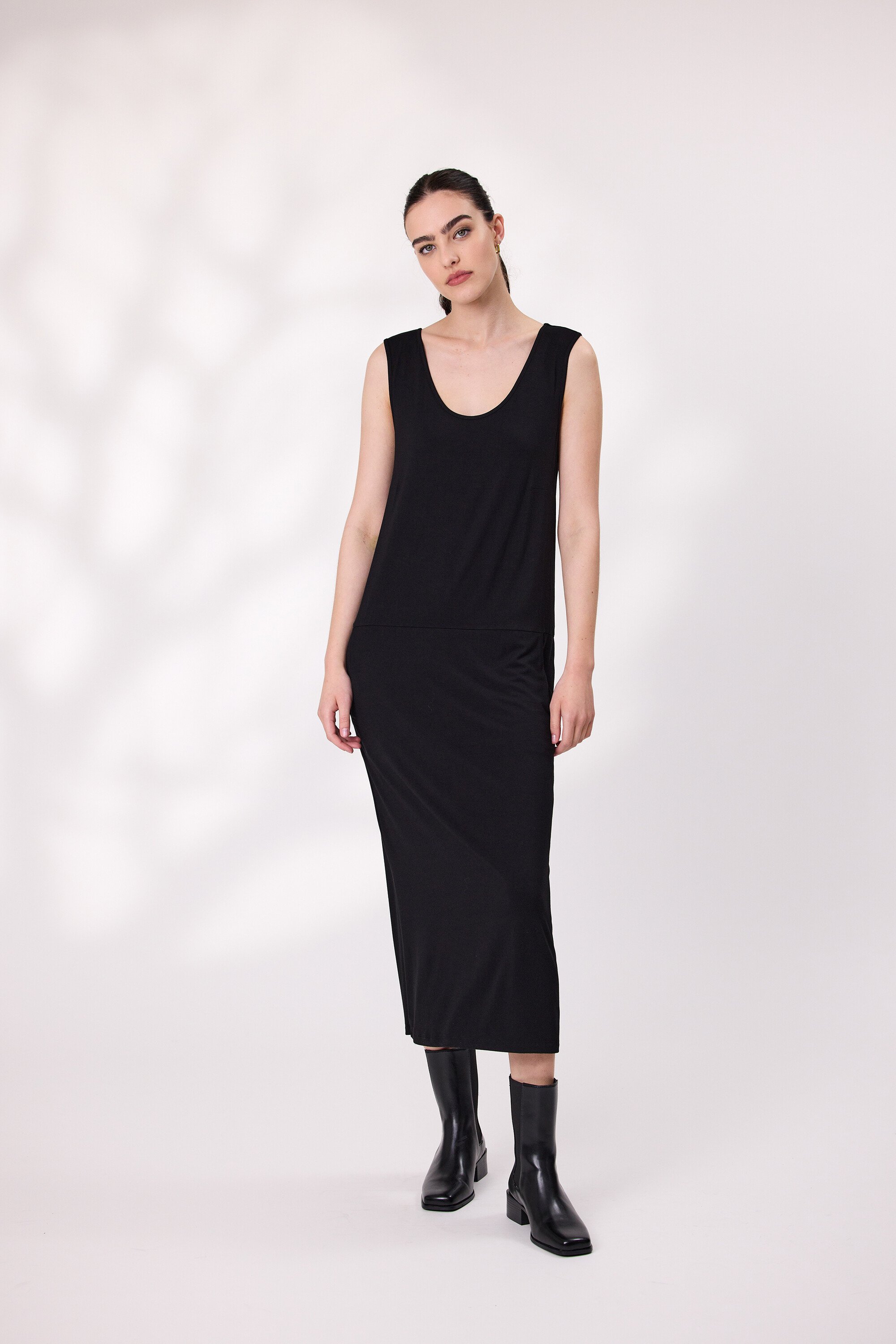 Sleek, minimal, and endlessly versatile—this sleeveless knit dress is a timeless addition to any wardrobe. Crafted in a soft black knit, it features a flattering scoop neckline and a long, ankle-grazing silhouette that moves with ease. 95% Viscose 5% Elastane