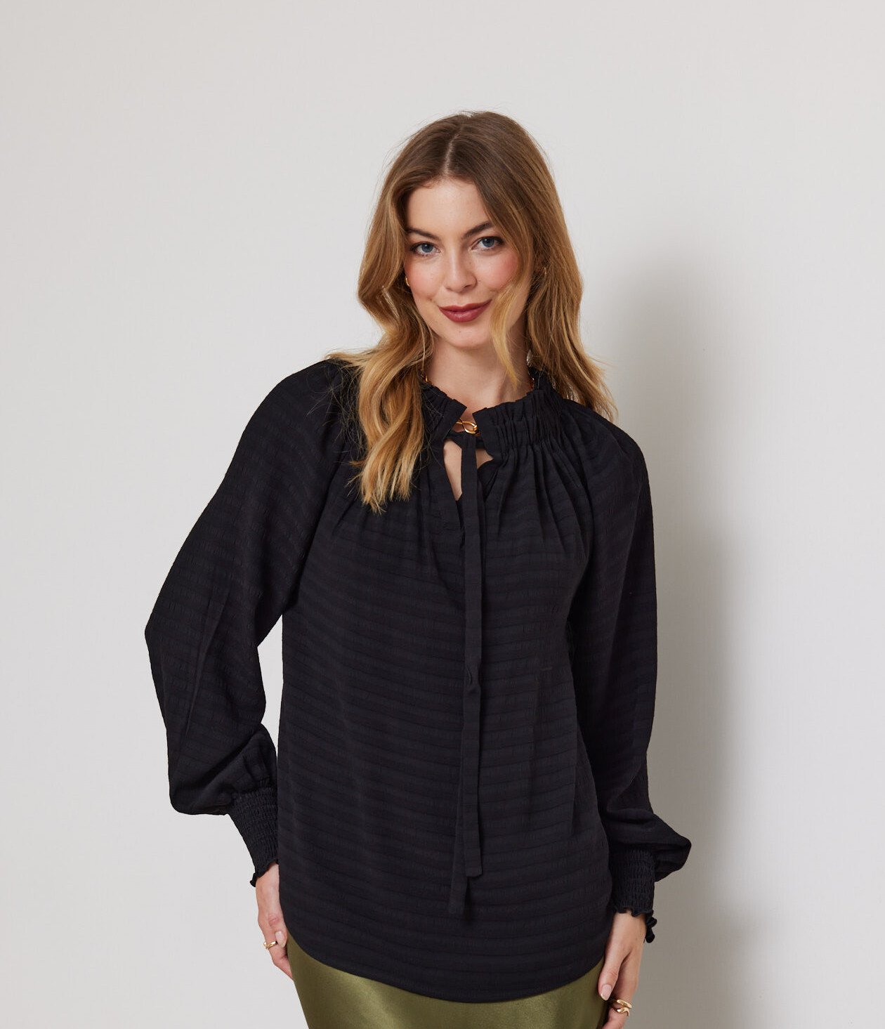 Raglan long sleeves top with shirred gathering at neck & self fabric ties. The sleeves feature rows of elasticated cuffs.
