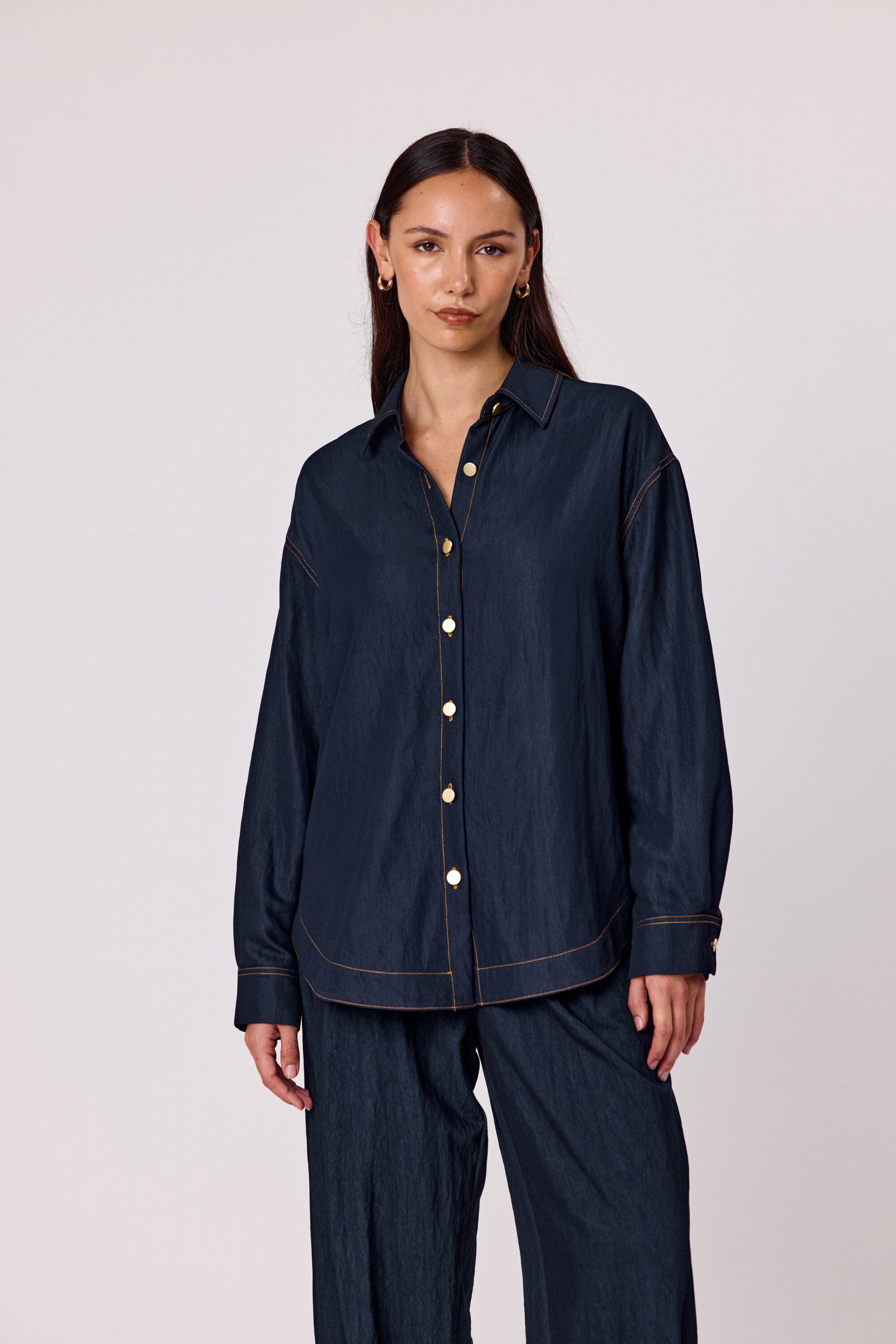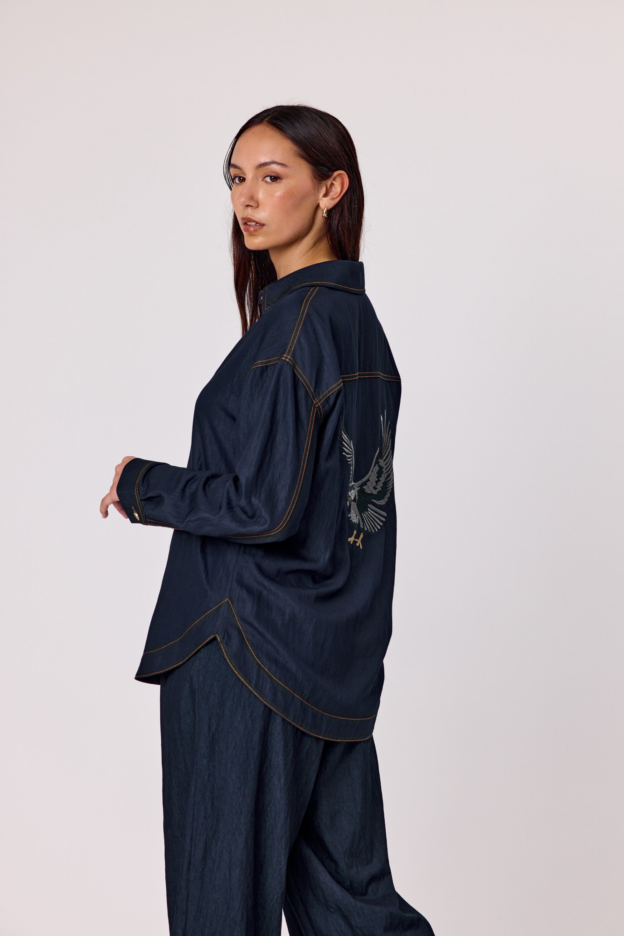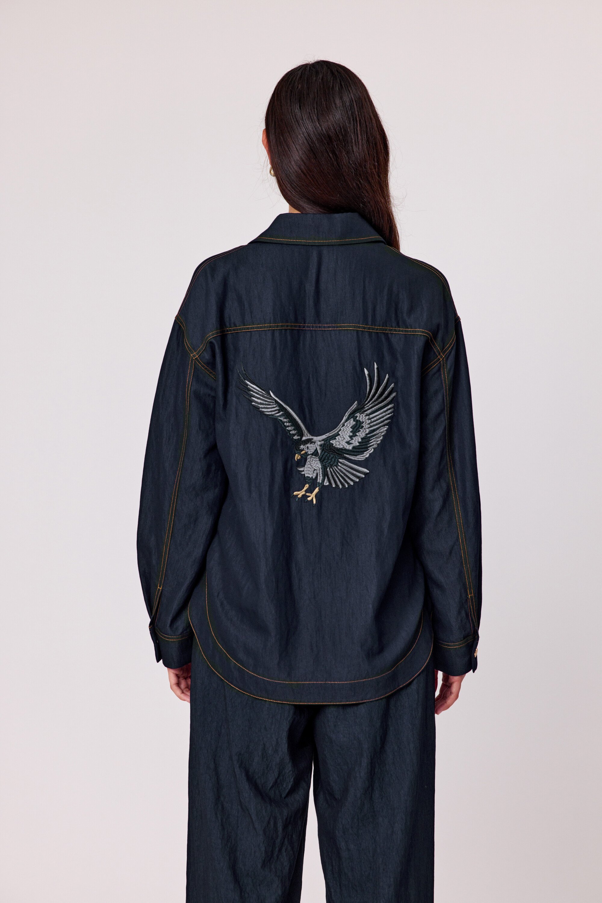 Add a touch of personality to your wardrobe with this indigo long-sleeved shirt, featuring a classic button-up front, structured collar, and standout back embroidery that brings a unique twist to a timeless style. Crafted from a sturdy, denim-look fabric and with embroidered detail on the back that adds just the right amount of flair. 53% Viscose 47% Nylon