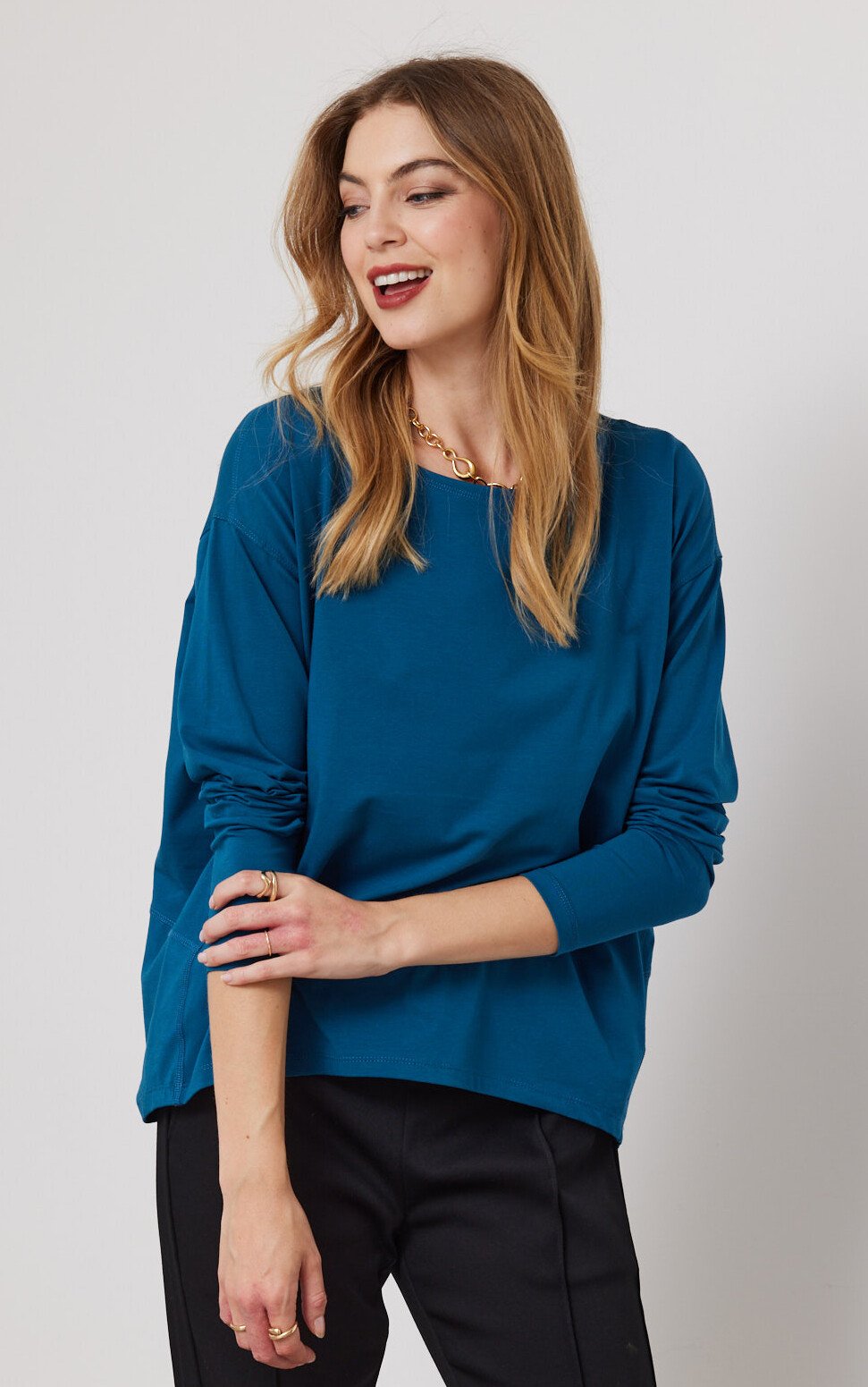 Boat neck drop shoulder plain long sleeves top. High-low curved hem finished.