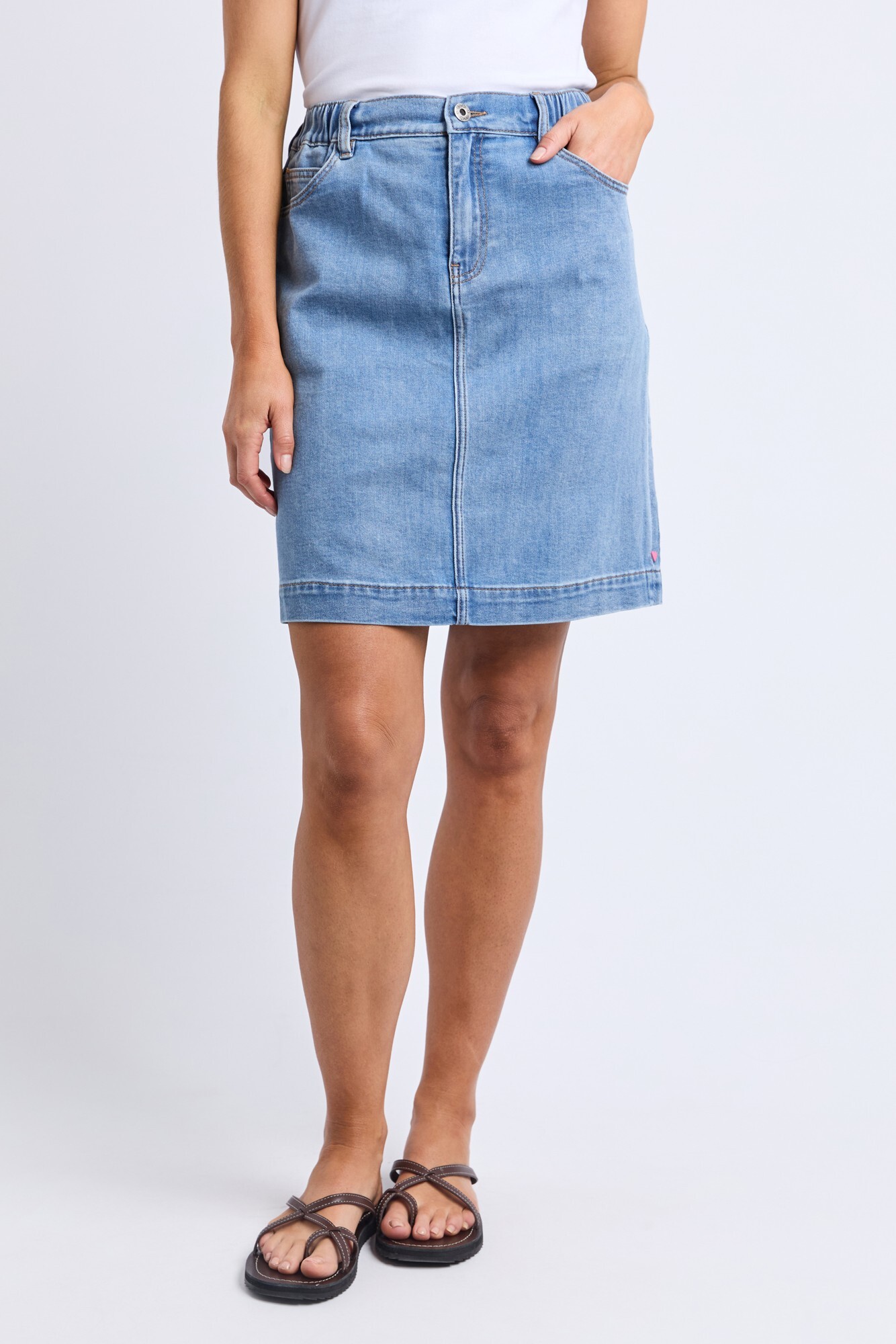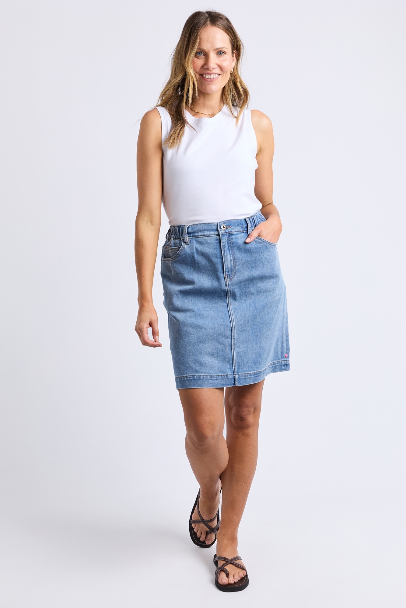 Hello Birdie! For those that can't do without a little denim skirt, this one's for you! With a comfort plus elastic waist, this knee length stretch denim skirt is so easy to pair back with everything in your wardrobe and we guarantee will be worn on repeat.