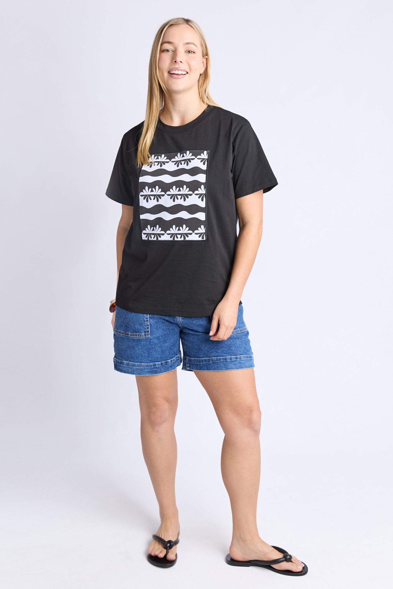 Meet Casa, a stunning black & cream print exclusive to Elm. The new Casa Tee features a stunning graphic designed by our talented Elm Designers and is a statement tee that will pair perfectly with your favourite denim or upstyle with a pair of black shorts for a put together Spring Summer look! 100% Cotton