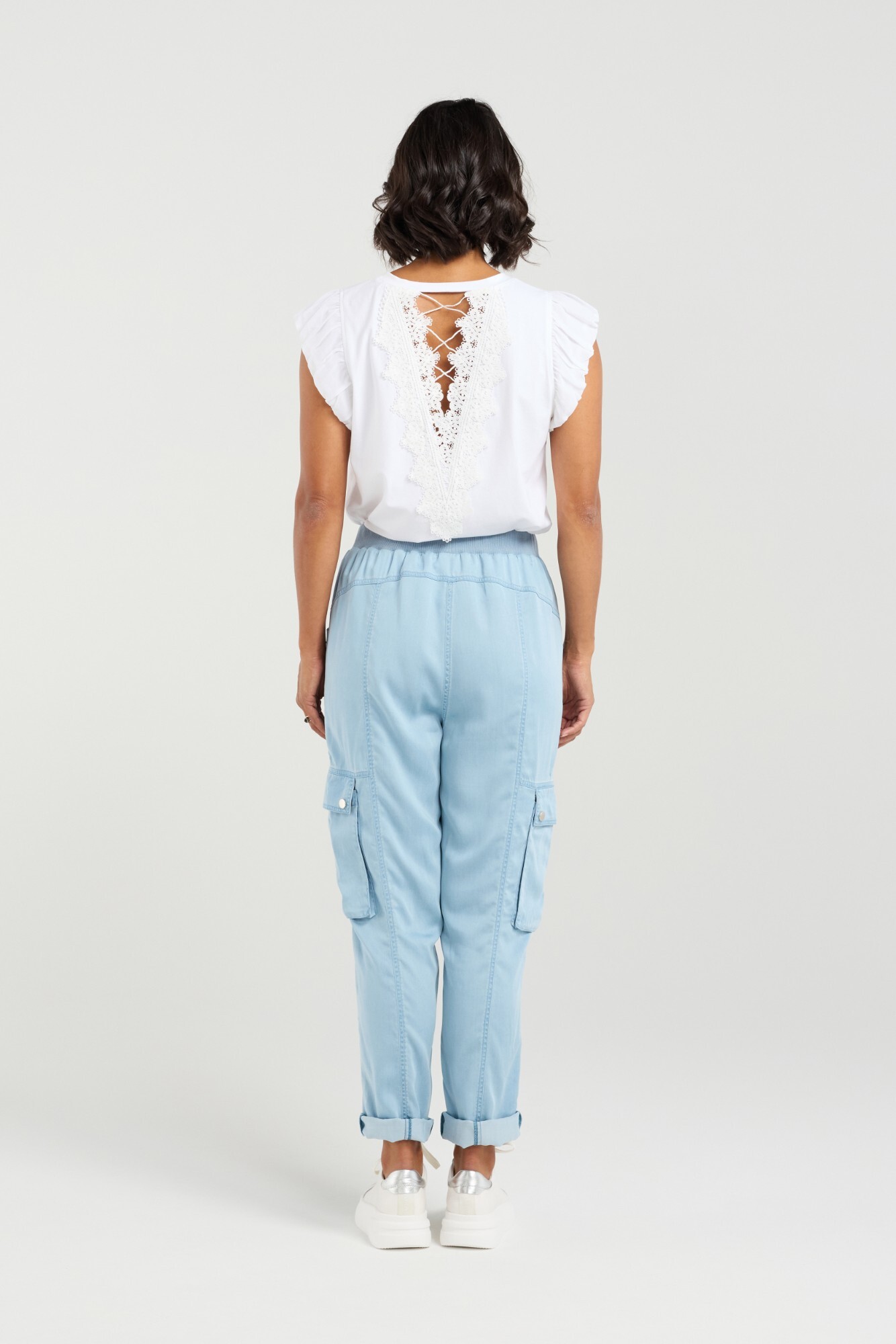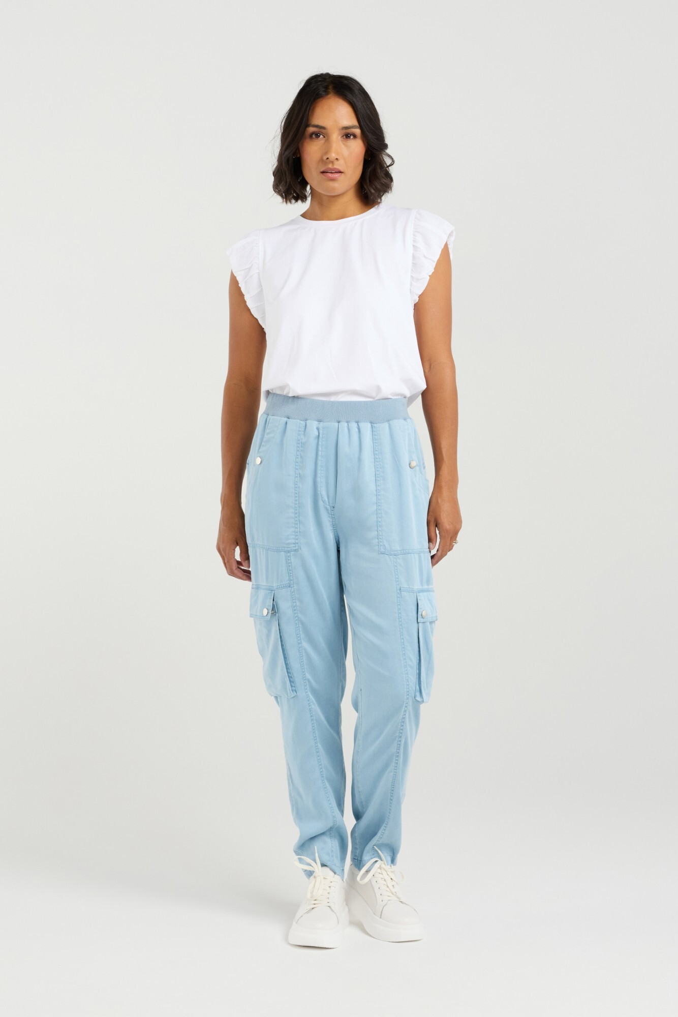 With a nod to a the traditions of the cargo pant, the Carter Cargo Pant can truly be dressed up or down.  Featuring the utility pockets and hardware of the cargo style and a higher cut waist line for a flattering fit, these pants are sure to be on high repeat.  The relaxed tapered leg line is perfect for wearing with dressy shoes, or pair back with sneakers for a modern look.  100% Tencel