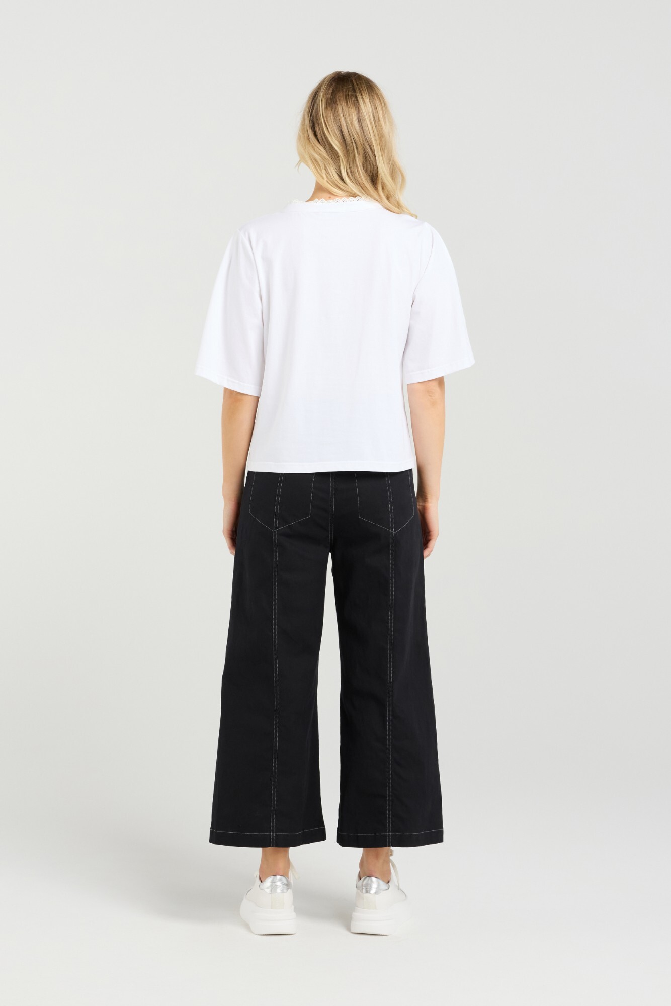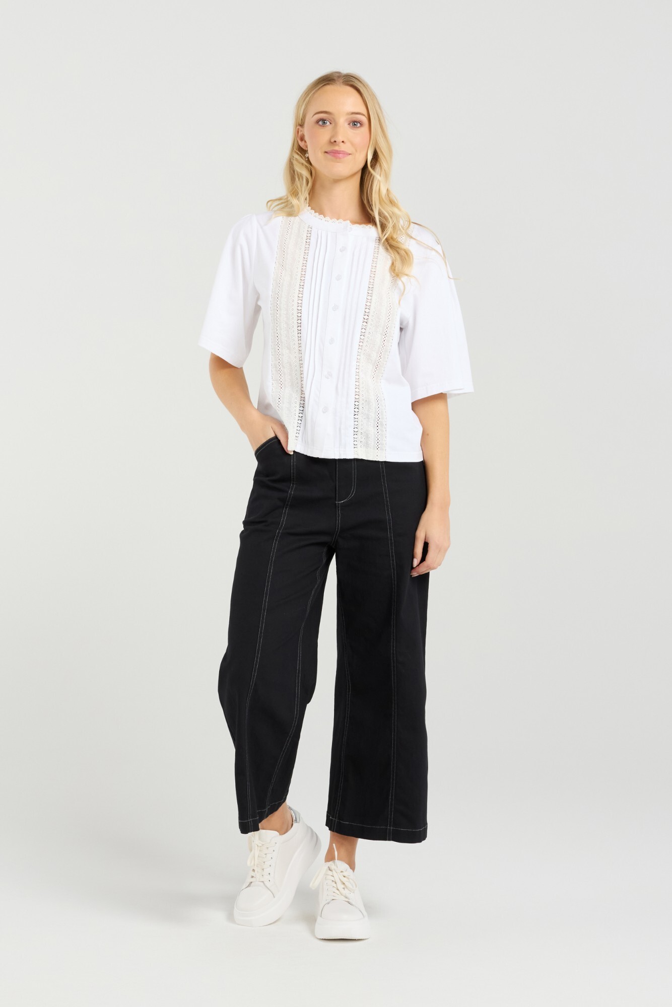 Sweet with a hint of edge, this short-sleeved button-down top features delicate lace panels that add a touch of romance to a classic silhouette. Lightweight and airy, it’s perfect for warm days when you want to keep it polished but playful. Pair it with jeans, skirts, or layered under a jacket—this one’s all about effortless charm. 95% Cotton5% Spx