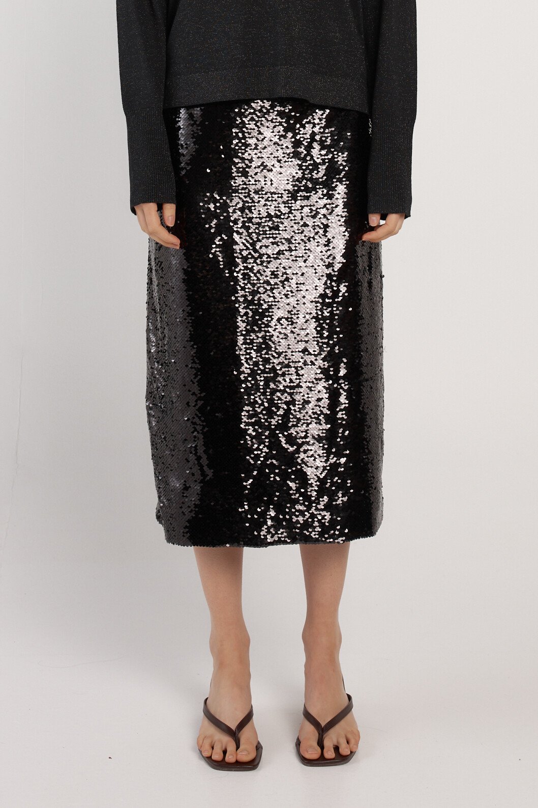 The Monroe Sequin Pencil Skirt delivers sleek, elevated glamour. Cut in a streamlined midi silhouette, it skims the body with polished precision. Fully lined for comfort, the all-over embellishment creates subtle movement. A sophisticated trans-seasonal piece designed for refined evenings.