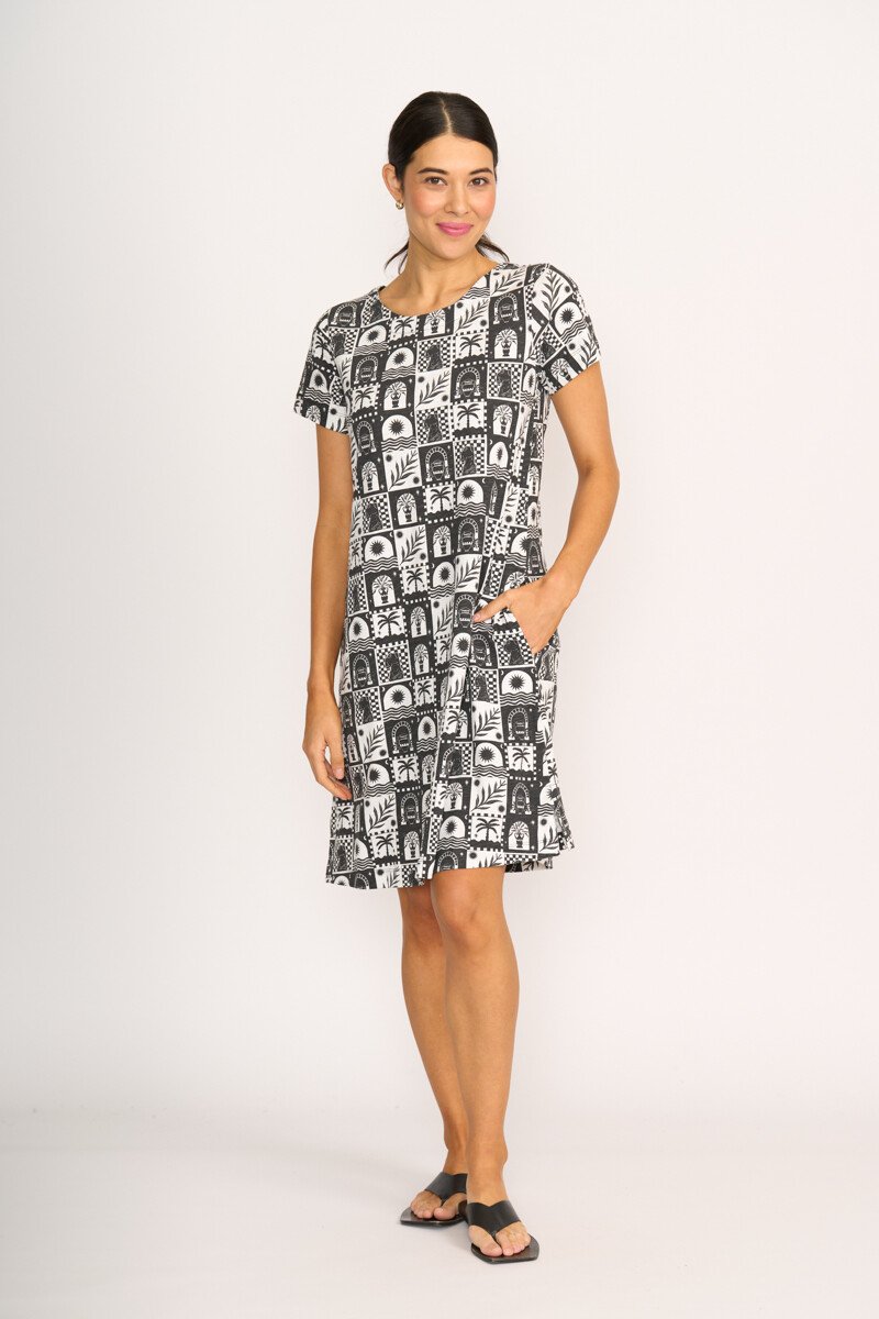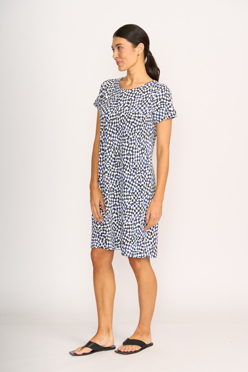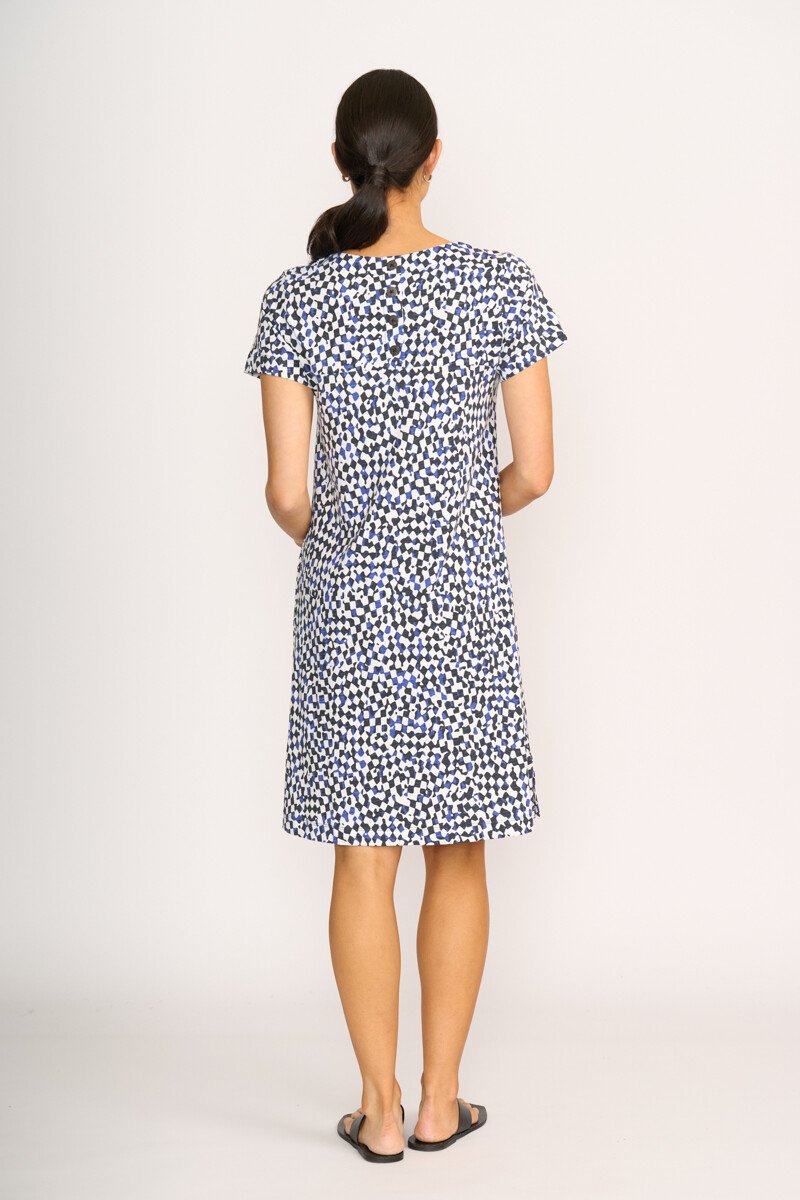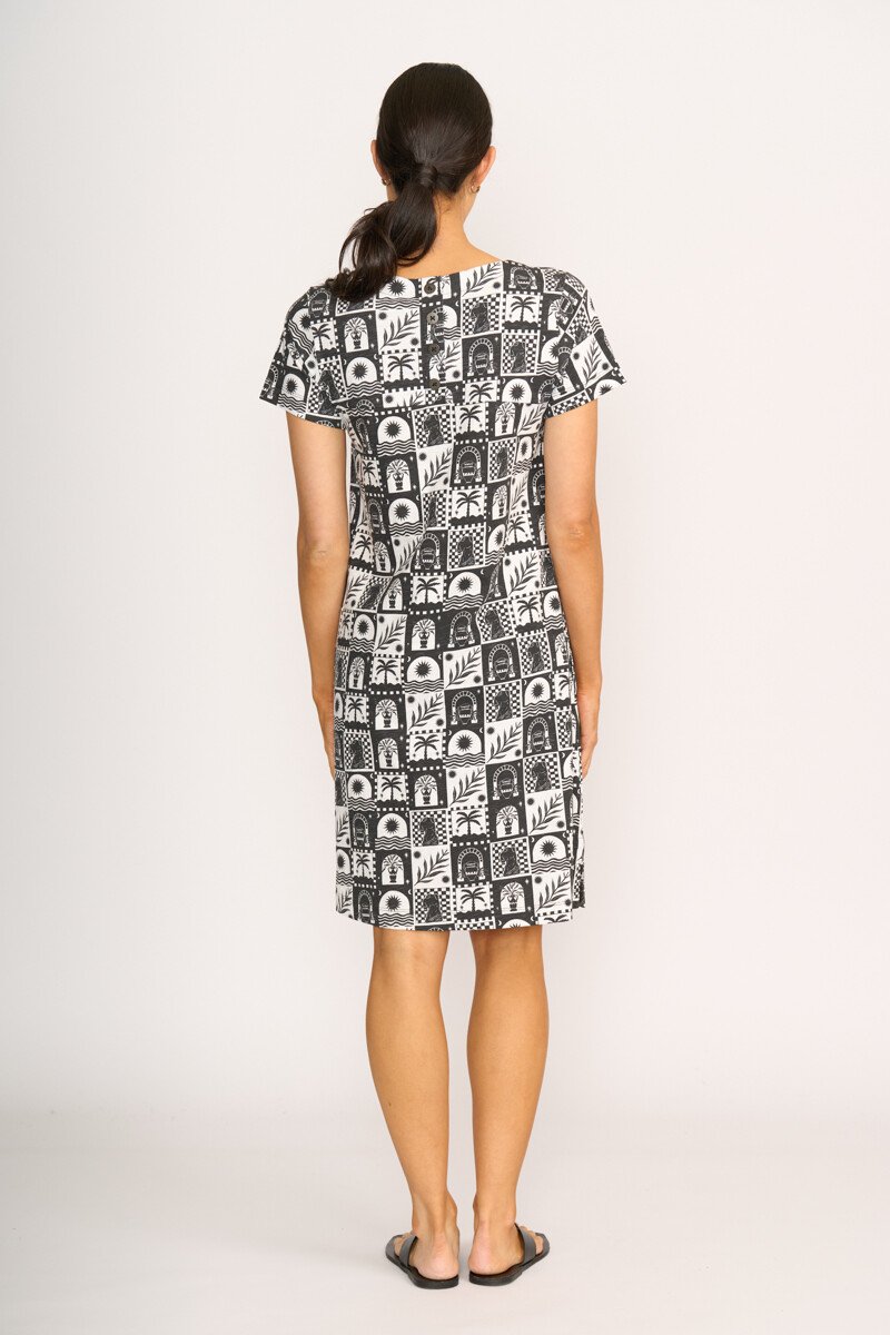 The captain's choice dress! A shift dress with scoop neck & short sleeves. Featuring a centre back placket. Side seam pockets.