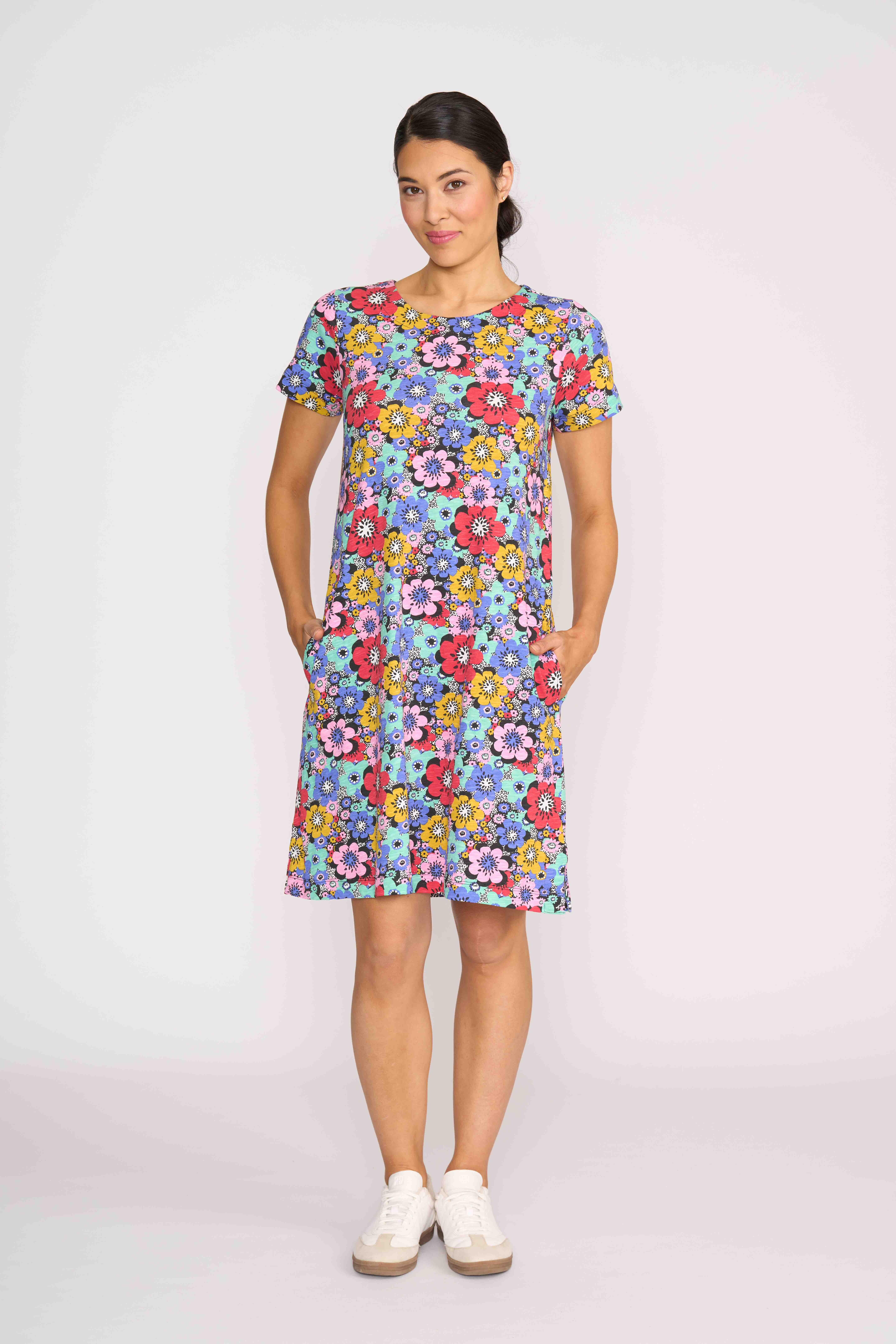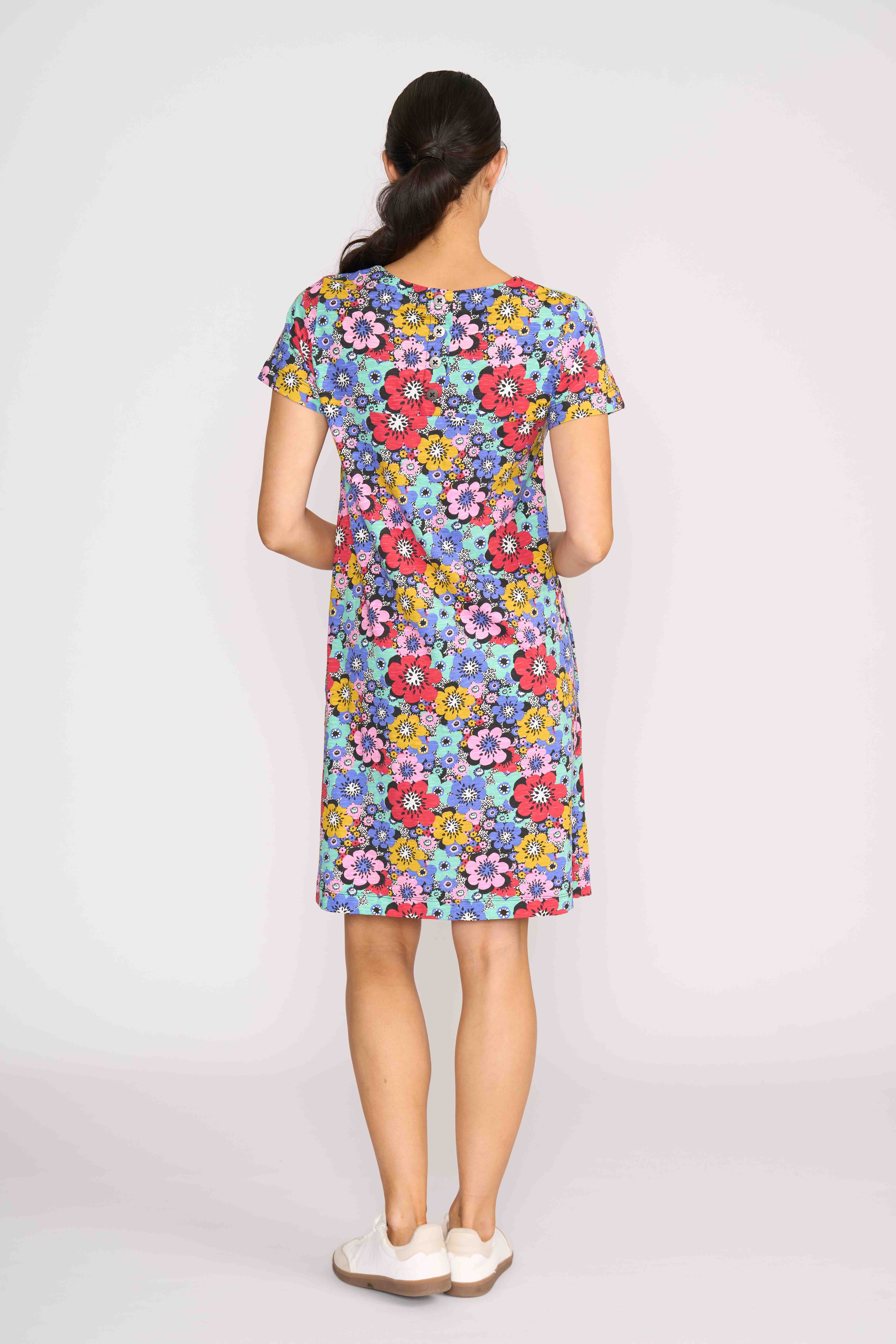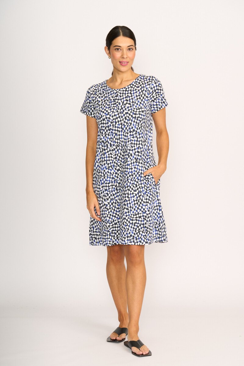 The captain's choice dress! A shift dress with scoop neck & short sleeves. Featuring a centre back placket. Side seam pockets.