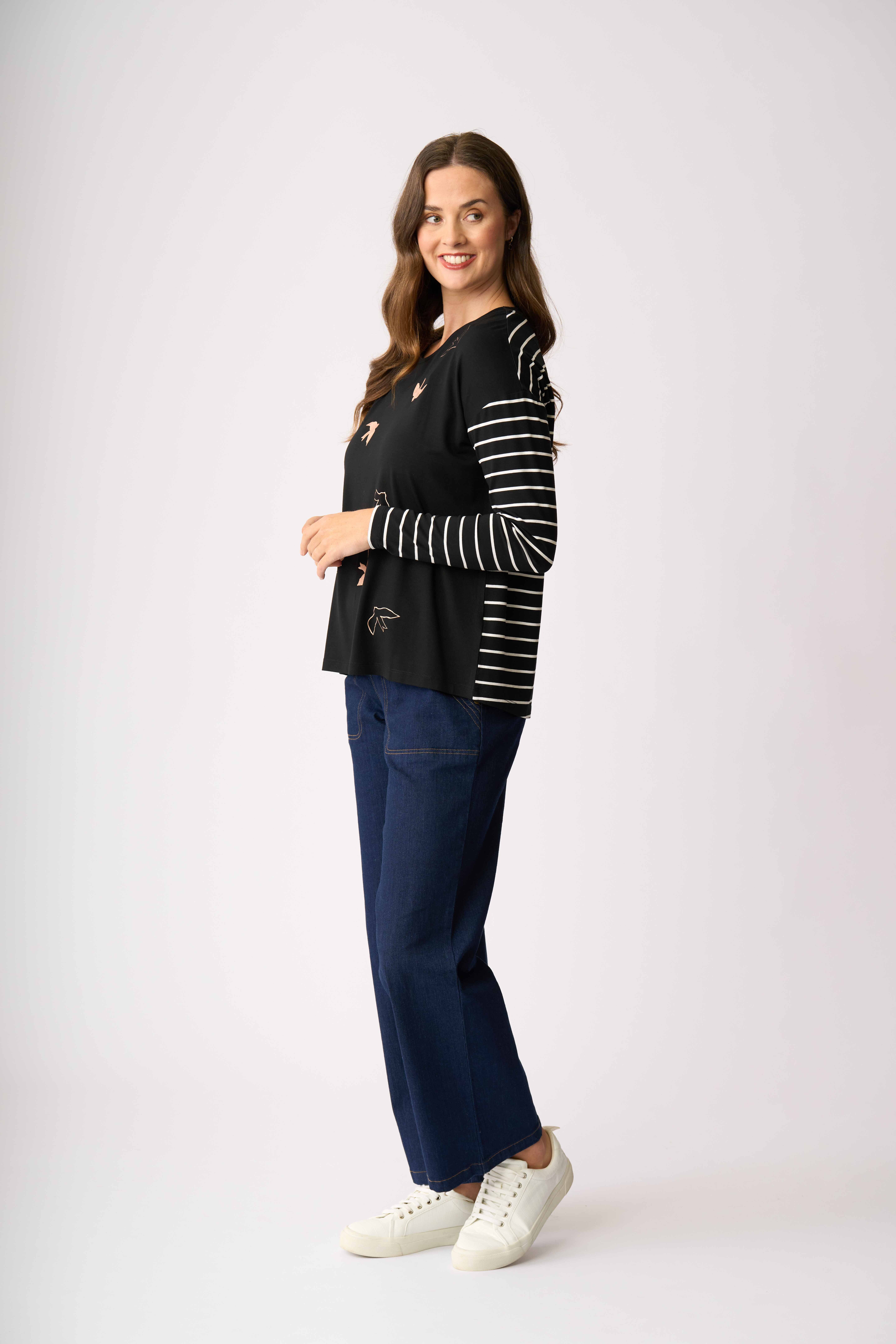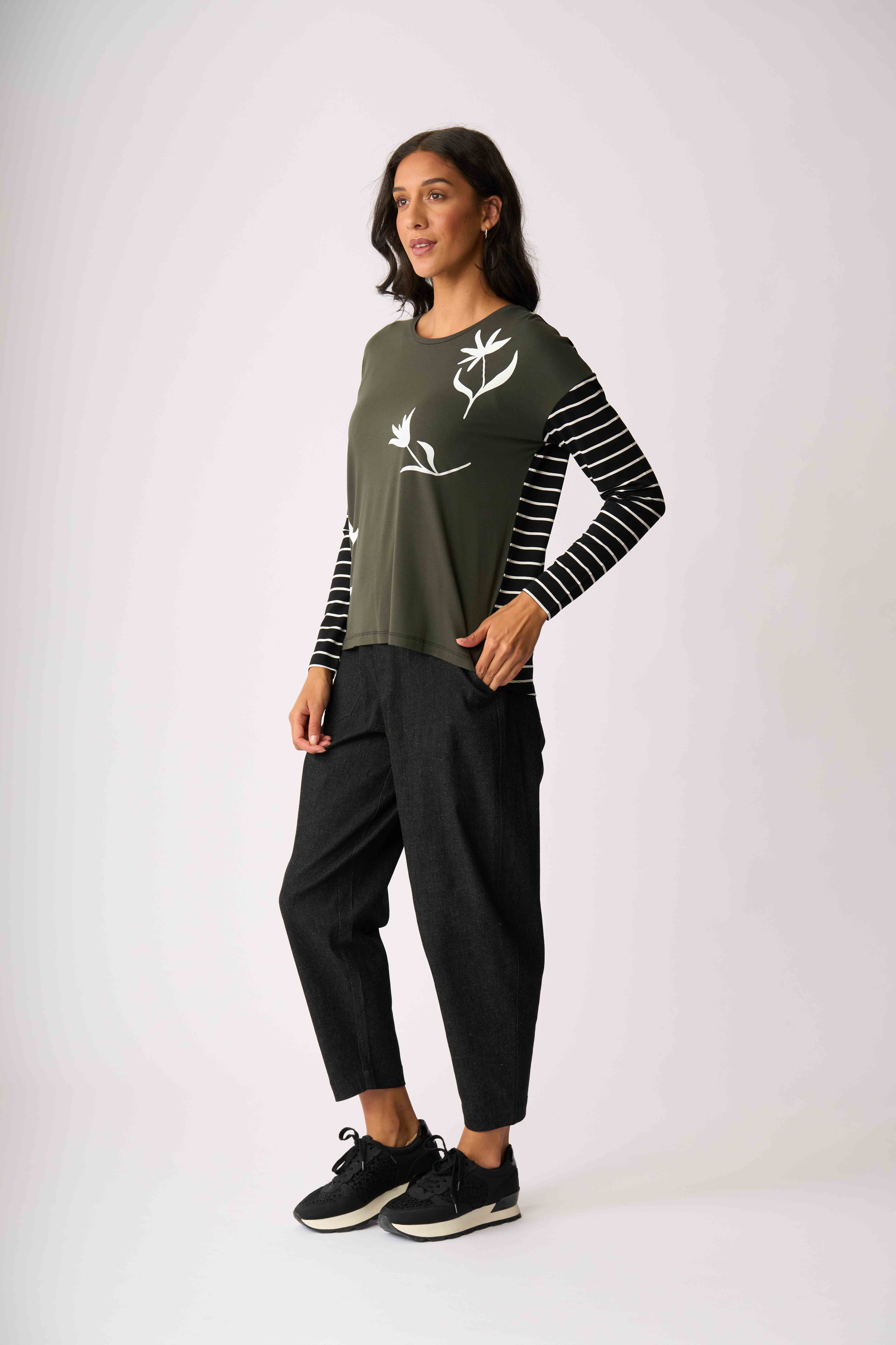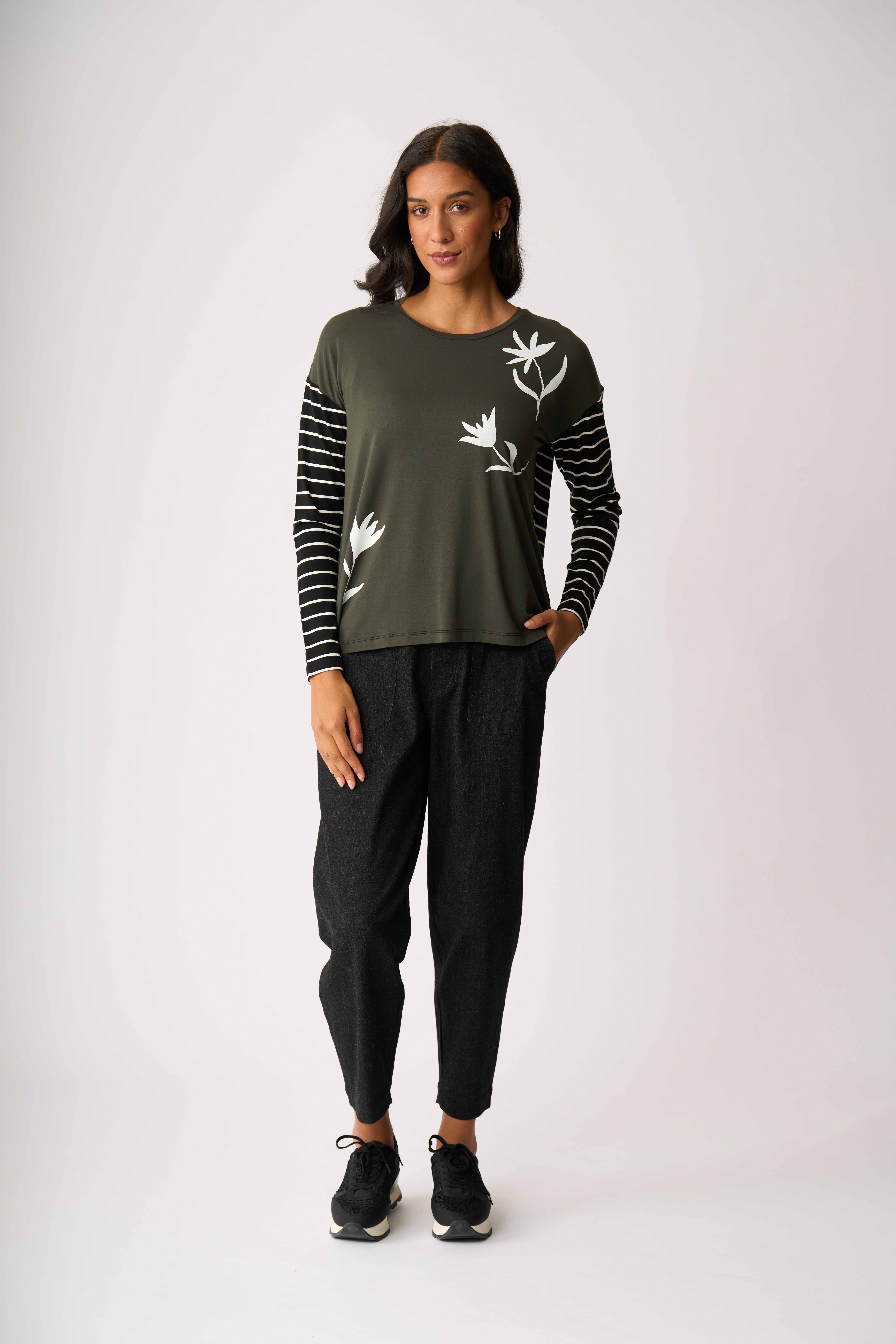 Contrasting plain with stripe & placement print