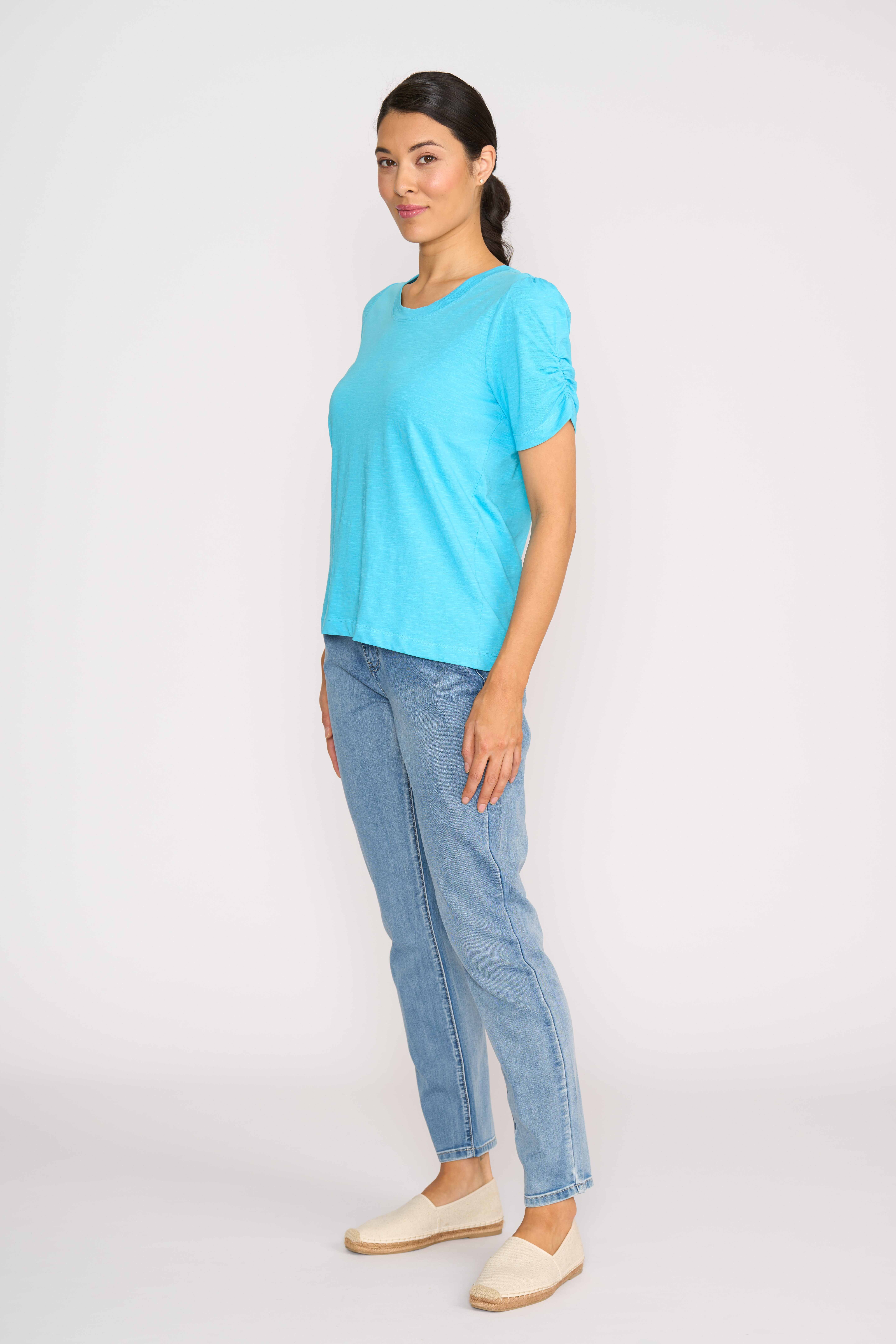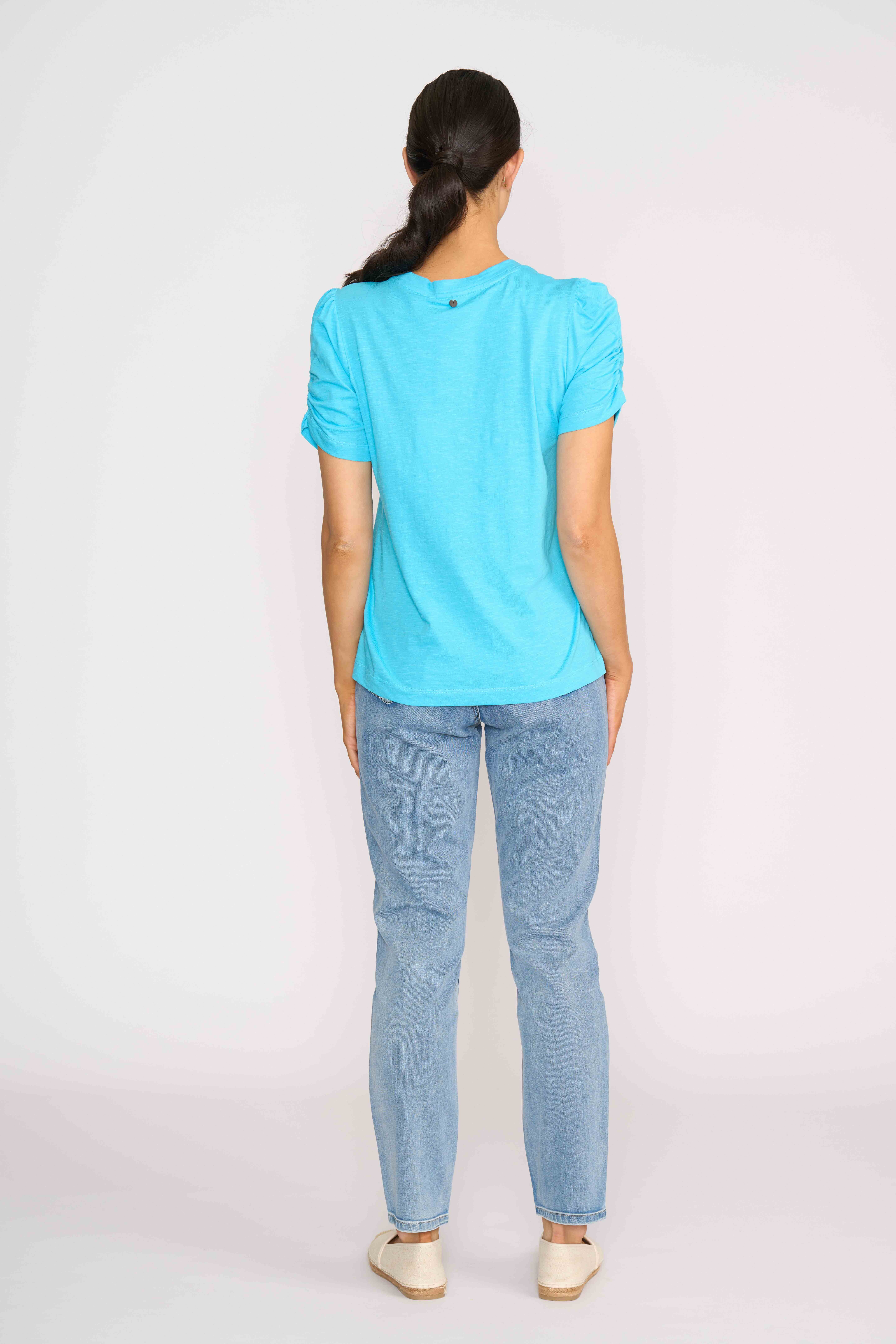 The moulin rouche tee! A neat fit t-shirt with ruched sleeves. Scoop neckline.