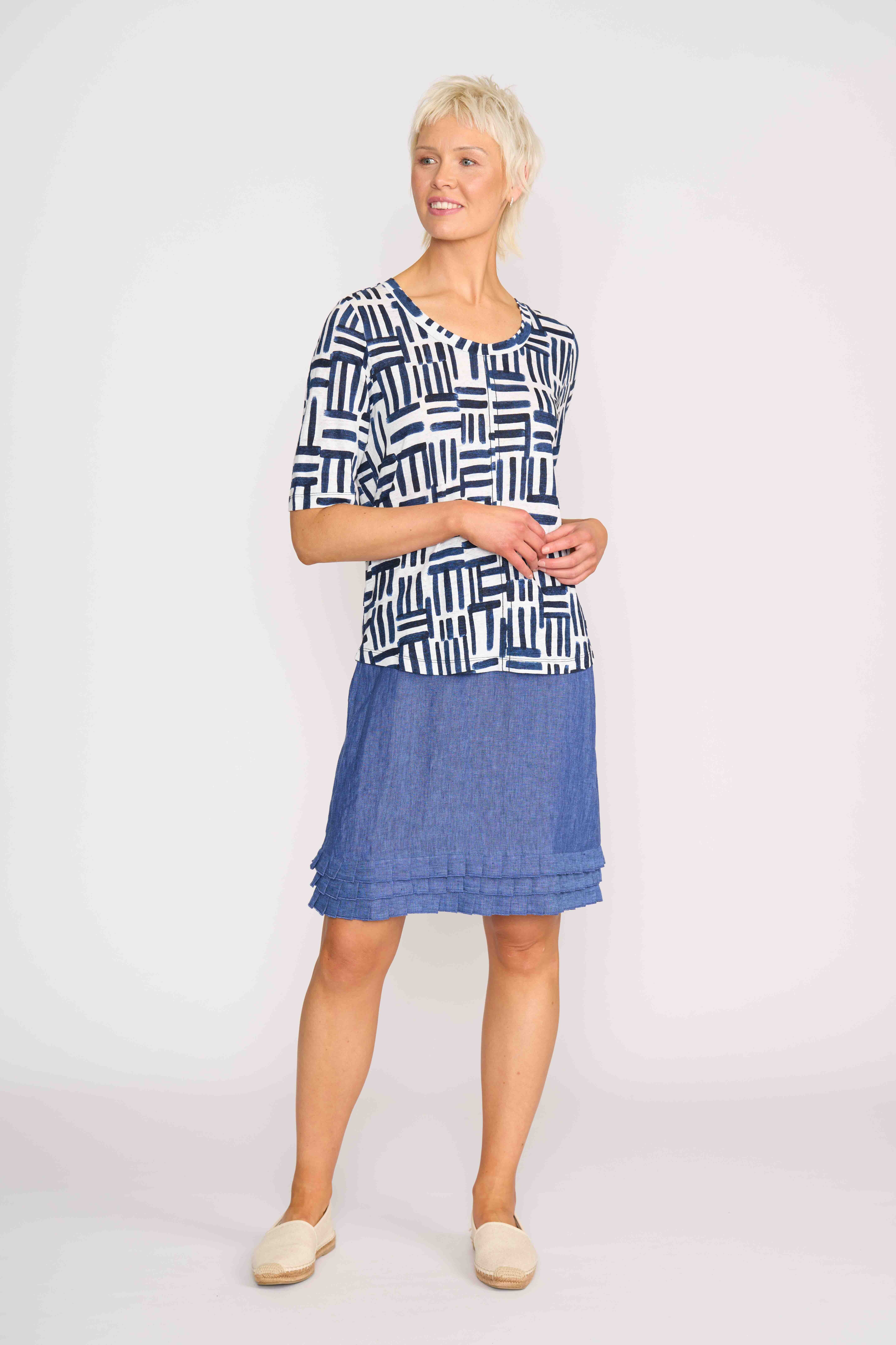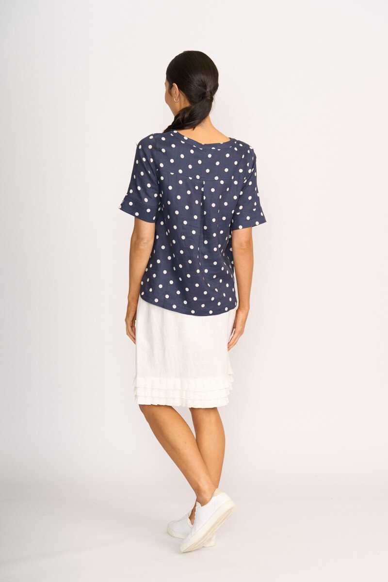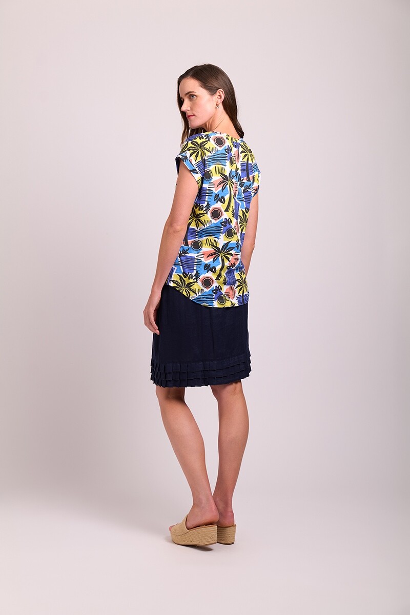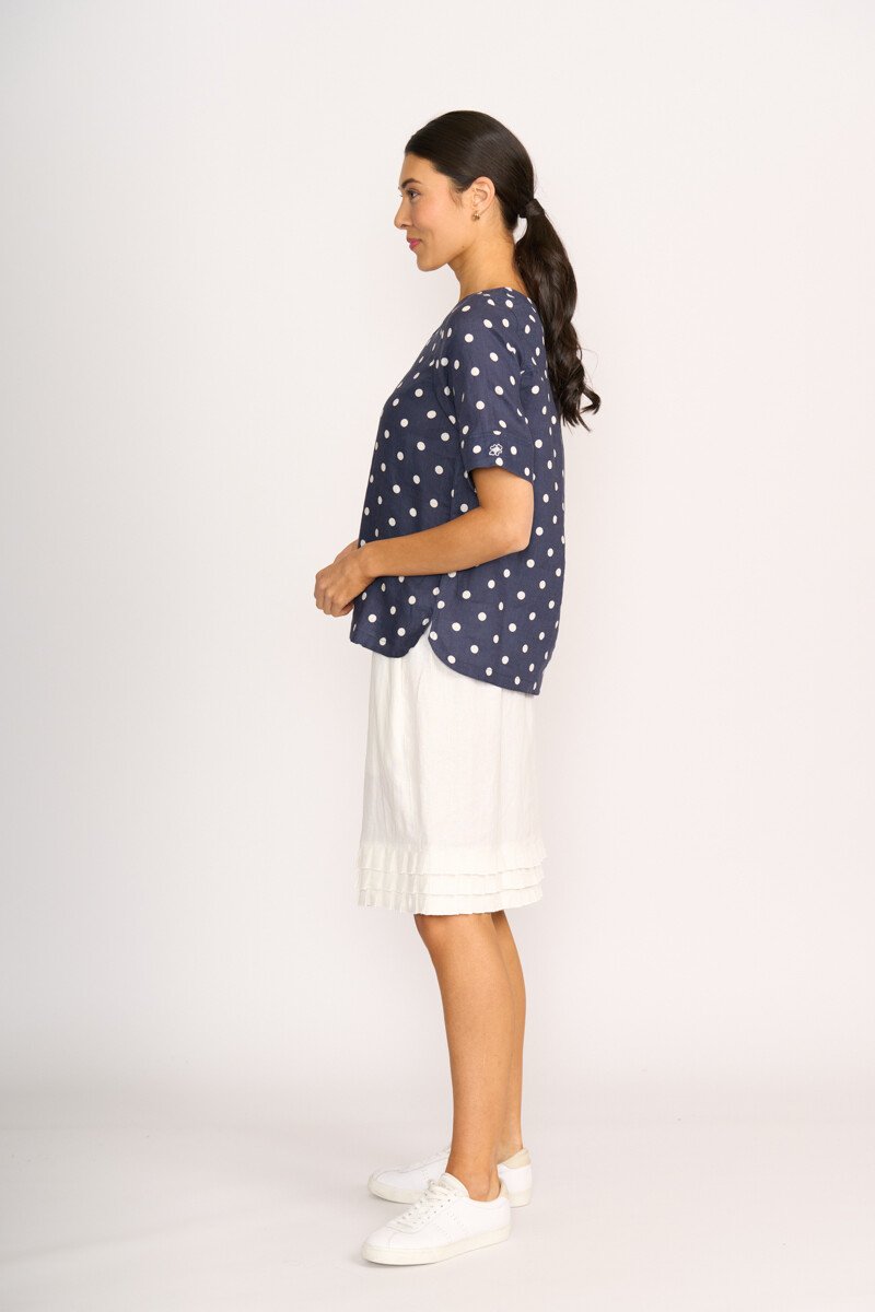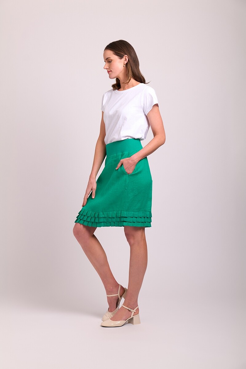 Knee length linen skirt with an elasticated waistband and pleated ruffle hem. Inseam pockets.