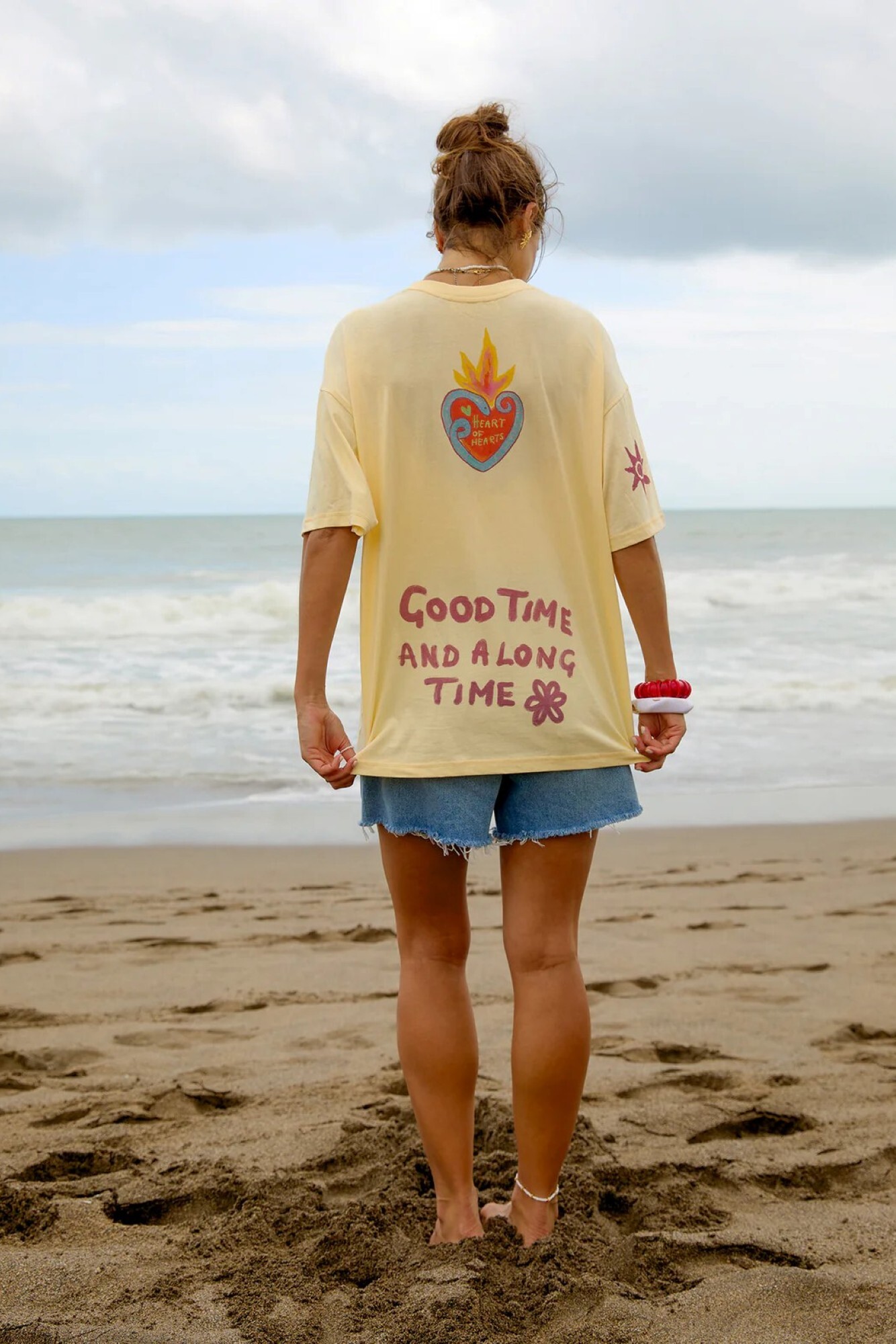 Here for a good time and maybe a long time too. The Heart of Hearts Tee is all love and good energy with its hand drawn artwork and vintage beach club vibe. Soft cotton, easy oversized fit and a little bit of cheeky charm. Made for golden hours, loud laughter and living straight from the heart. If you love the oversized look, stick with your regular size. If you are wanting a more relaxed fit, we recommend sizing down by 1 or 2 sizes.