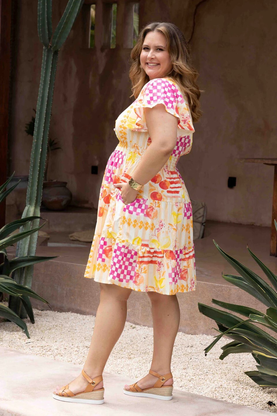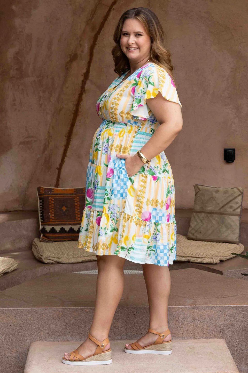 Our Pixie Dress is a sweet, feminine style that is truly timeless. Flutter cap sleeves flatter as does the comfortable rouched waist-band. The perfect length for work or play! And to make it even better... it has pockets!