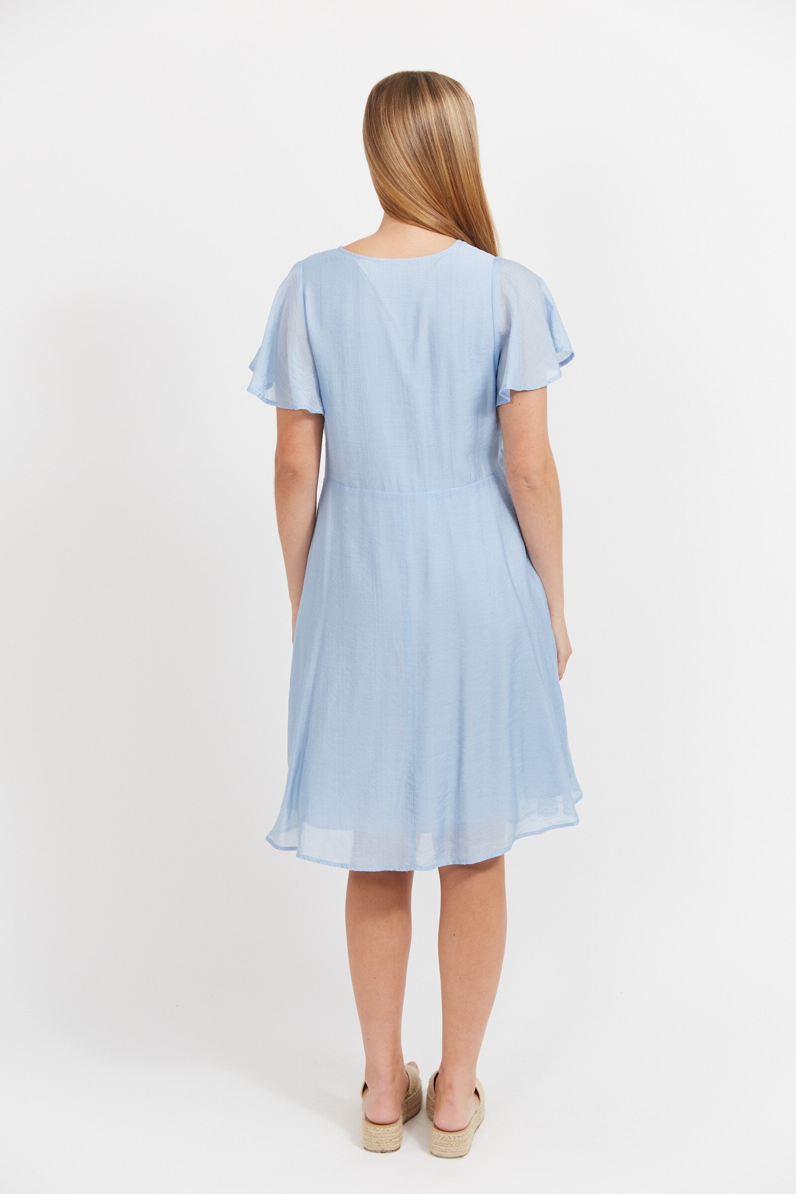 The Baja Dress is your next go-to summer dress. Featuring soft flutter sleeves, a V-neckline, gathered bust panel for gentle shape, and a wide, floaty hem that falls just below the knee. Internal side pockets add a touch of everyday practicality.