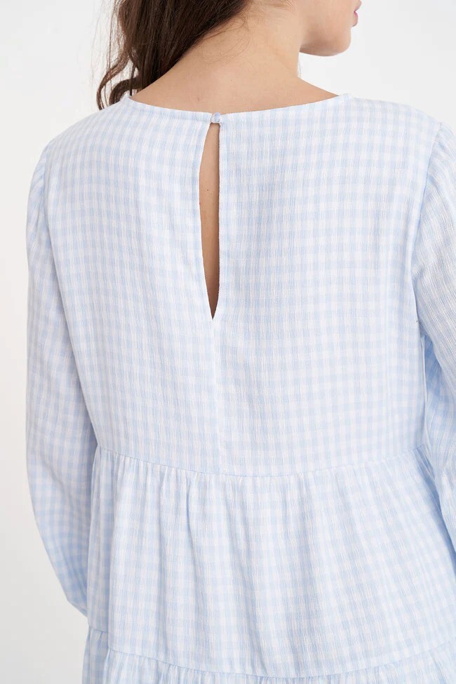 50% Cotton 50% Rayon / 110gsm / Custom Huffer gingham / Relaxed fit / Long sleeves / Keyhole closure at back neck / Tiered skirt / Side seam pockets