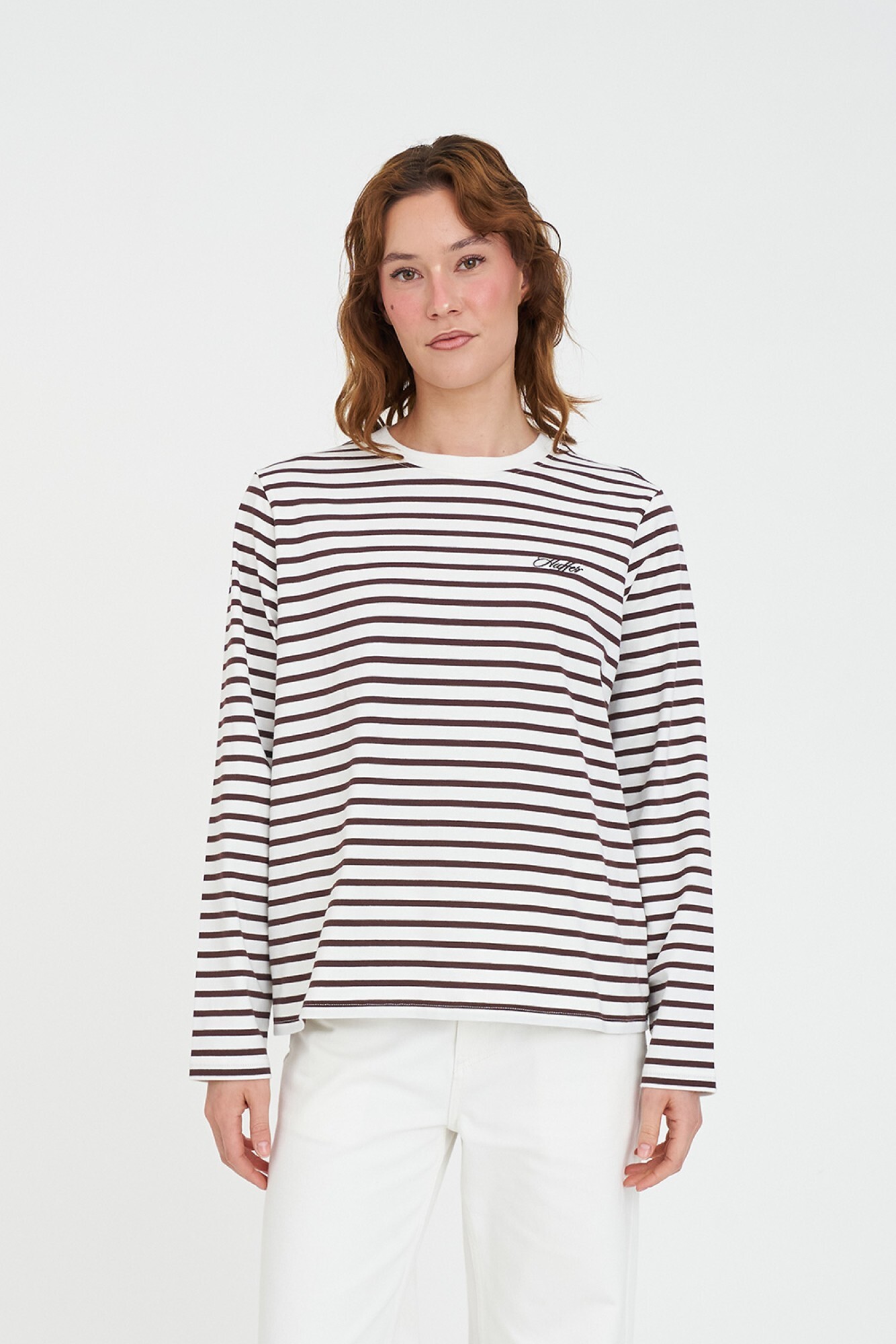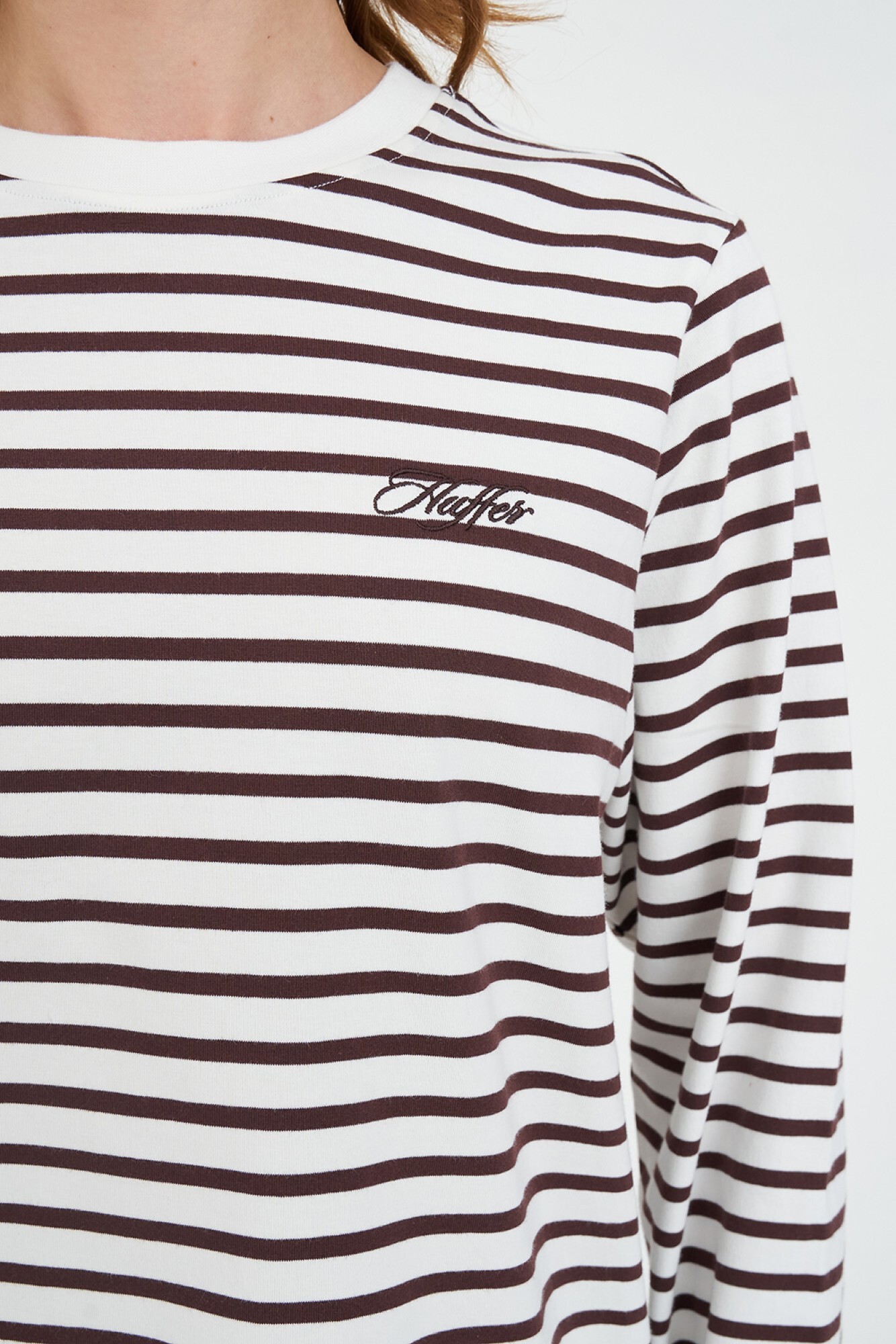 • What you need to know: 97% Cotton, 3% Elastane, 186gsm, 20mm Neck rib, Custom Huffer yarn dyed stripe, Long sleeve, Relaxed fit, Huffer branded placement embroid