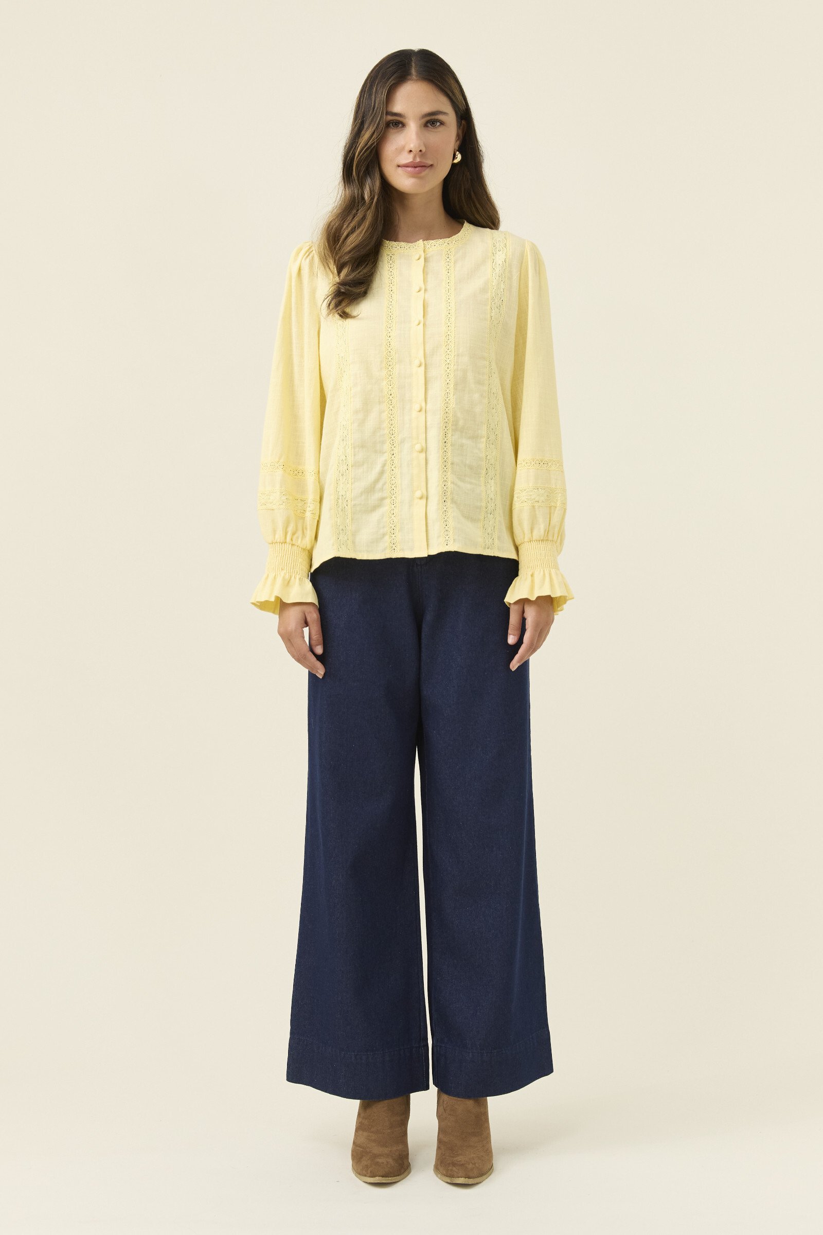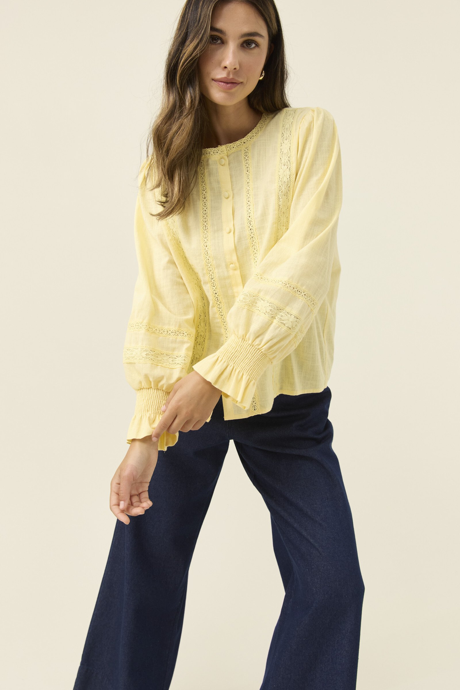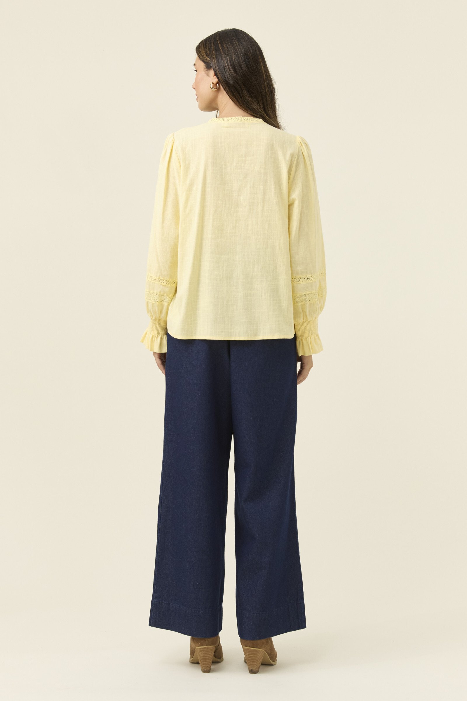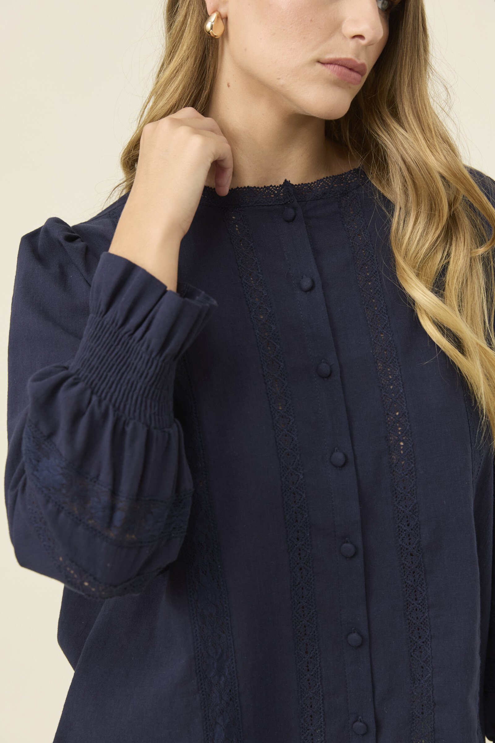 A feminine, lightweight cotton shirt with thoughtful detail, the Maeve Shirt blends soft structure with delicate lace accents. The band collar and lace inserts create a refined texture, complemented by full sleeves that gather at the shirred cuffs for gentle volume.