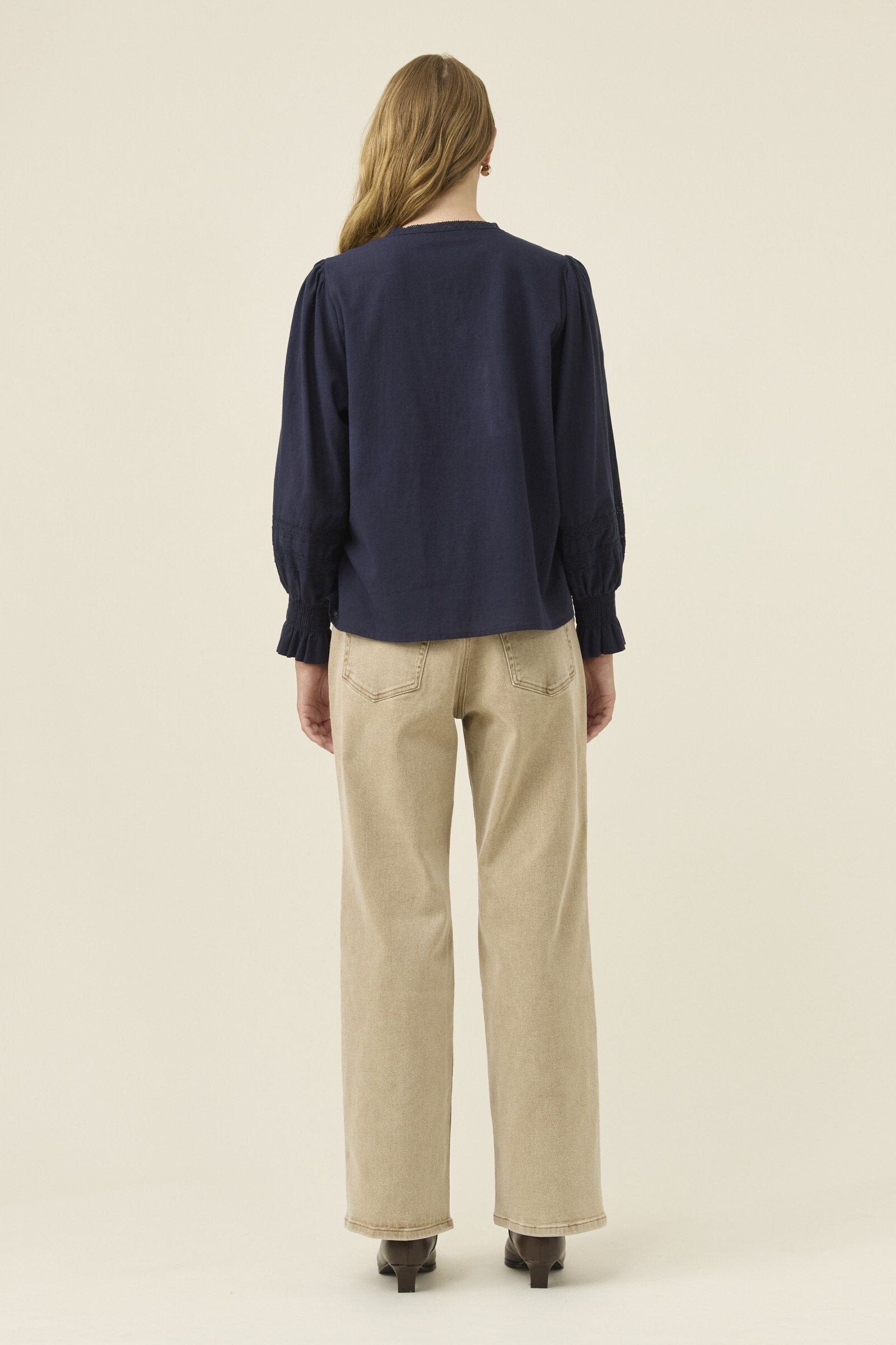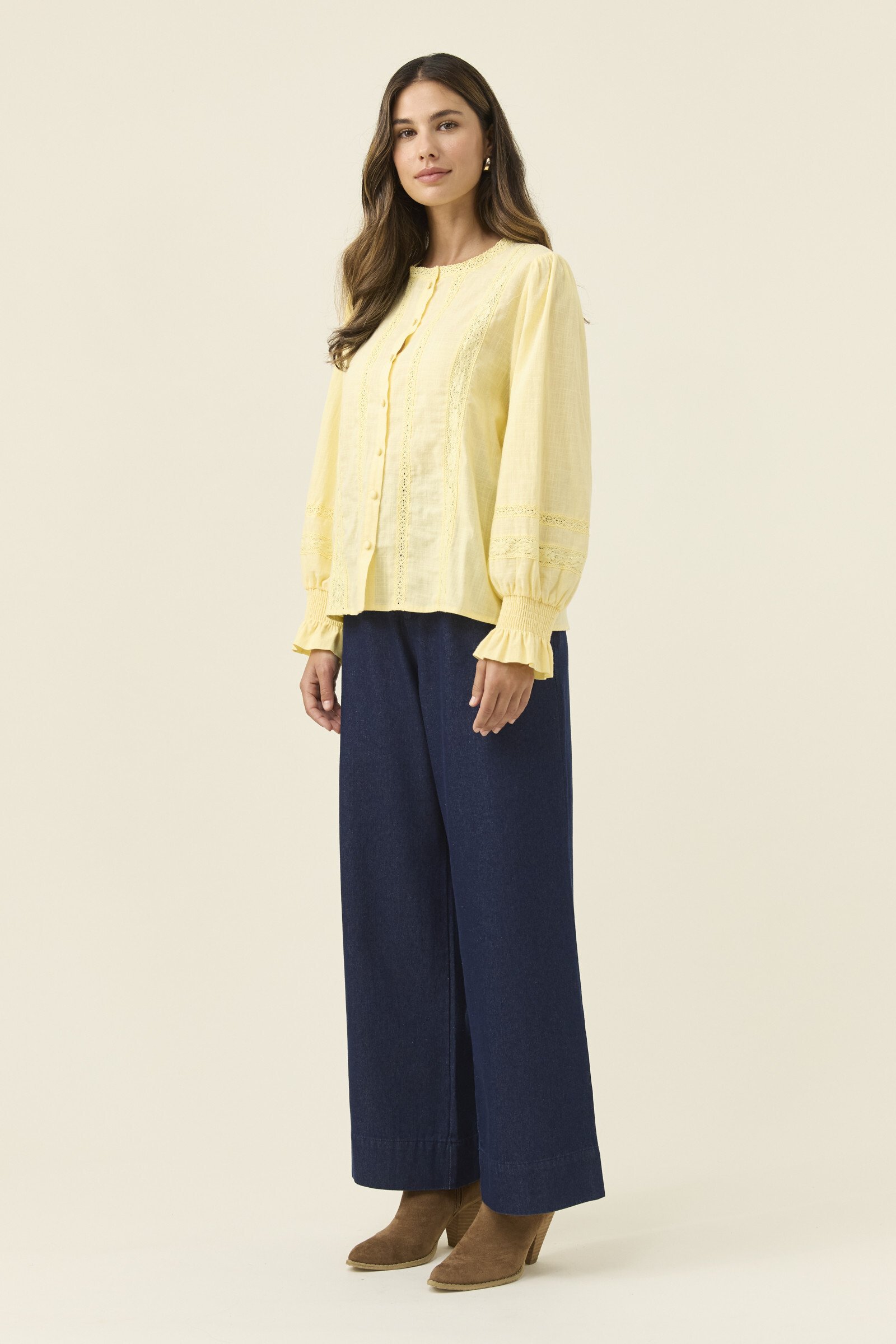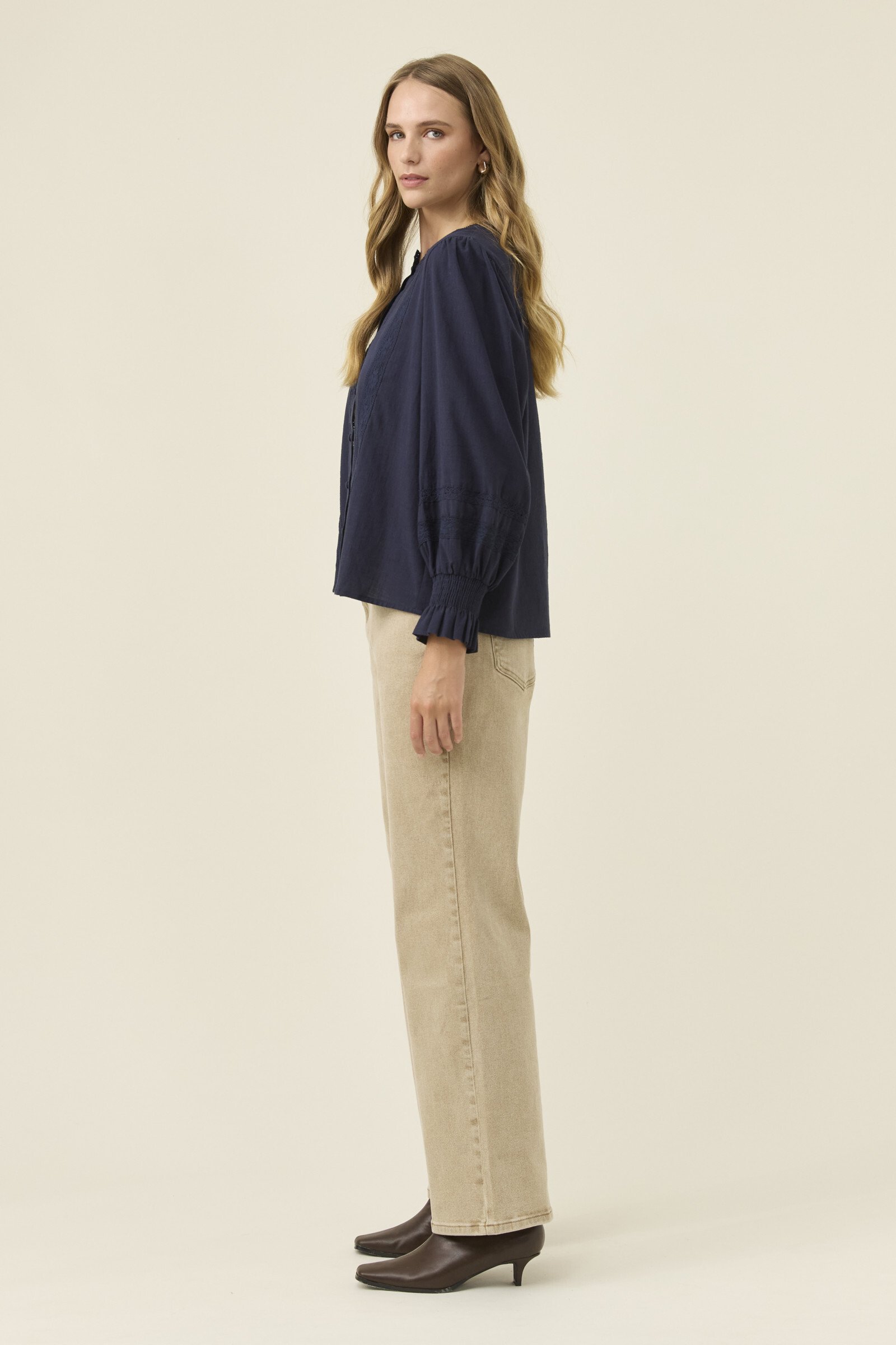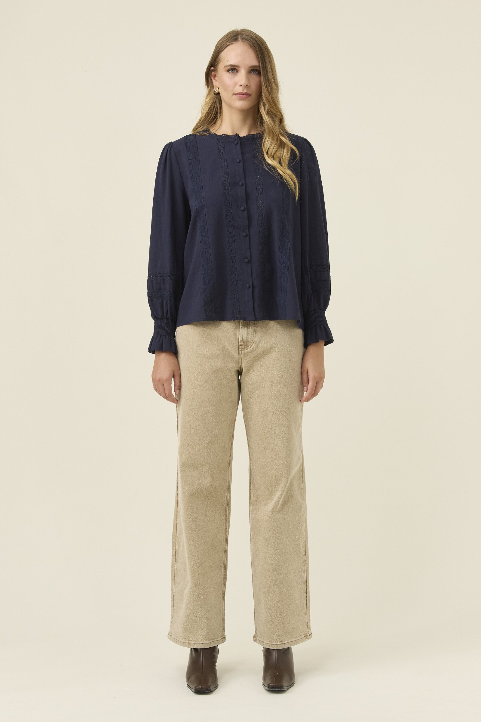 A feminine, lightweight cotton shirt with thoughtful detail, the Maeve Shirt blends soft structure with delicate lace accents. The band collar and lace inserts create a refined texture, complemented by full sleeves that gather at the shirred cuffs for gentle volume.