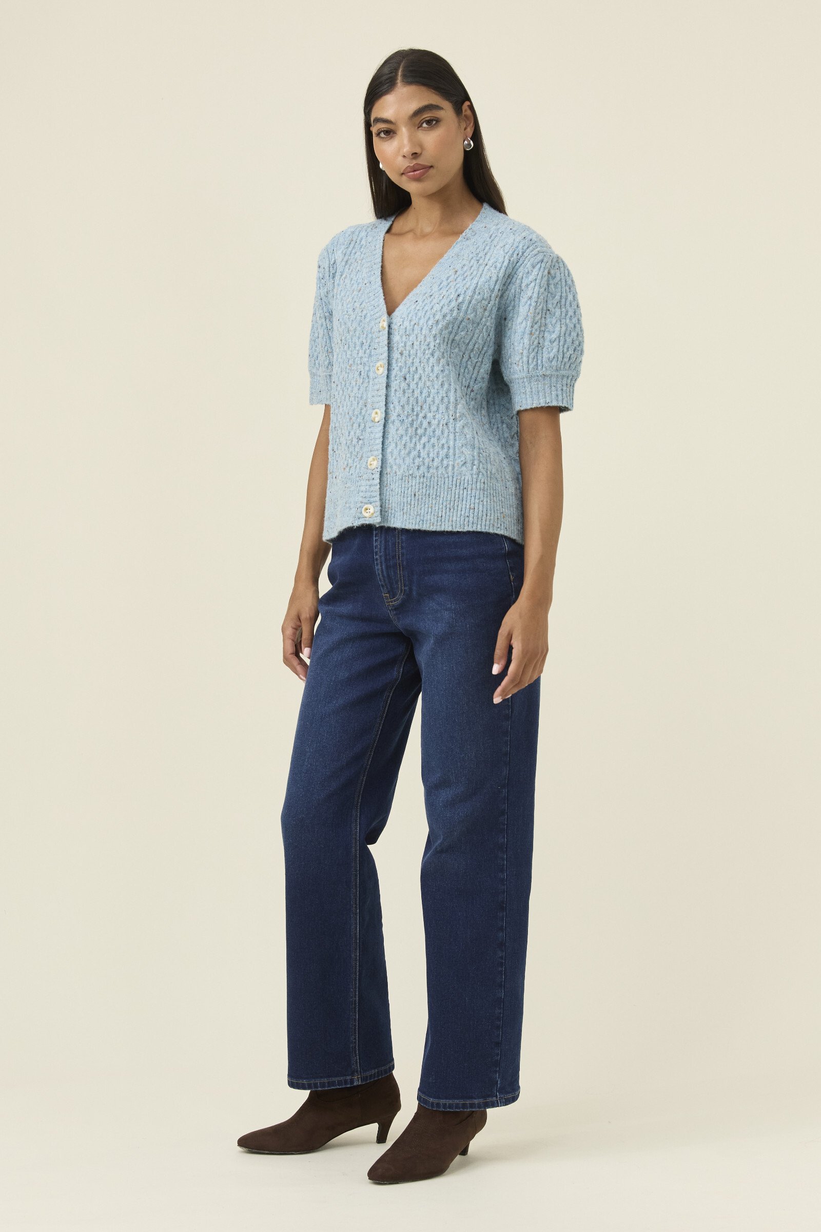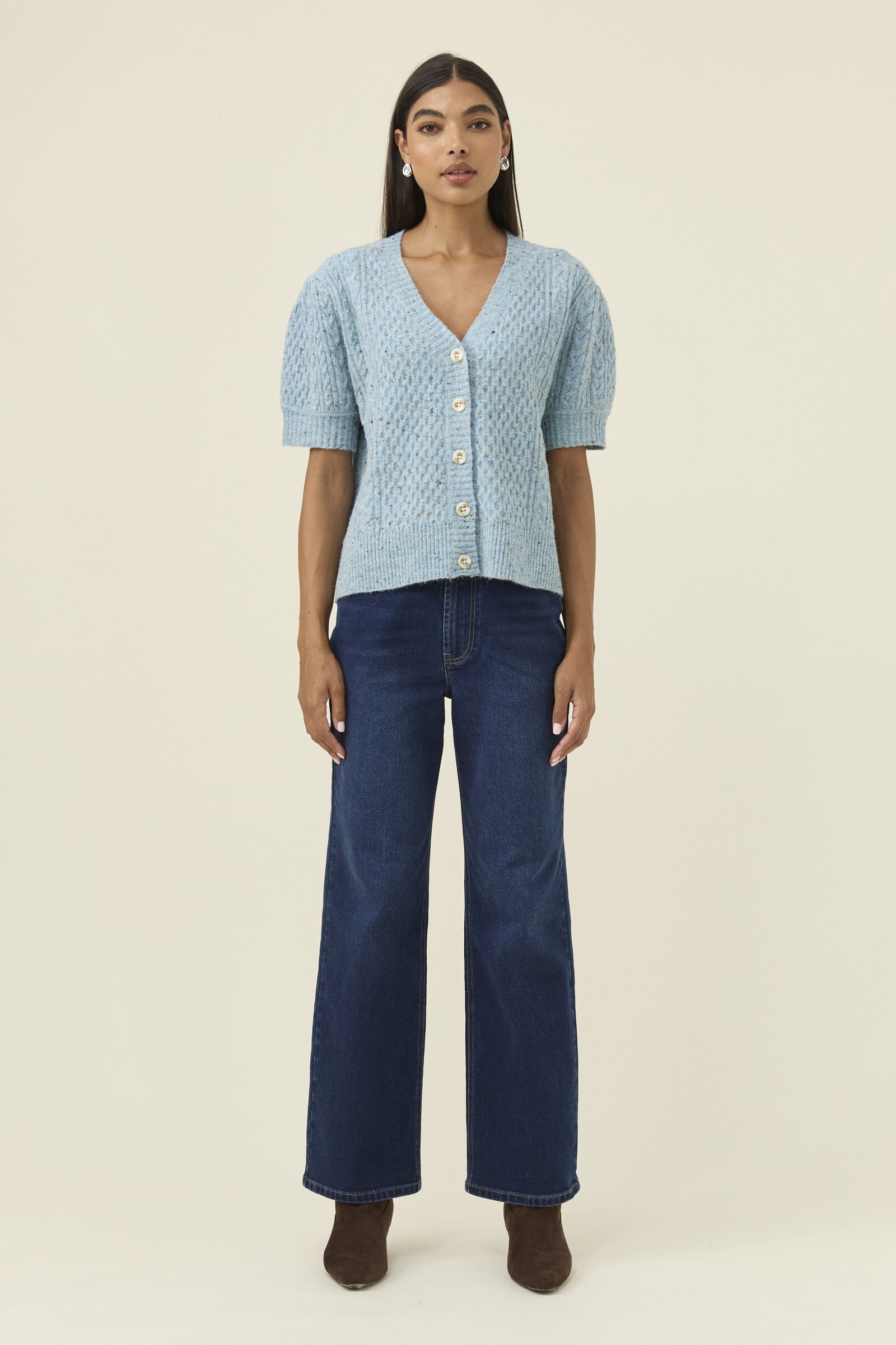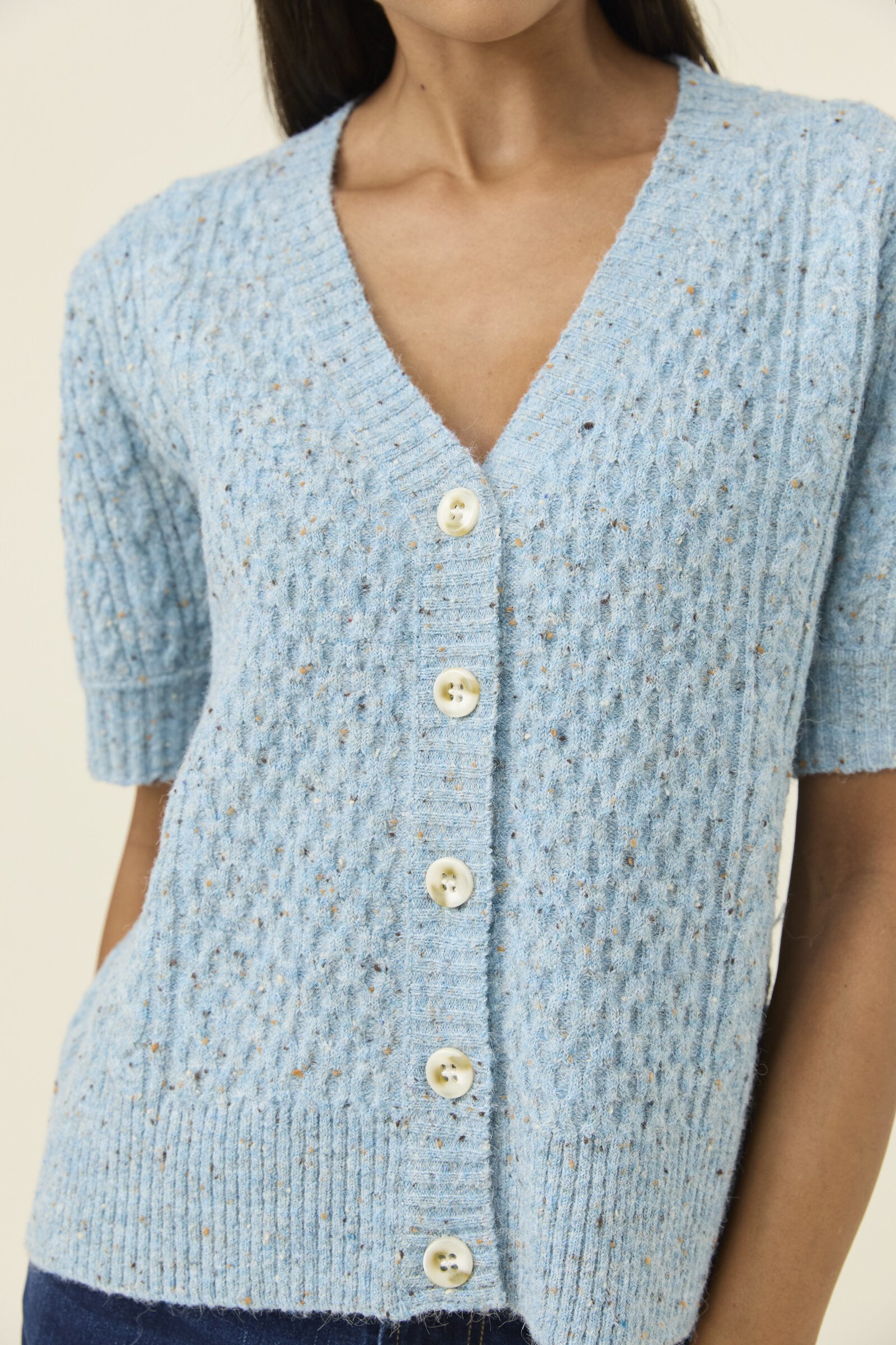 A softly textured mixed-yarn knit with a lightweight, airy feel. The short sleeves and V-neckline keep the shape open and easy, while tortoise shell buttons bring a natural finish. A versatile layer for in-between days.