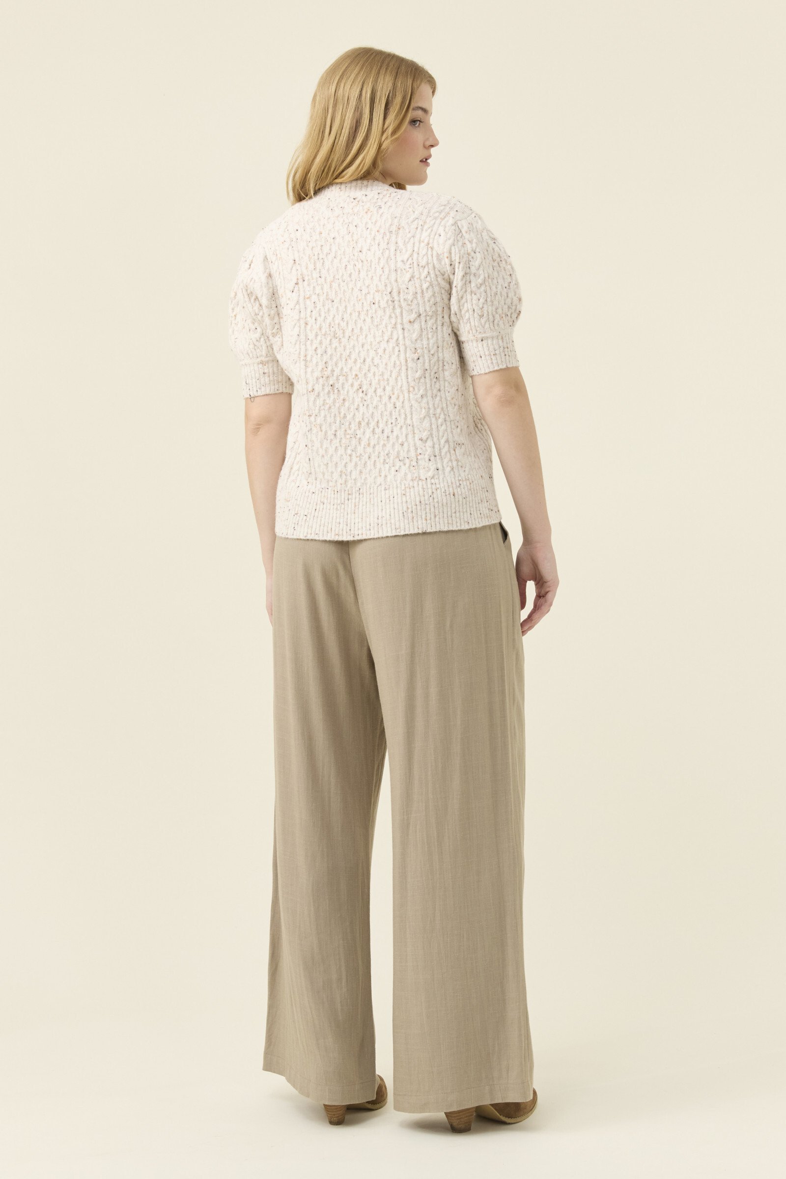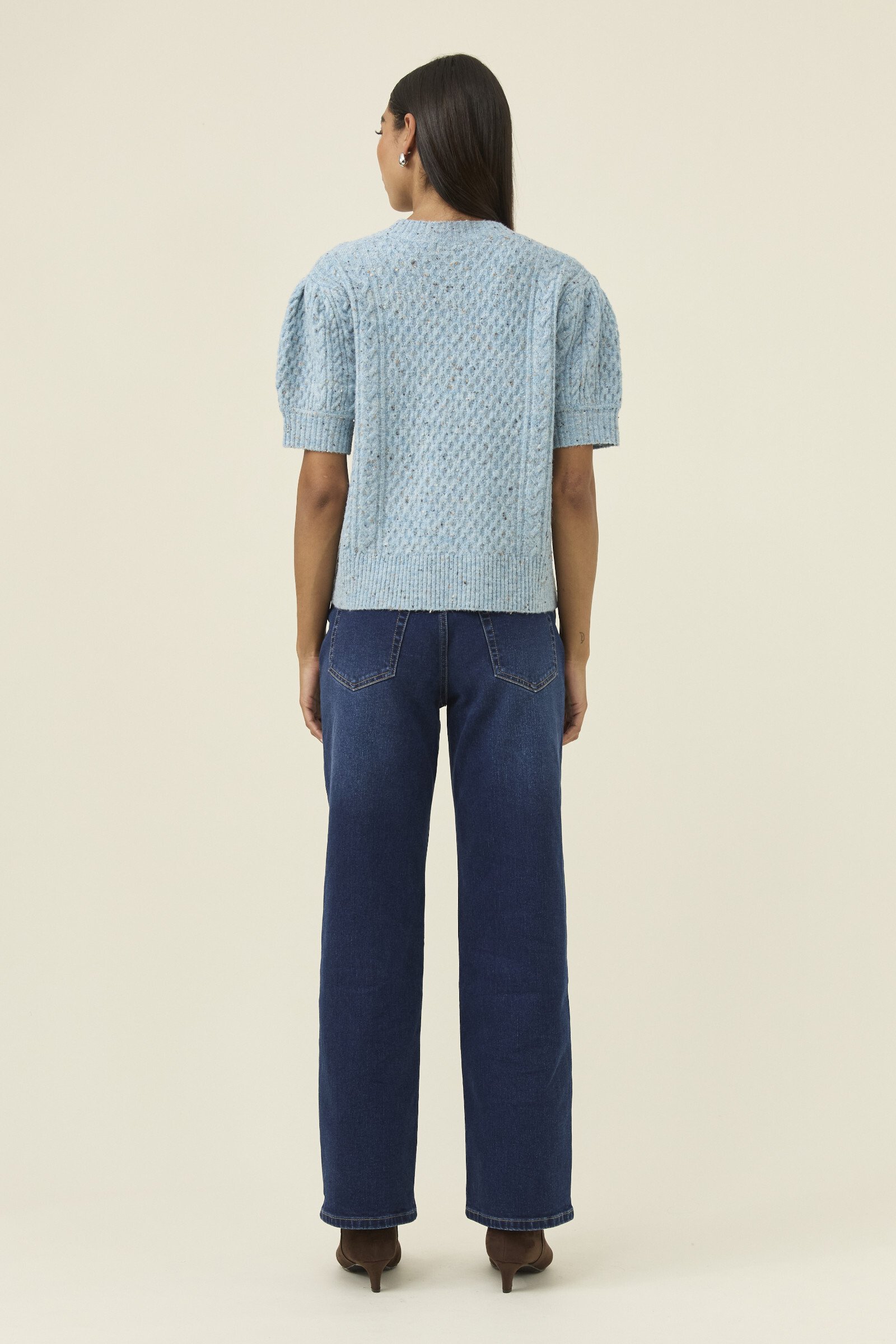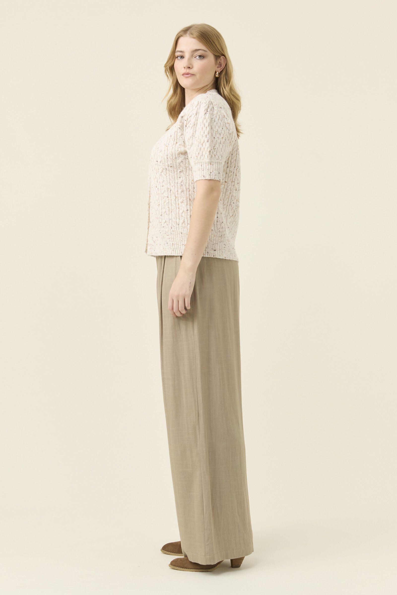 A softly textured mixed-yarn knit with a lightweight, airy feel. The short sleeves and V-neckline keep the shape open and easy, while tortoise shell buttons bring a natural finish. A versatile layer for in-between days.