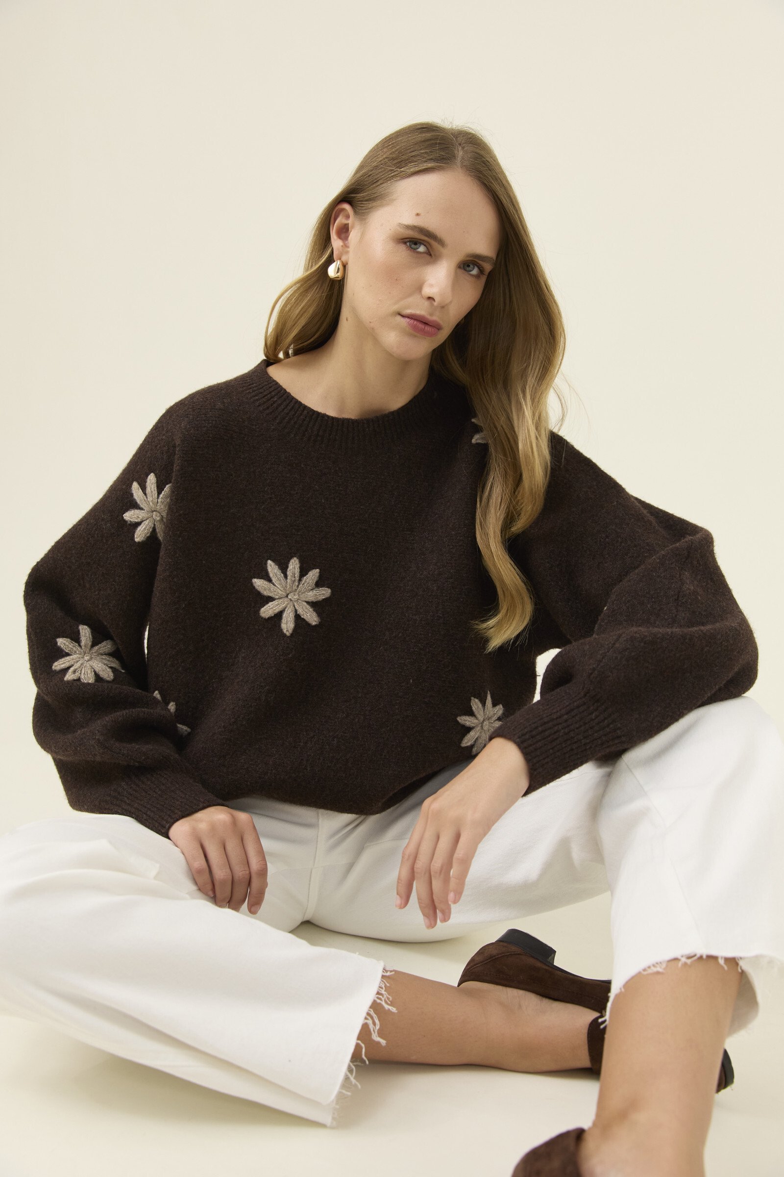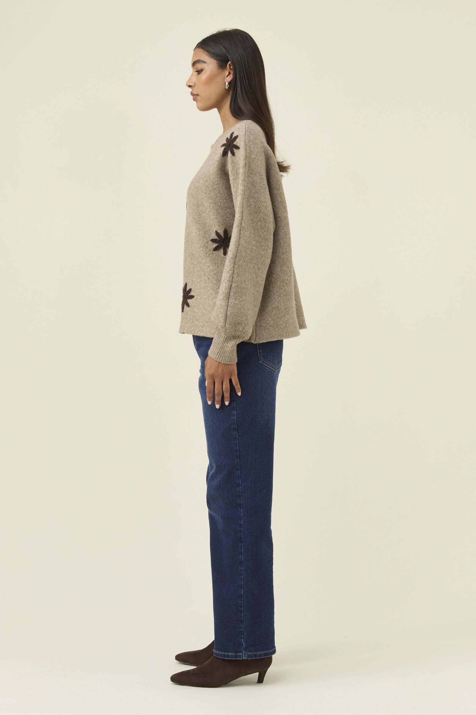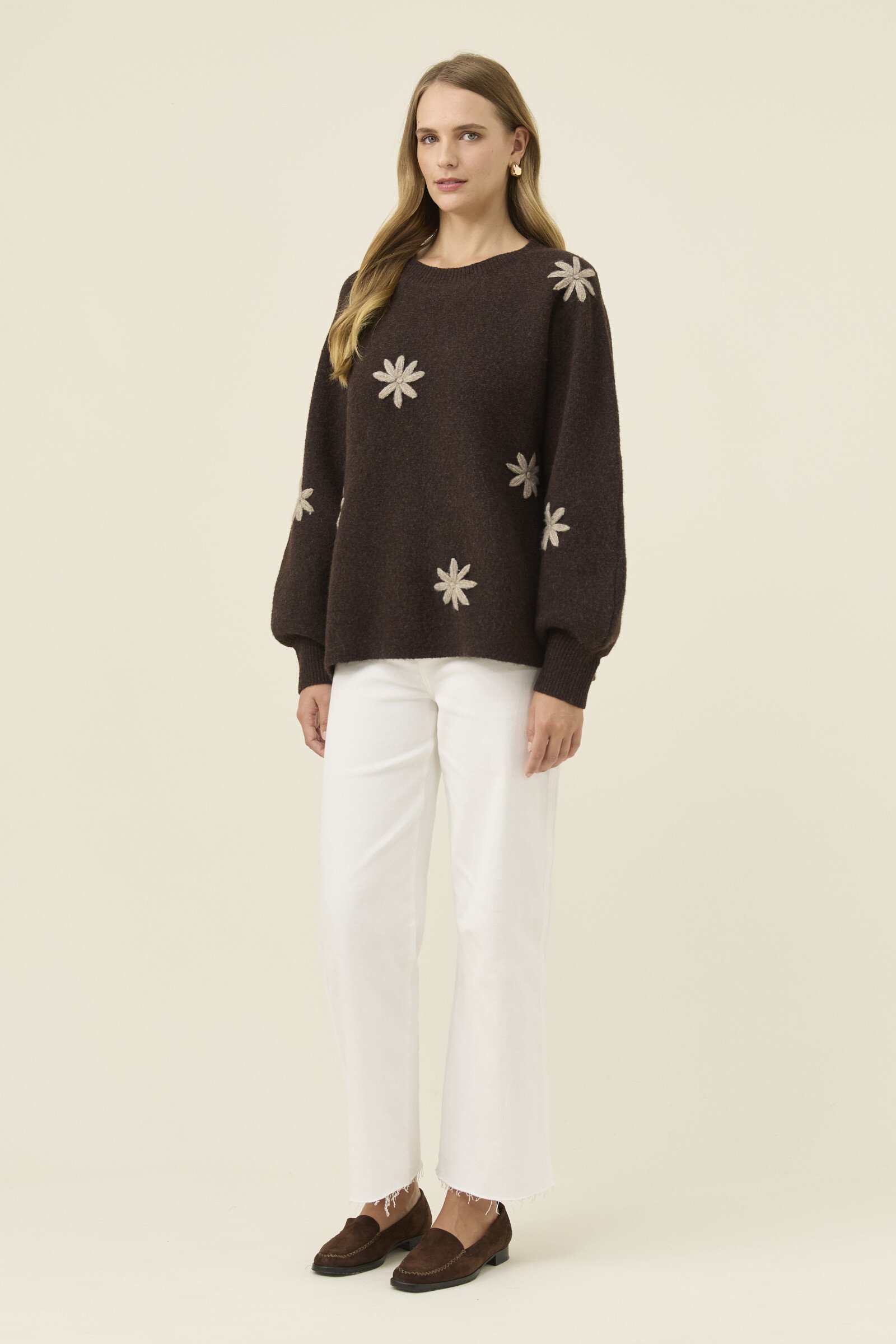 A cosy jumper with a playful stitched flower applique adding gentle charm to the silhouette. The crew neckline and relaxed fit keep it easy to layer, while the bishop sleeves bring soft volume.