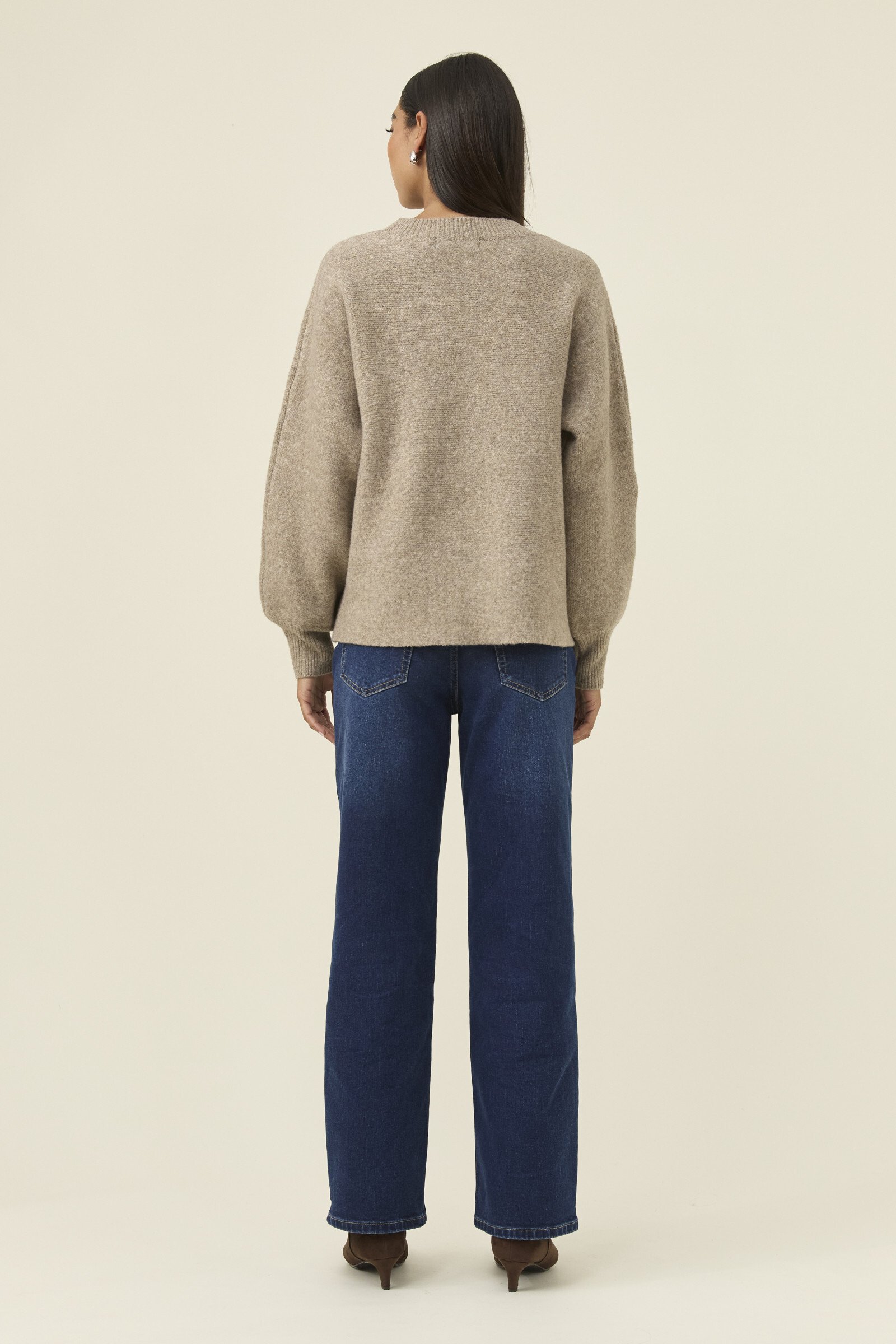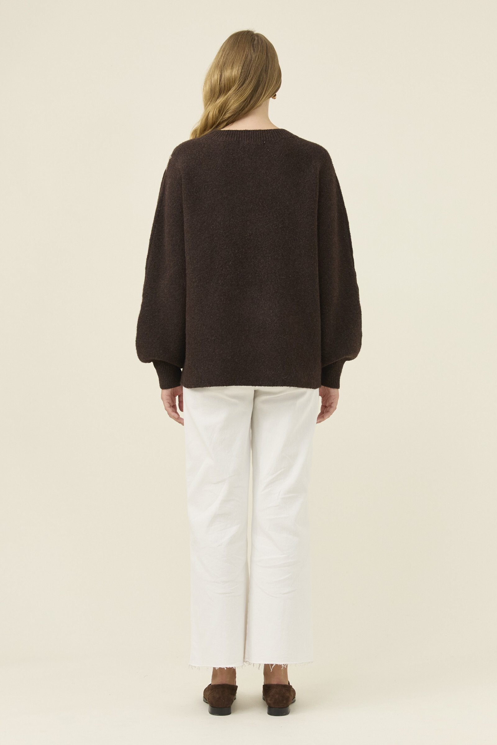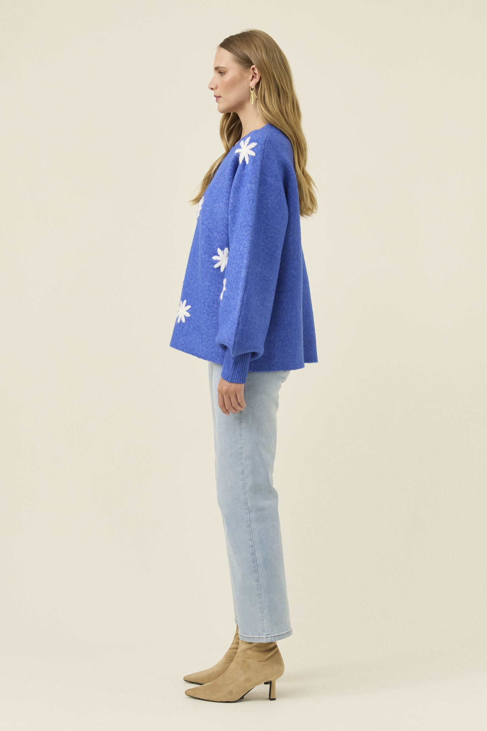A cosy jumper with a playful stitched flower applique adding gentle charm to the silhouette. The crew neckline and relaxed fit keep it easy to layer, while the bishop sleeves bring soft volume.
