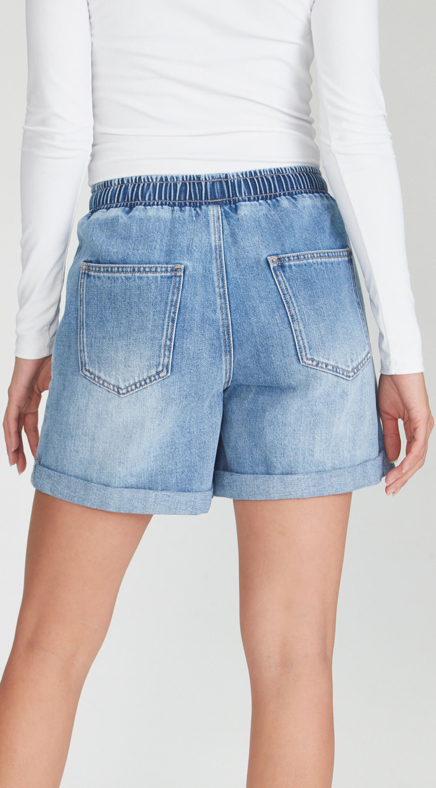Mid waisted rigid denim shorts.