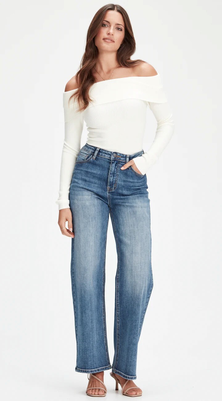 SHORT LENGTH.Mid to high waisted, stretch denim wide leg jean.
