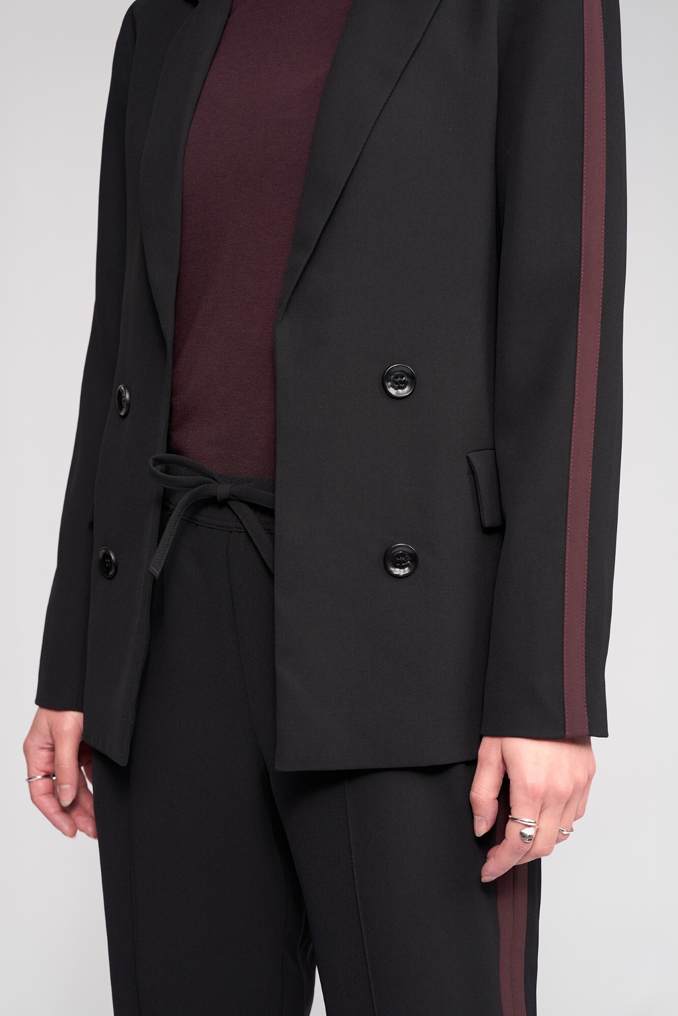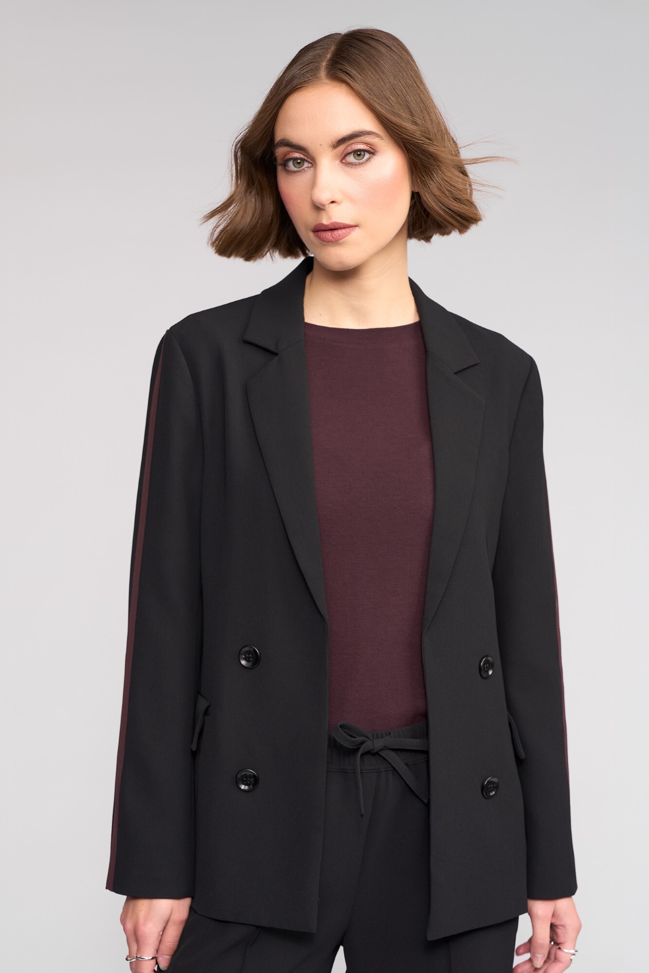 Tailored black blazer with a feature Raisin stripe running down the length of the sleeves. Designed with a classic lapel collar and open front, this fully lined style features decorative buttons at the centre front and welt pockets with flaps. Finished with contrast sleeve detailing, it offers a relaxed yet shaped silhouette for polished everyday wear.