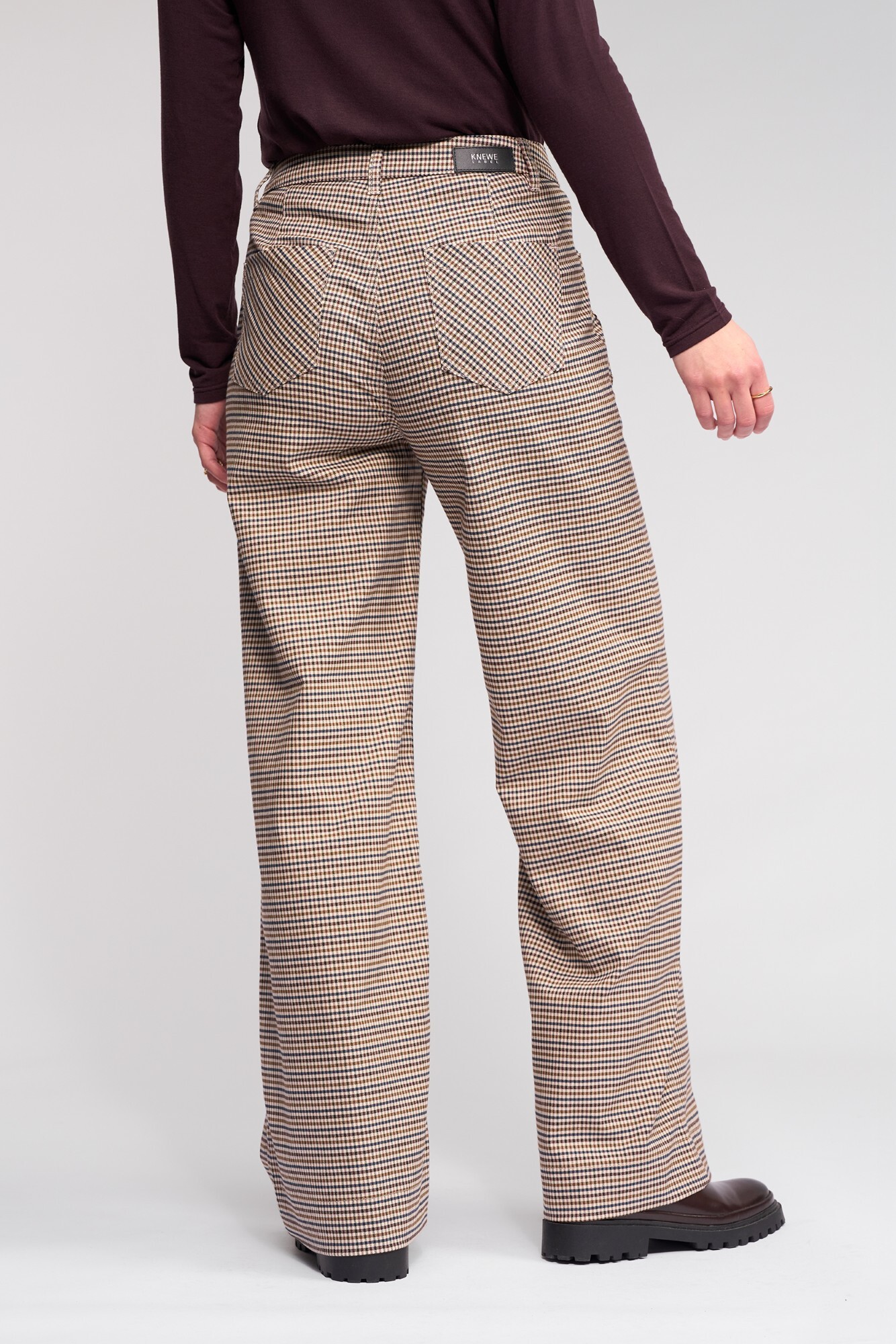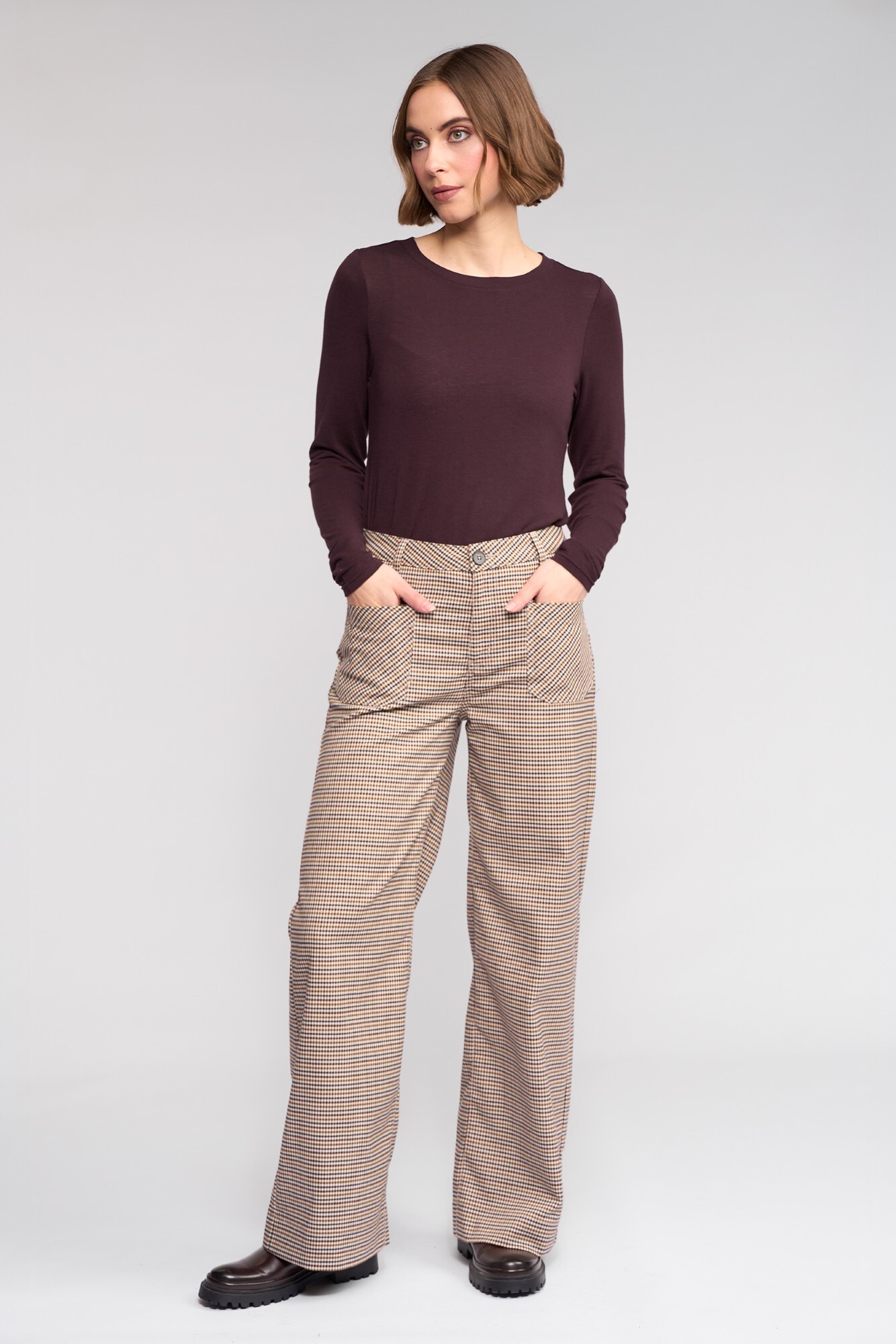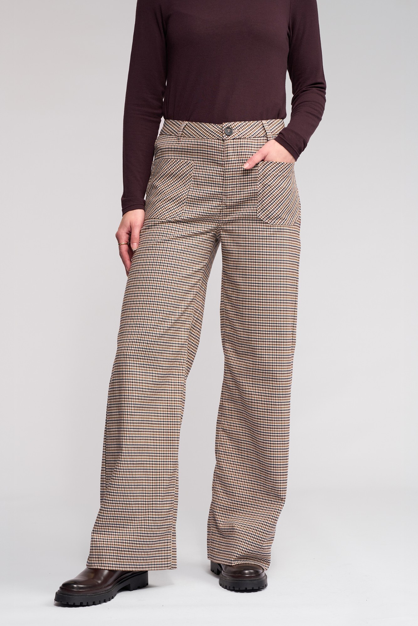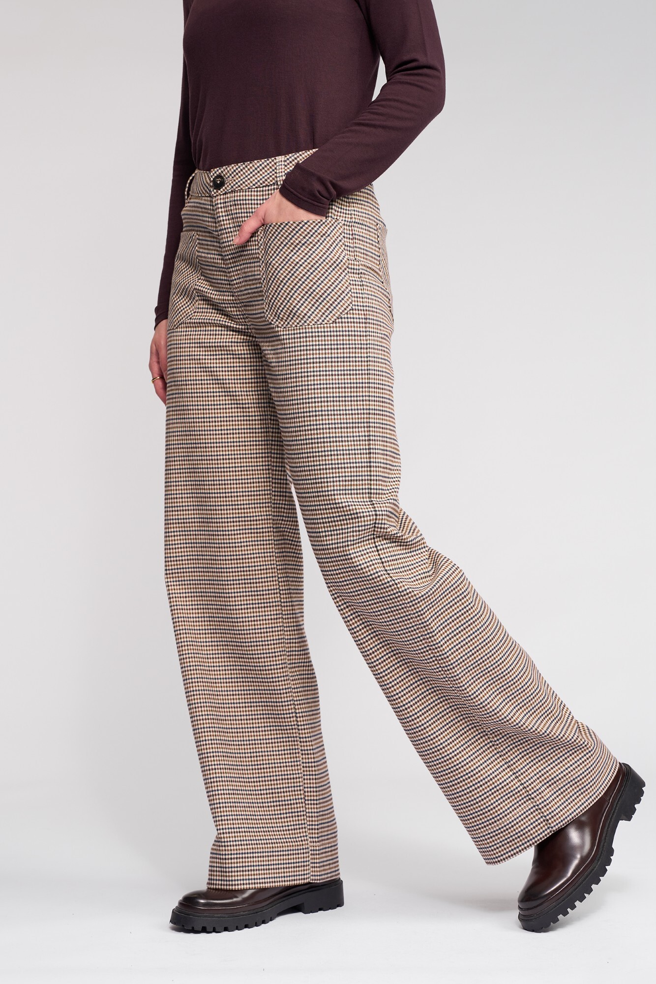 Full-length wide-leg pant in the Paige pattern, featuring a cream base with a checked pattern in cedar, blue, raisin, and brown. Designed with front and back patch pockets, this style offers a relaxed silhouette with a classic, tailored finish.