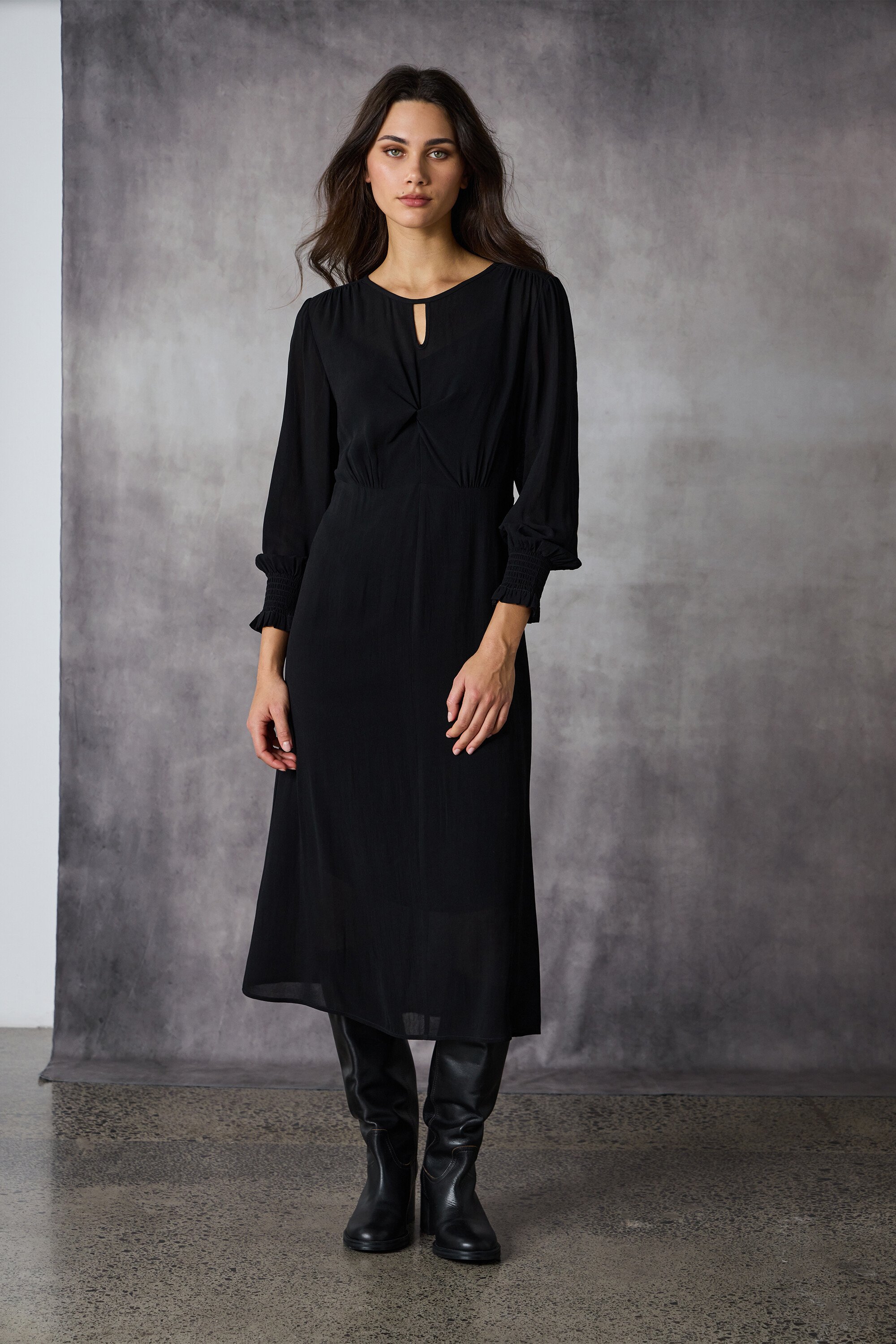 The Shadow Dress is a slimline midi featuring a shaped underbust seam for a flattering fit. A keyhole opening with a front twist adds subtle allure, while softly gathered full-length sleeves with deep shirred cuffs complete the look. A timeless piece that exudes elegance and sophistication.