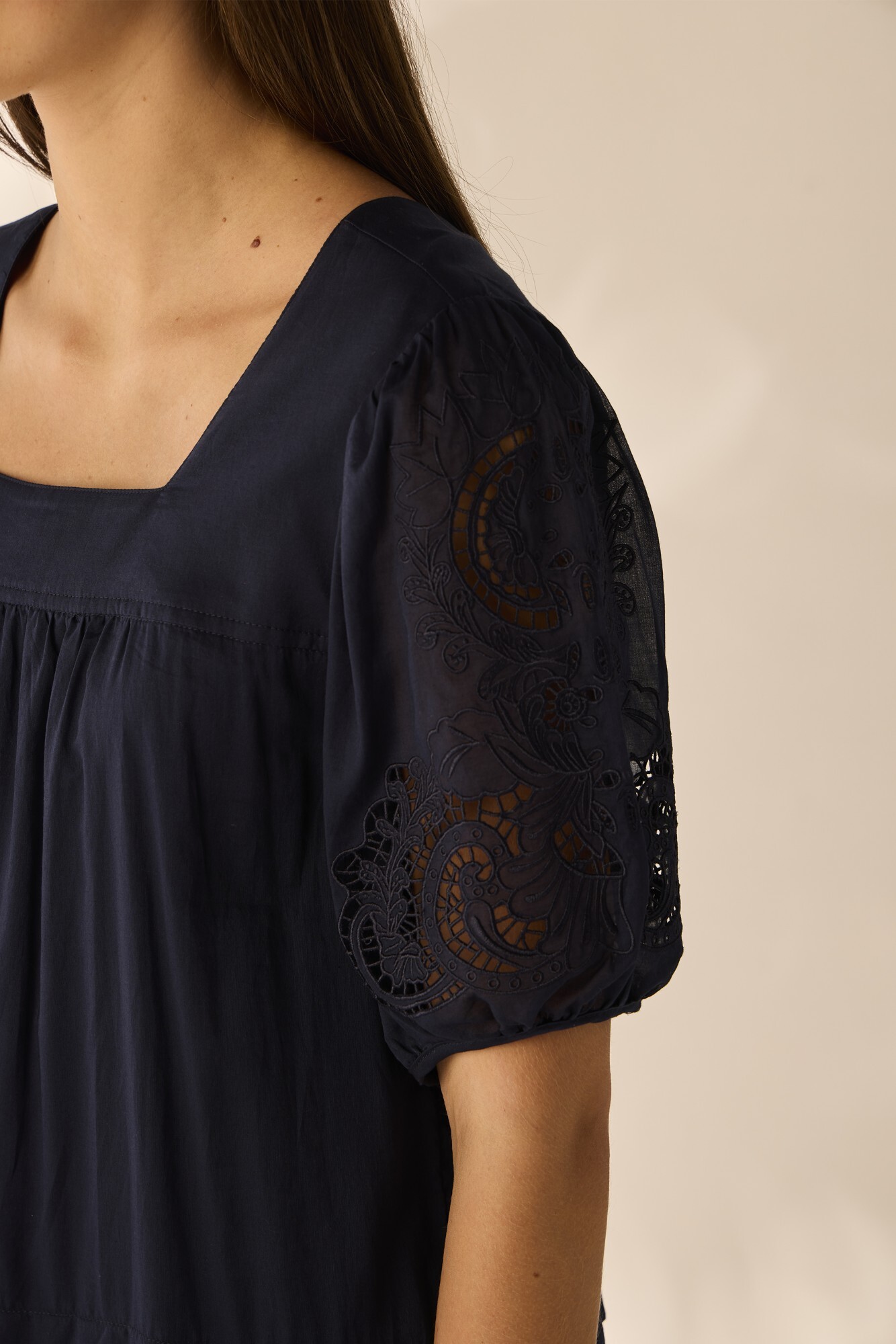 A relaxed fit dress, with a square neckline which is balanced with the tuck detailing around the waist and skirt hem. The cut-out embroidery on the sleeve adds a elegance touch to the dress. Gathered panels adds a beautiful flare to this flattering silhouette, making it the perfect summer occasion dress.