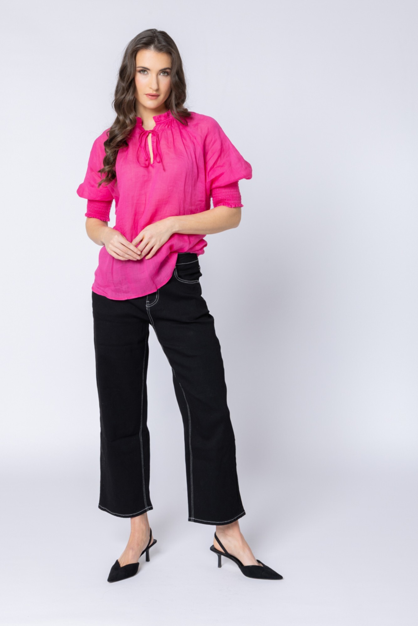 The Encourage Top is your “instant outfit” piece—light, floaty and full of feminine detail. With its gathered neckline, soft tie front and beautifully smocked sleeves, it adds shape without feeling fussy. Dress it up with black pants or keep it breezy with denim—so easy, so pretty, so wearable.