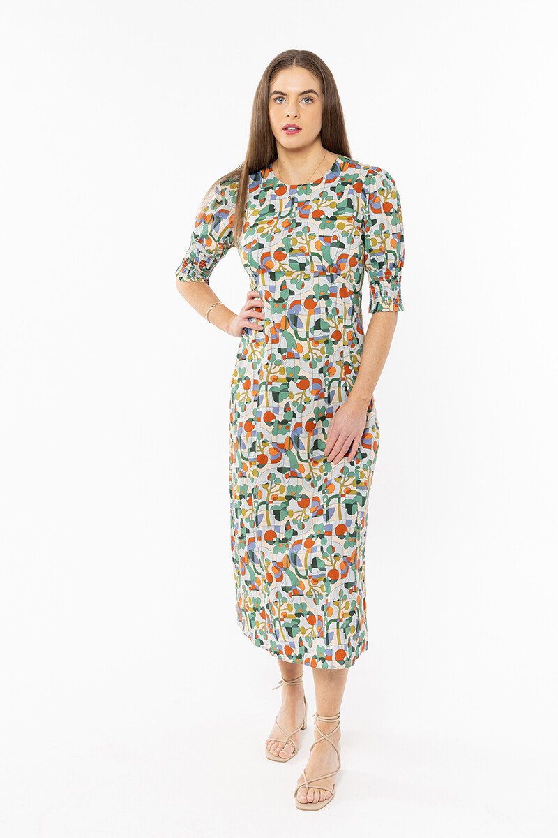 Zipper at backAll over patternRound neckNo pocketsButton keyhole at back necklineShirred cuffsUnlinedNo stretchStandard fitContent: 100% Polyester