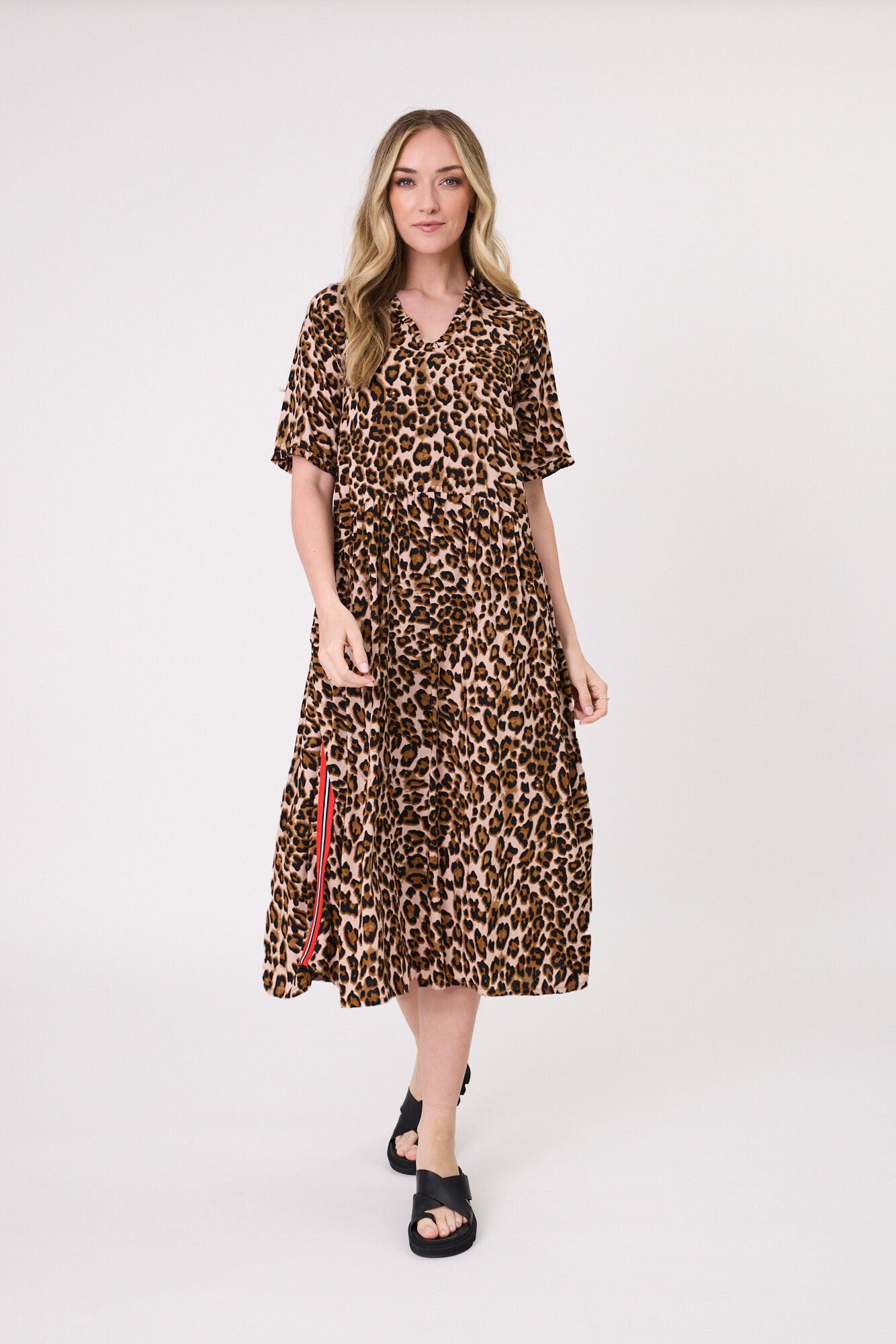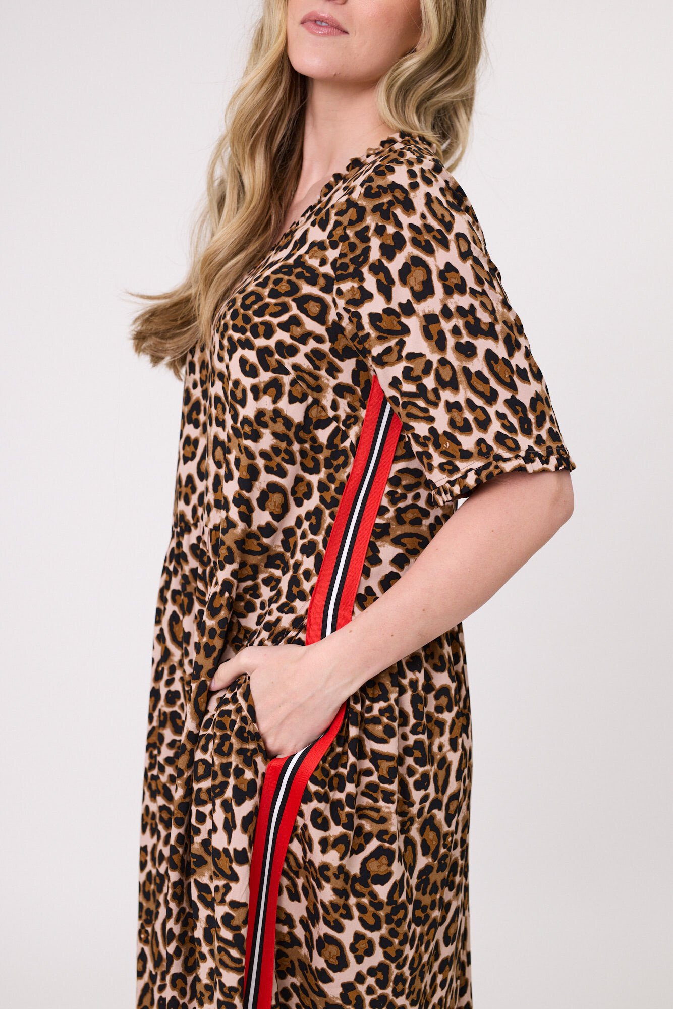 Leopard print with a striking red, white, and black  cotton stripe down the side panels.