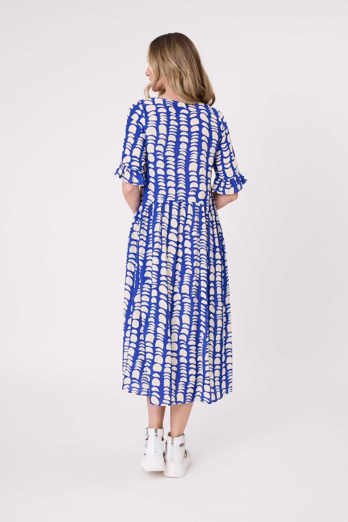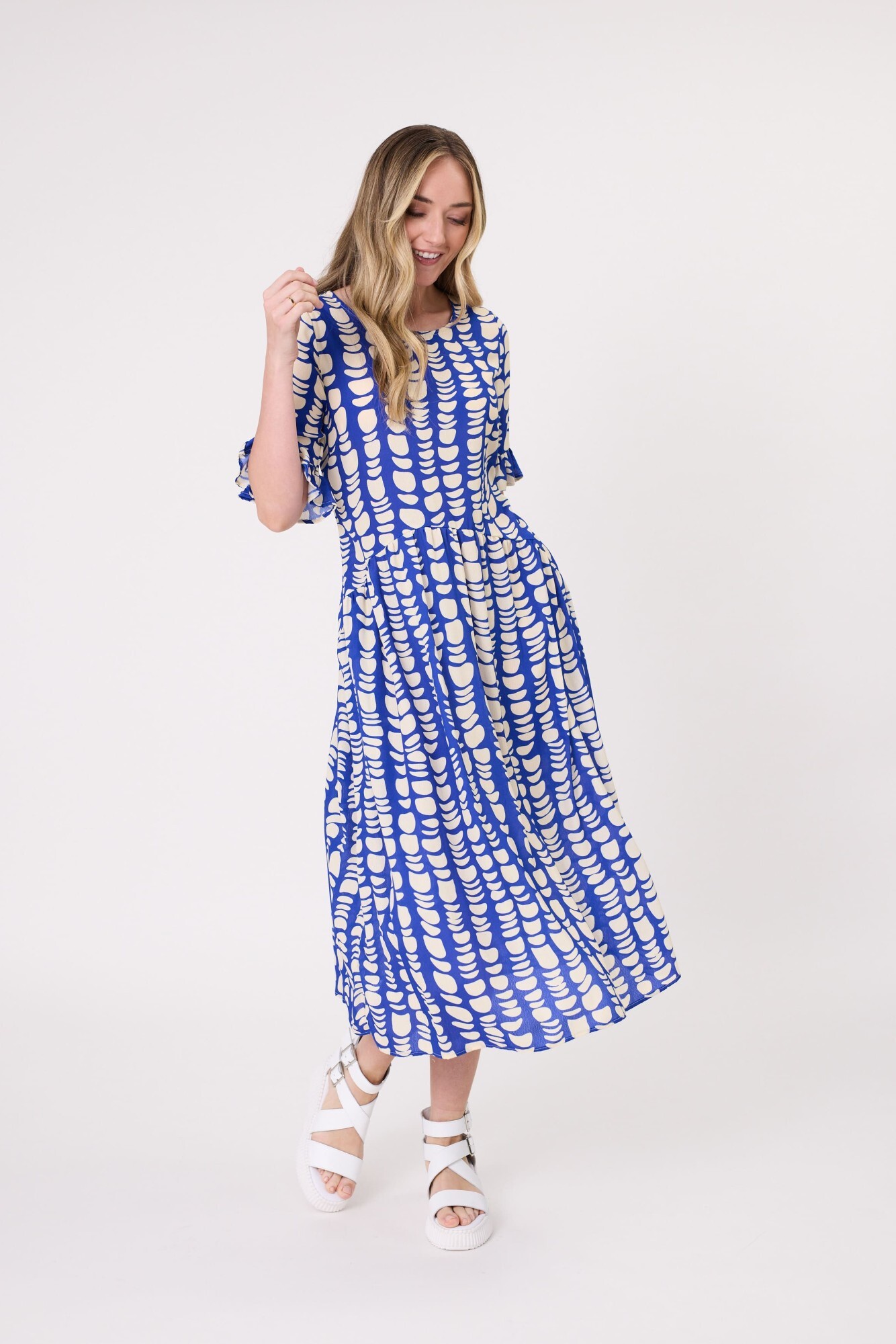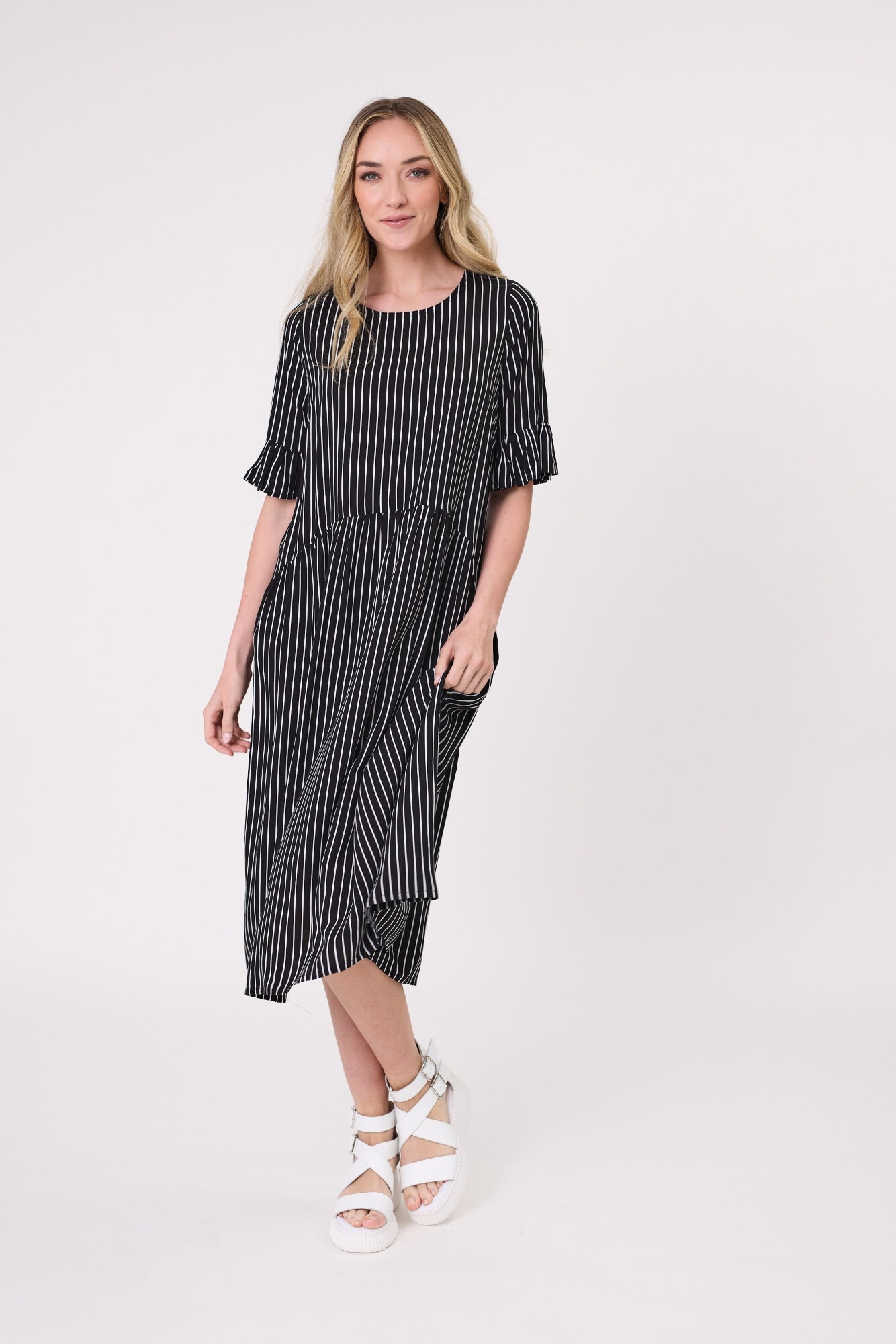 • Features a delicate frill sleeve, relaxed waistline and side pockets.