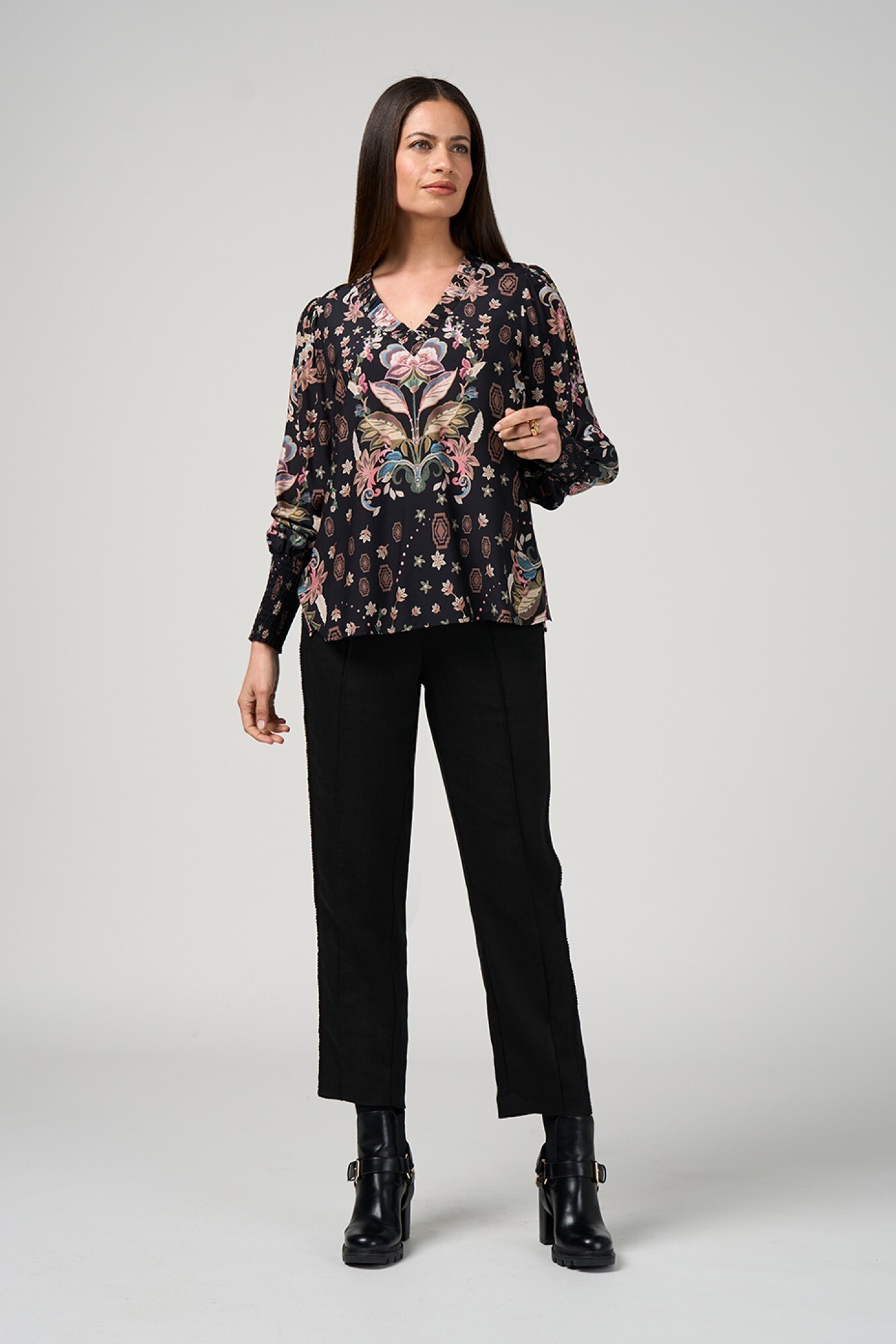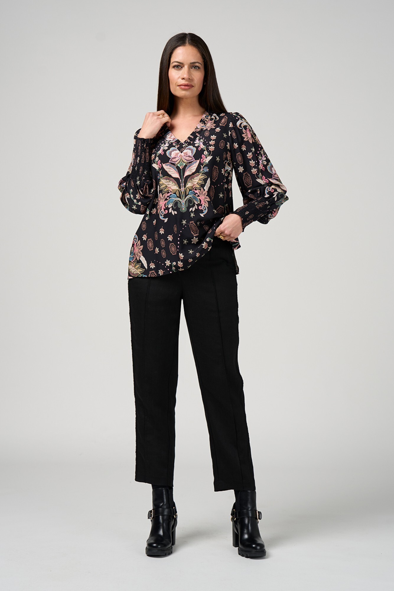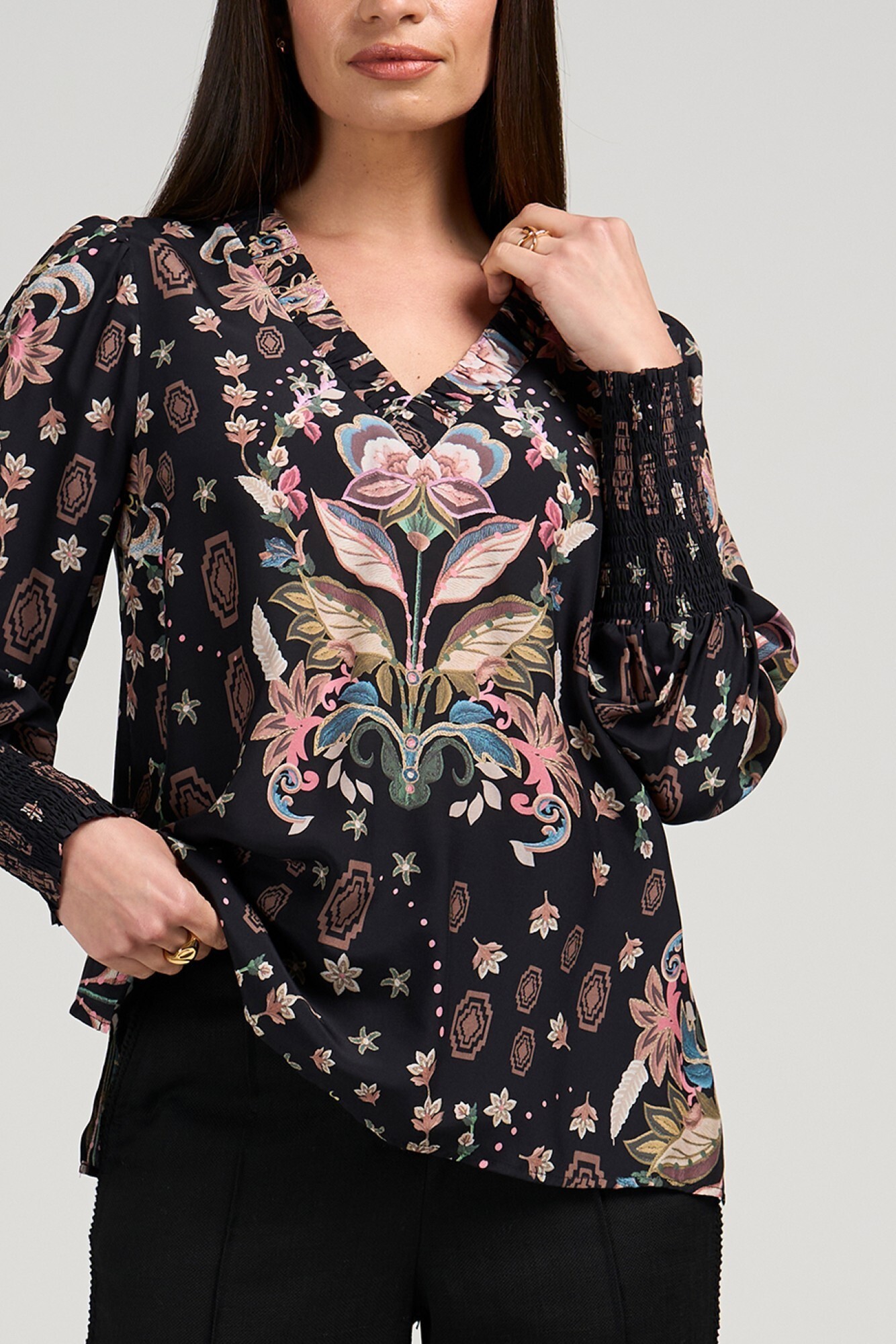 Luxurious blouse in a silk blend, with a ruched V-neckline, with blouson sleeves which gather into deep shirred elasticated cuffs for a soft, voluminous finish. 65% Rayon 35% Silk