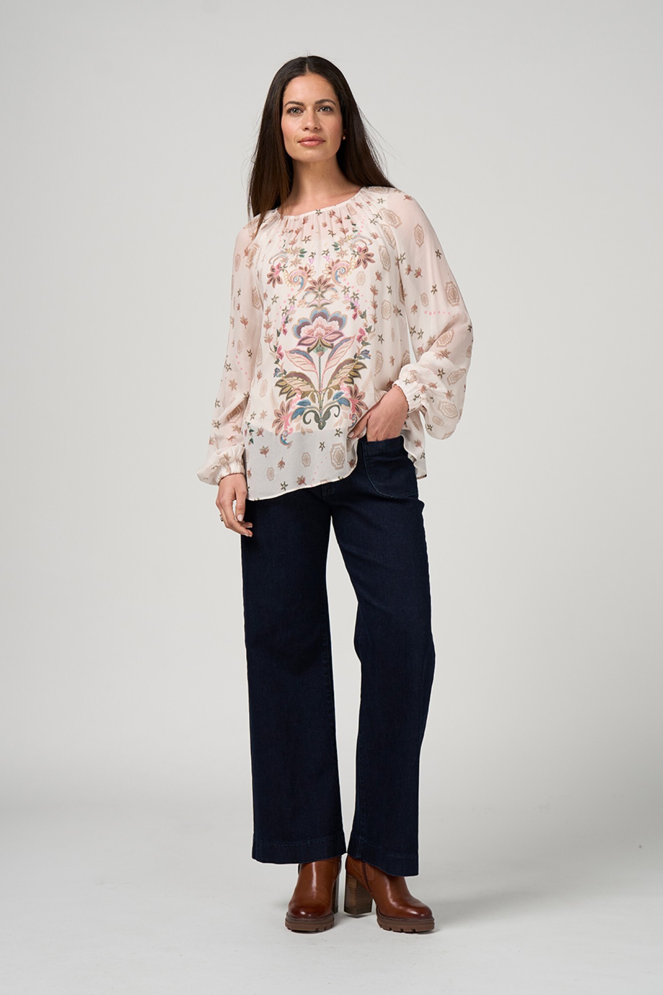 Floaty sheer blouse featuring a round neckline, with blouson sleeves with elastic cuffs. Comes with colour-matched A-line cami. 100% Viscose