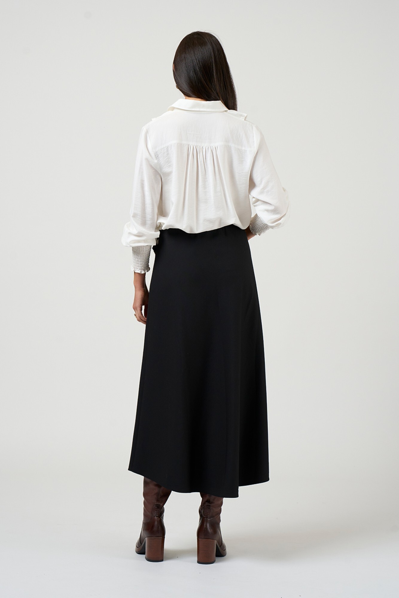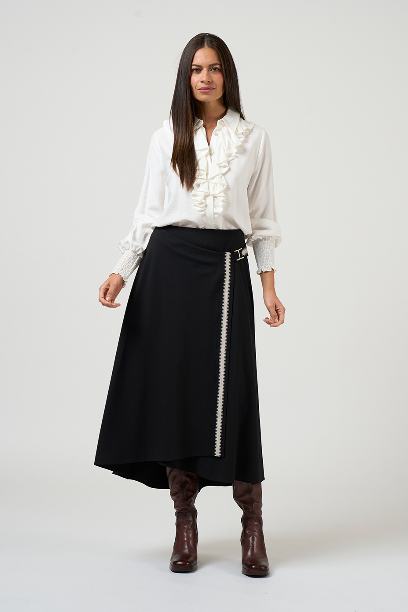 Faux wrap midi skirt featuring a side zip and elasticated back waist for comfort. Bold contrast embroidery detail highlights the front wrap edge and waist tab. Finished with a soft gold metal clasp for a sophisticated touch.