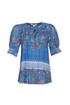 Soft textured cotton top with a border print, and a tie neckline, with shirring detail across the front, and half elasticated smocked sleeves.