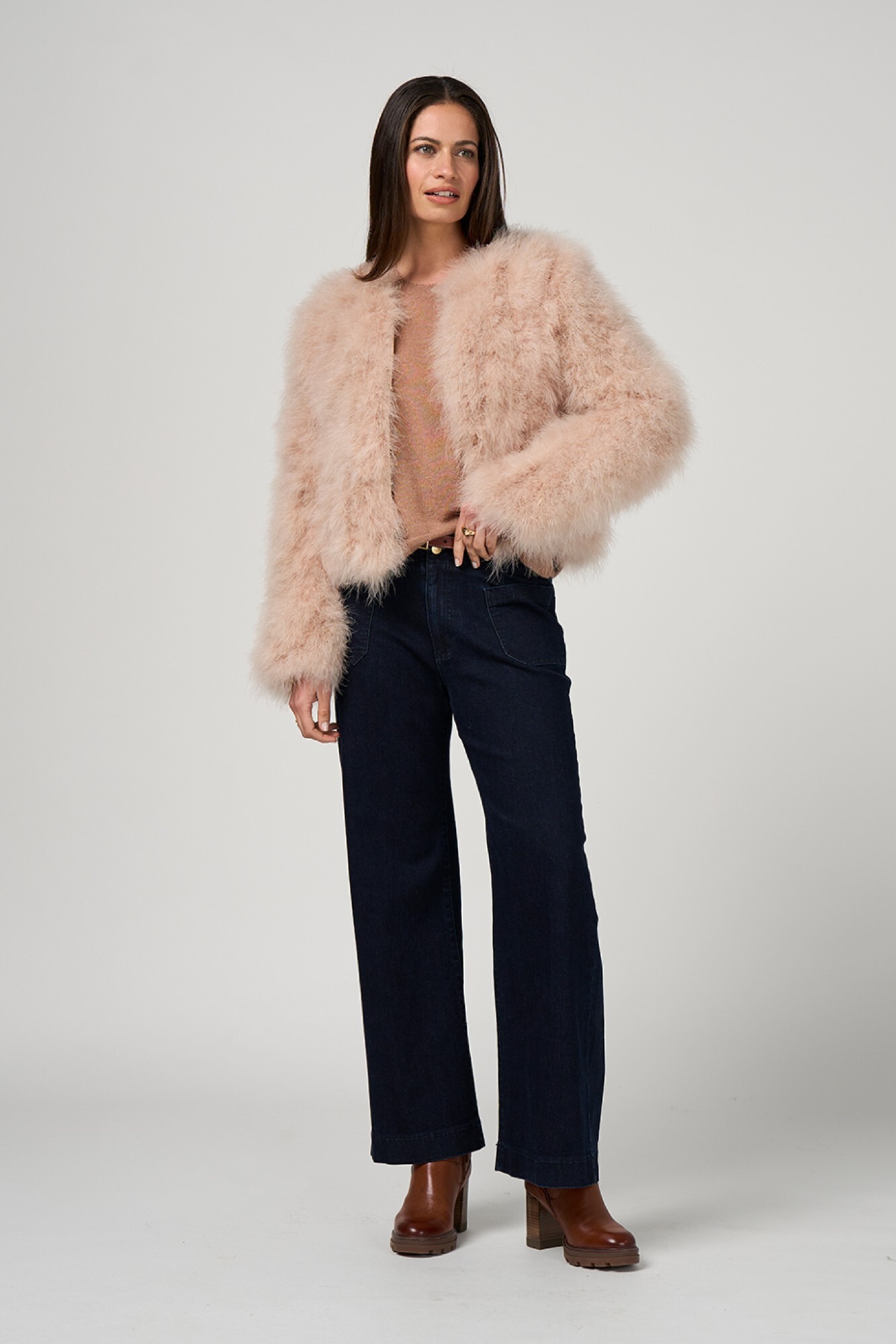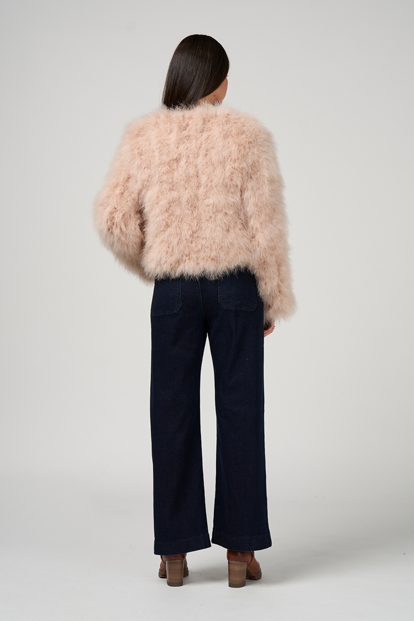 Ethically sourced turkey feather cropped jacket,  featuring a colour-matched hook-and-eye closure for a seamless finish. Fully lined.