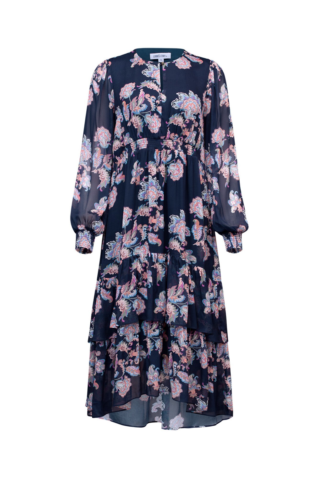 Floaty dress, with a keyhole neckline which can open to a V-neck style. With blouson sleeves and layered hem tiers, featuring shirring detail under the bust, with shirred elasticated cuffs.  Fully lined. 100% Viscose