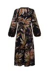 Printed dress featuring a flat collar with a centre front tie neckline, and elasticated cuffs, with elastic at the back waist to create a flattering fit.  50% Viscose 50% Rayon