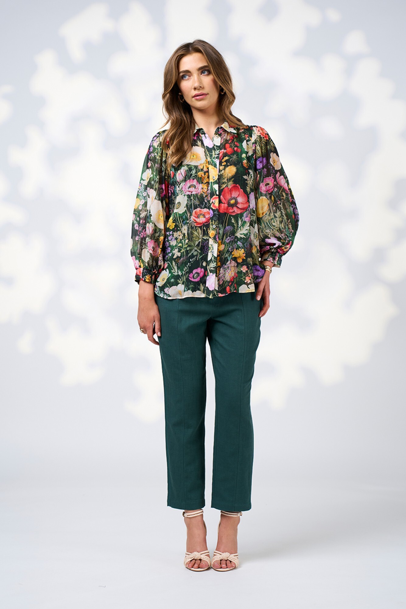 Floaty sheer button-through blouse with a soft collar, shirt tail hemline and gathered lantern sleeves, with half shirred cuffs. Printed A-line cami included.