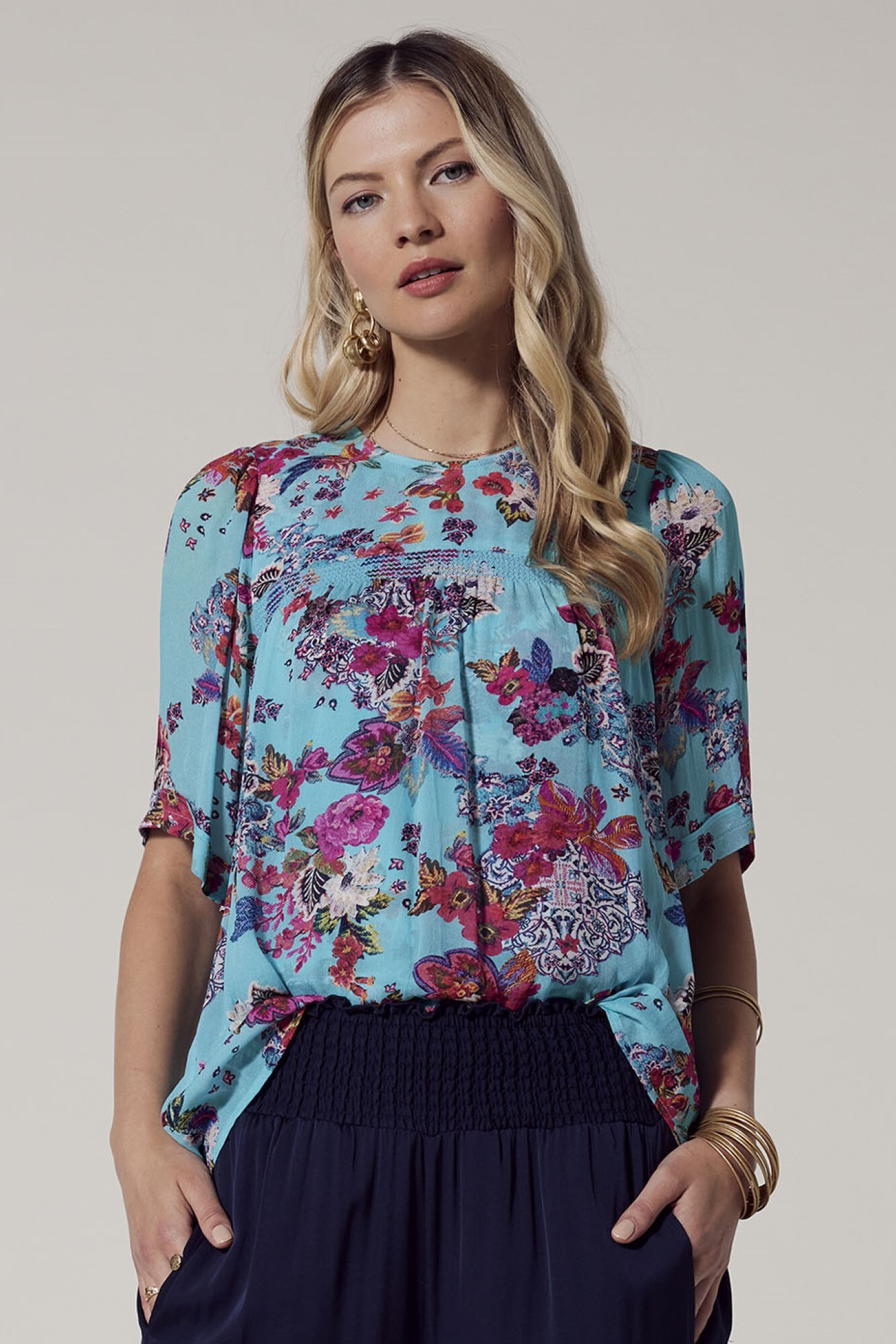 Sheer top with a crew neckline and elasticated smocking detail across the front to create a floaty silhouette. Featuring back neck split with button. Includes matching printed A-line cami.