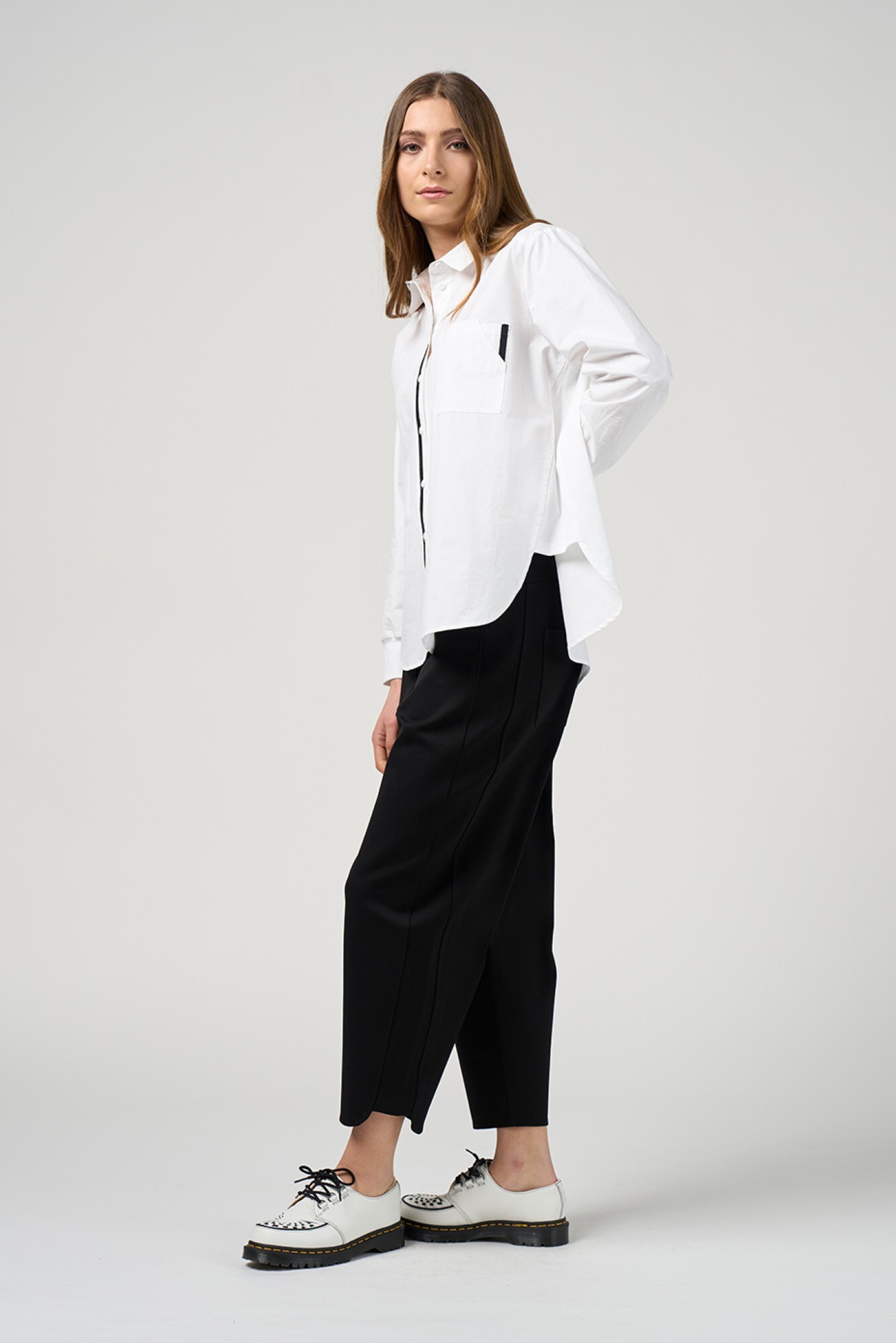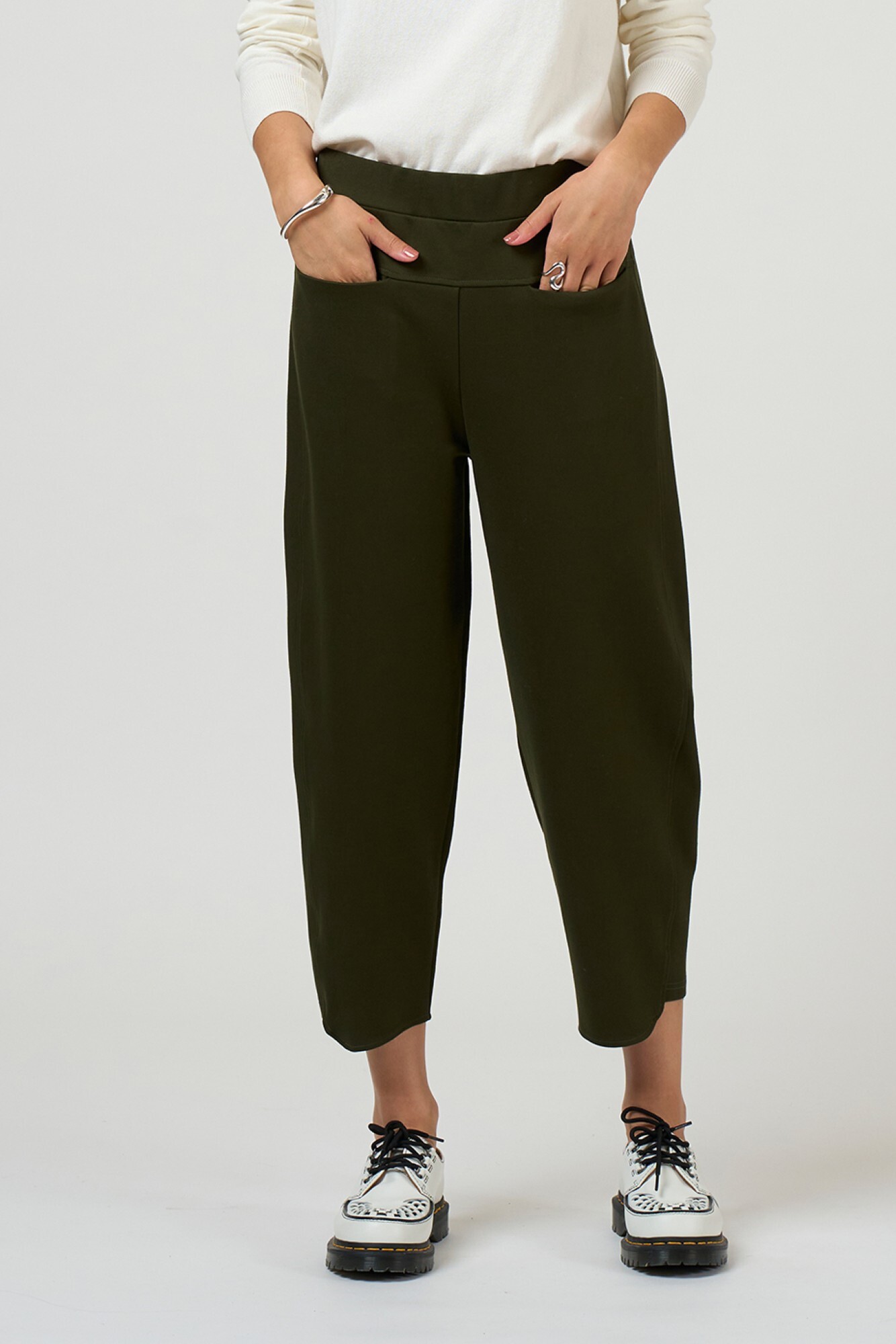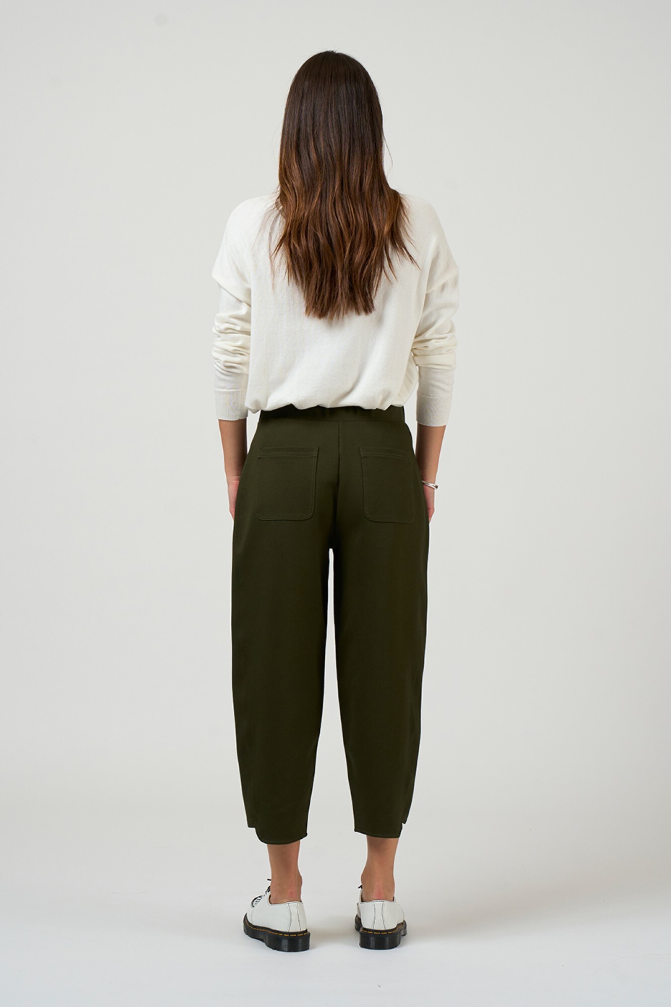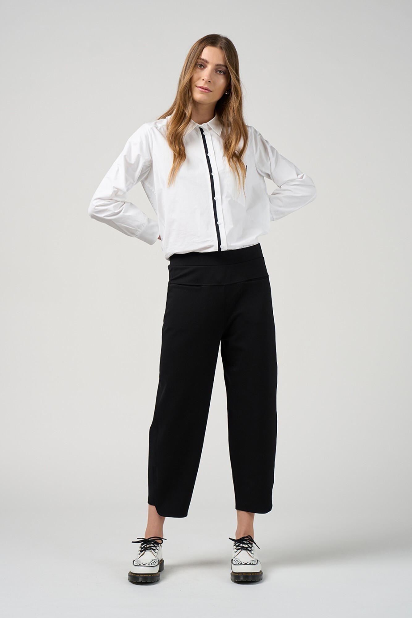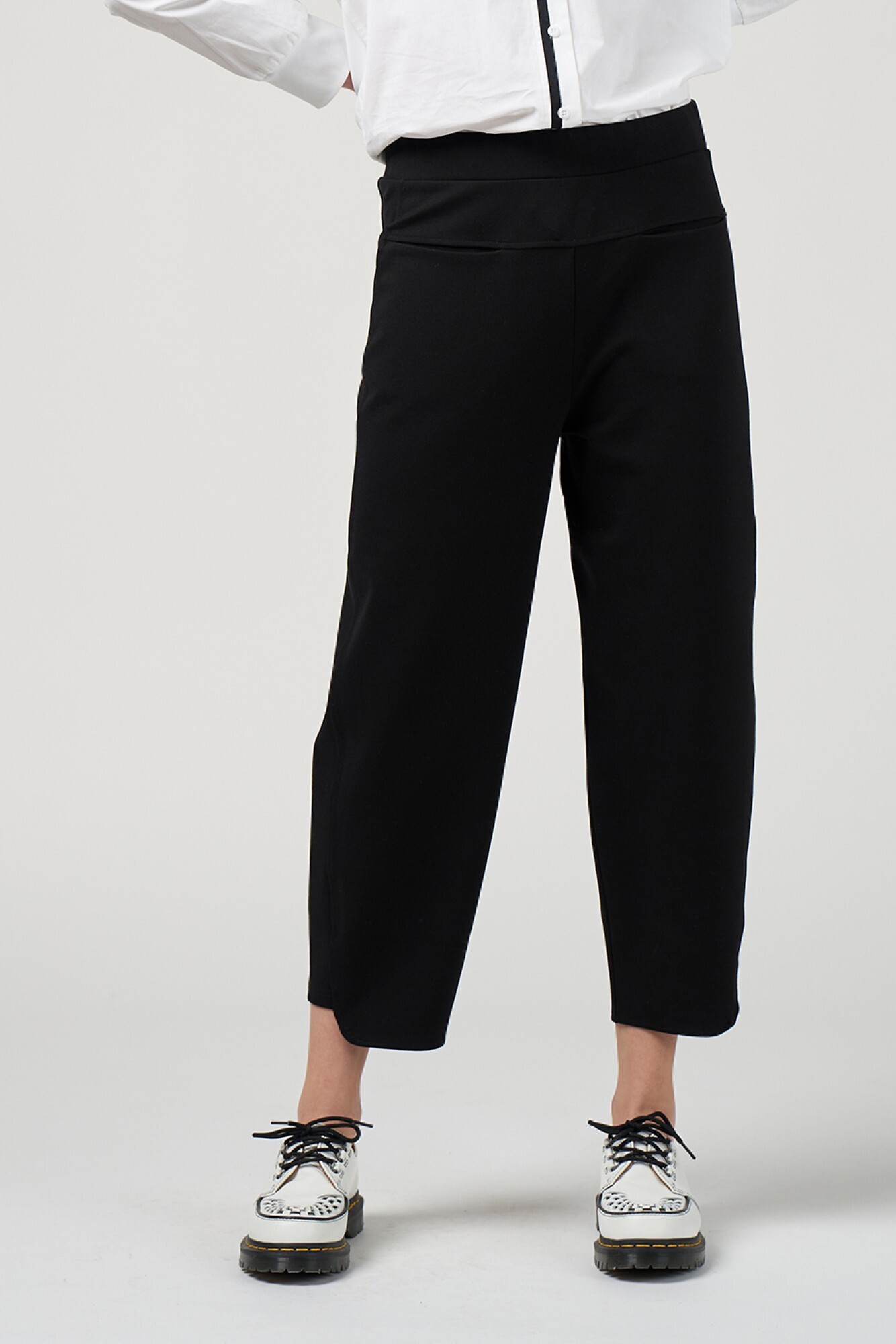 Pull-on ponte pant with a tulip style shape, featuring cropped side panel inserts and front pockets into the yoke seam for a sleek, modern look.