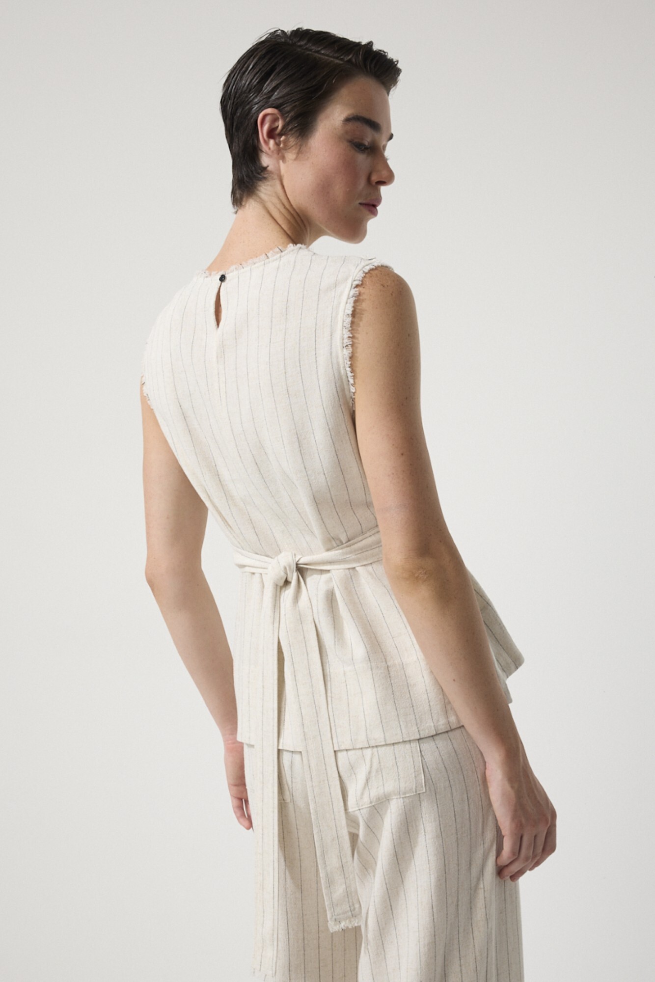 The Stone Stripe Shirt is a sleeveless summer staple with considered detailing. Made from lightweight viscose with fine yarn-dyed stripes, it features raw-edge trim at the neckline and armholes for a subtle edge. A self-fabric waist tie threads through chain loops, allowing you to wear it loose or gently cinched for shape. The round neck fastens with a button loop at the back, keeping the finish minimal and clean. Pair it with wide-leg pants or the coordinating Stone Stripe Pant for an easy, modern outfit that feels fresh and stylish. 78% VISCOSE / 20% LINEN / 2% TENCEL